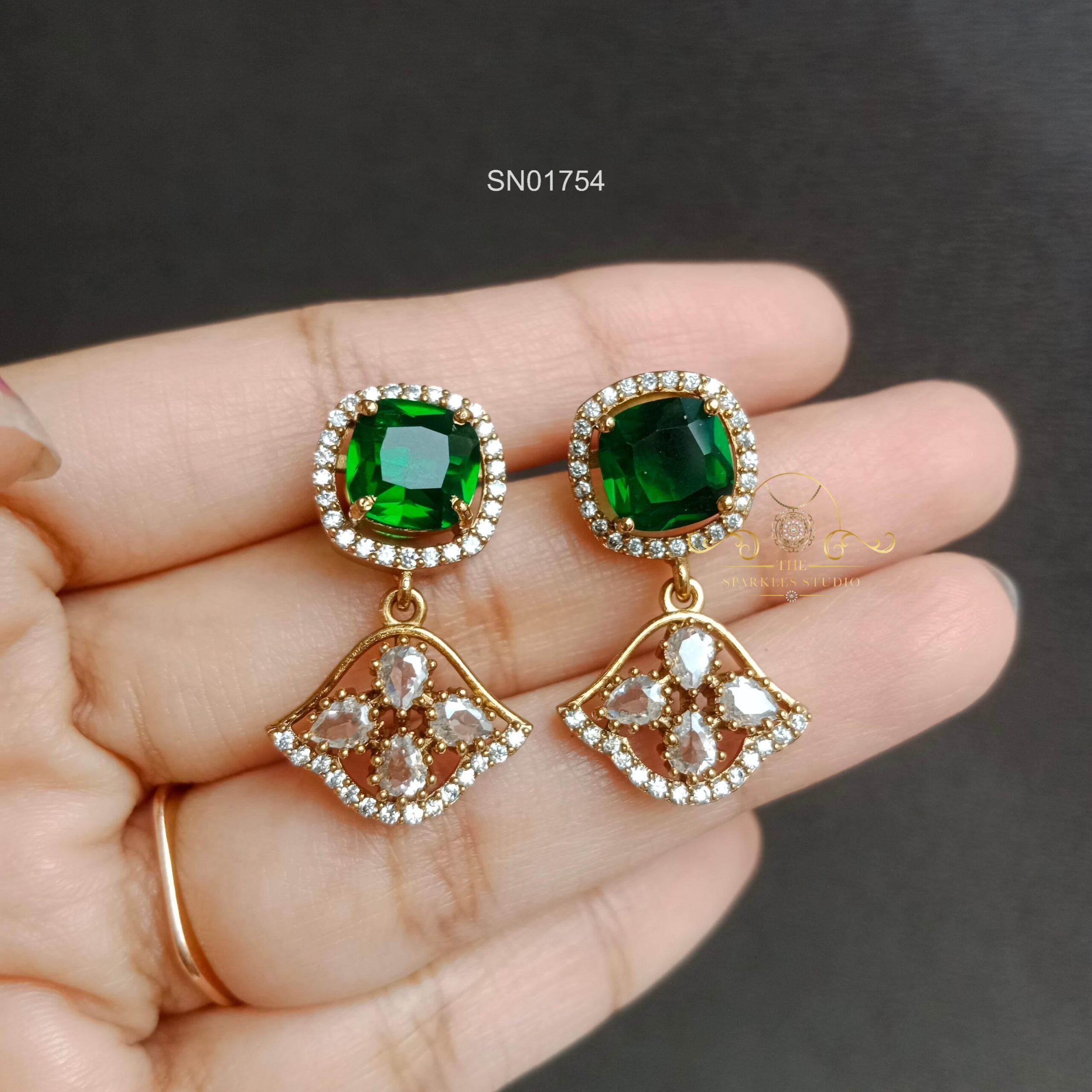 This AD drops with emerald stone pendant necklace exudes refined elegance, featuring sparkling AD stones and a striking emerald centerpiece, making it a graceful choice for festive wear and special celebrations.