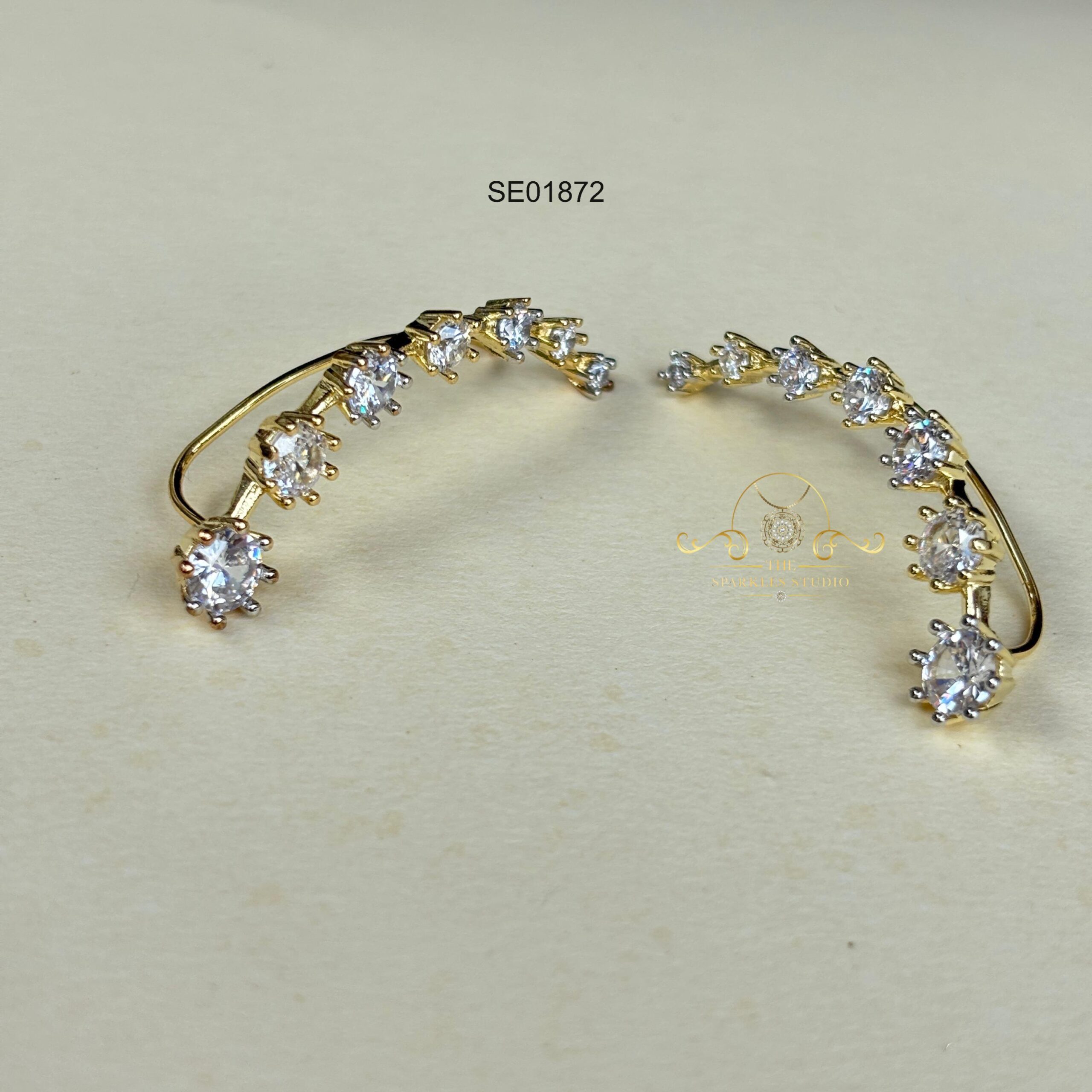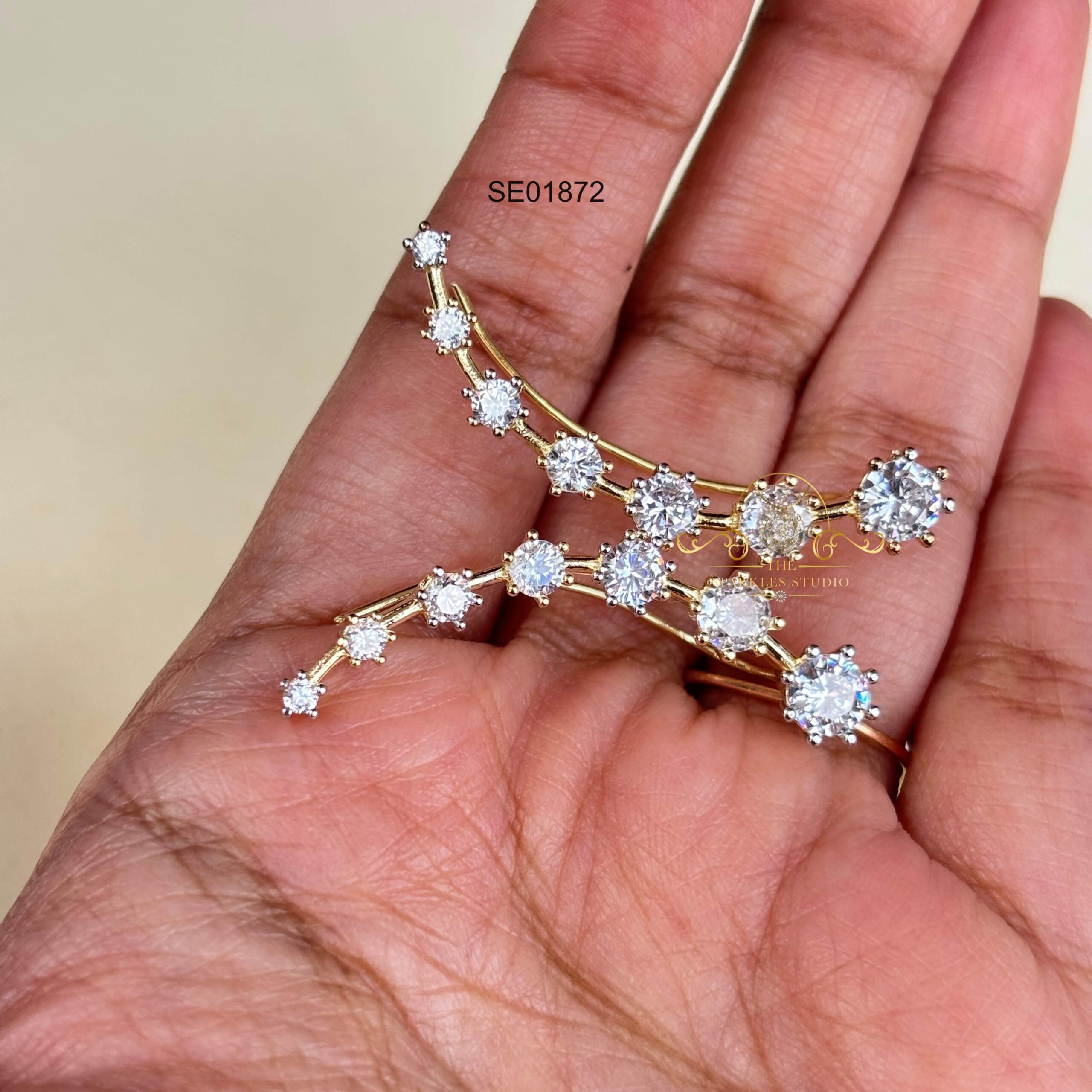 AD ear cuffs featuring sparkling white stones and a sleek contemporary curve. Perfect for sarees, gowns, and indo-fusion looks, adding modern glamour, subtle drama, and effortless statement style without heavy earrings.