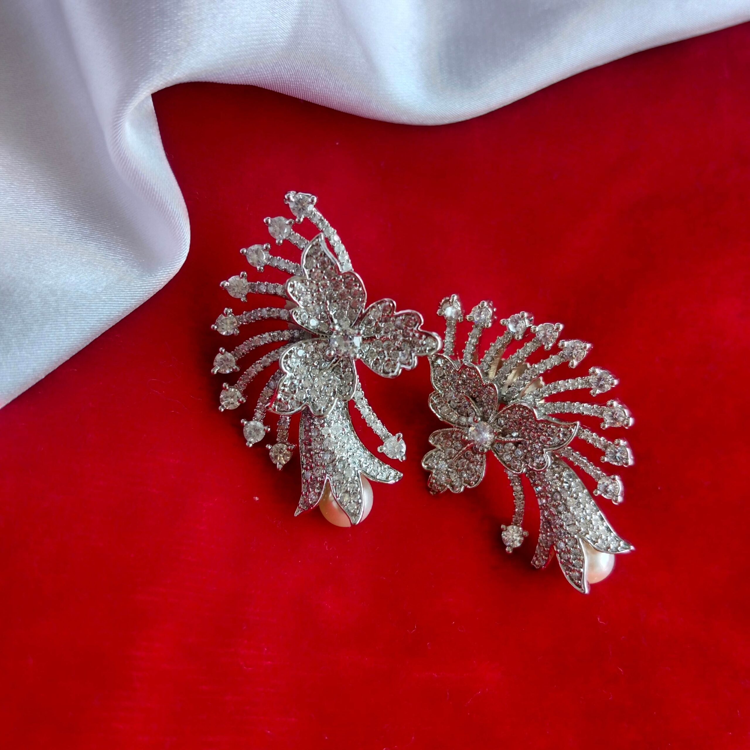 Adorn yourself with the delicate beauty of these AD flower earrings. Each earring features intricate petals adorned with sparkling artificial diamonds, forming a captivating floral design. Perfect for adding a touch of feminine elegance to any outfit, these earrings are sure to make you blossom with style.