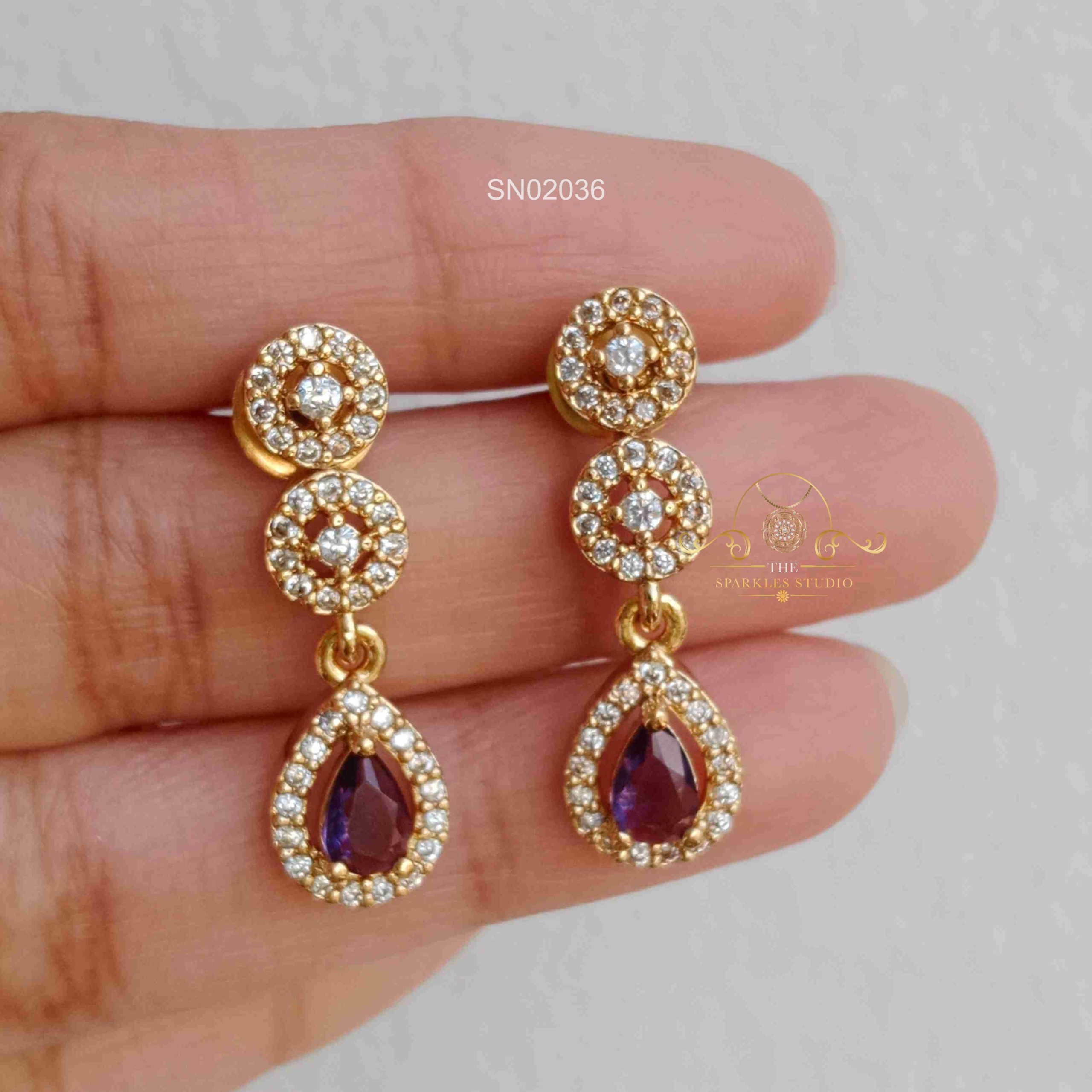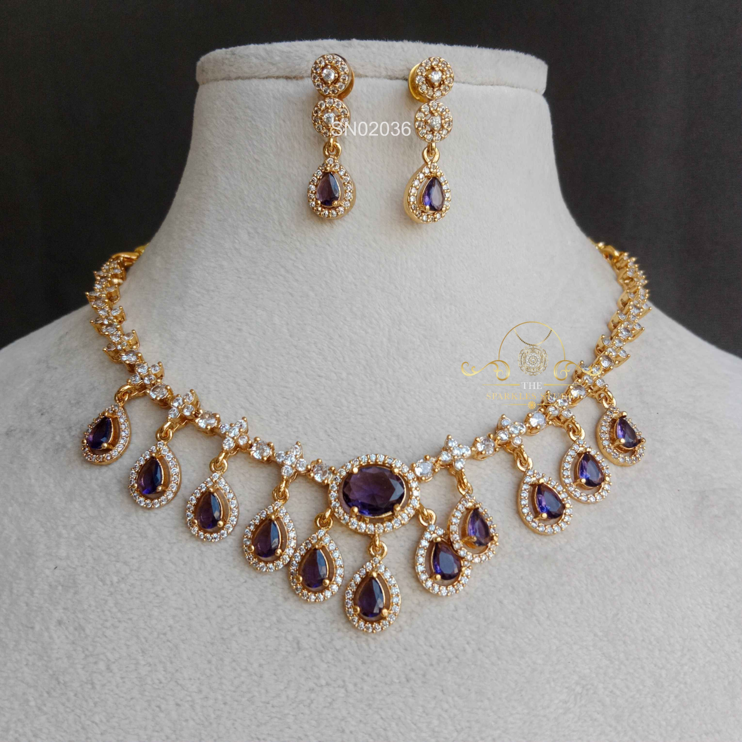AD Purple Drops Necklace sparkles with finely set American diamonds paired with elegant purple drop accents. Designed to add a touch of glamour, this statement piece beautifully enhances party wear, festive outfits, and special occasions.