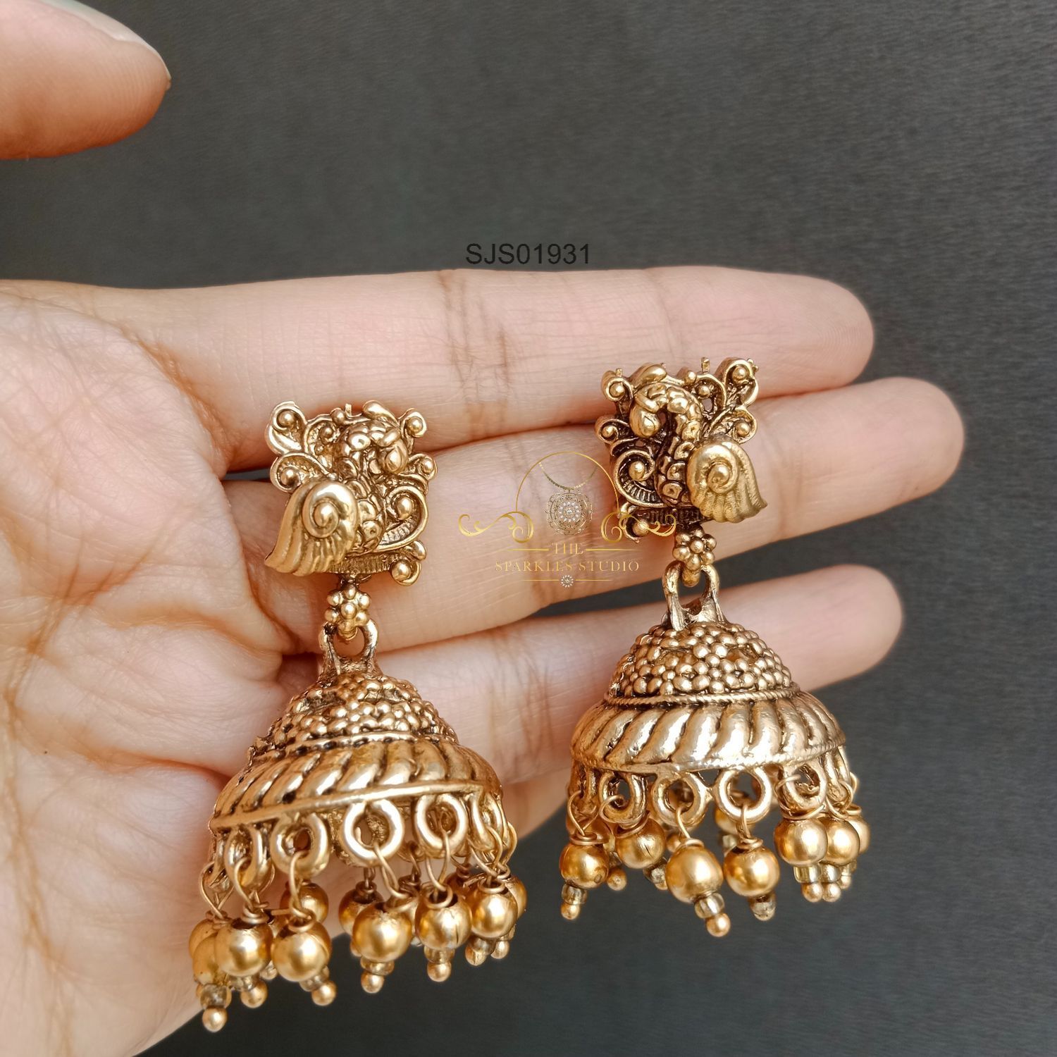 The Pretty Peacock Jhumki with Red and Green Stones is a charming pair of earrings inspired by the graceful peacock. These jhumkis feature intricate designs with colorful red and green stones, reminiscent of the vibrant plumage of a peacock.