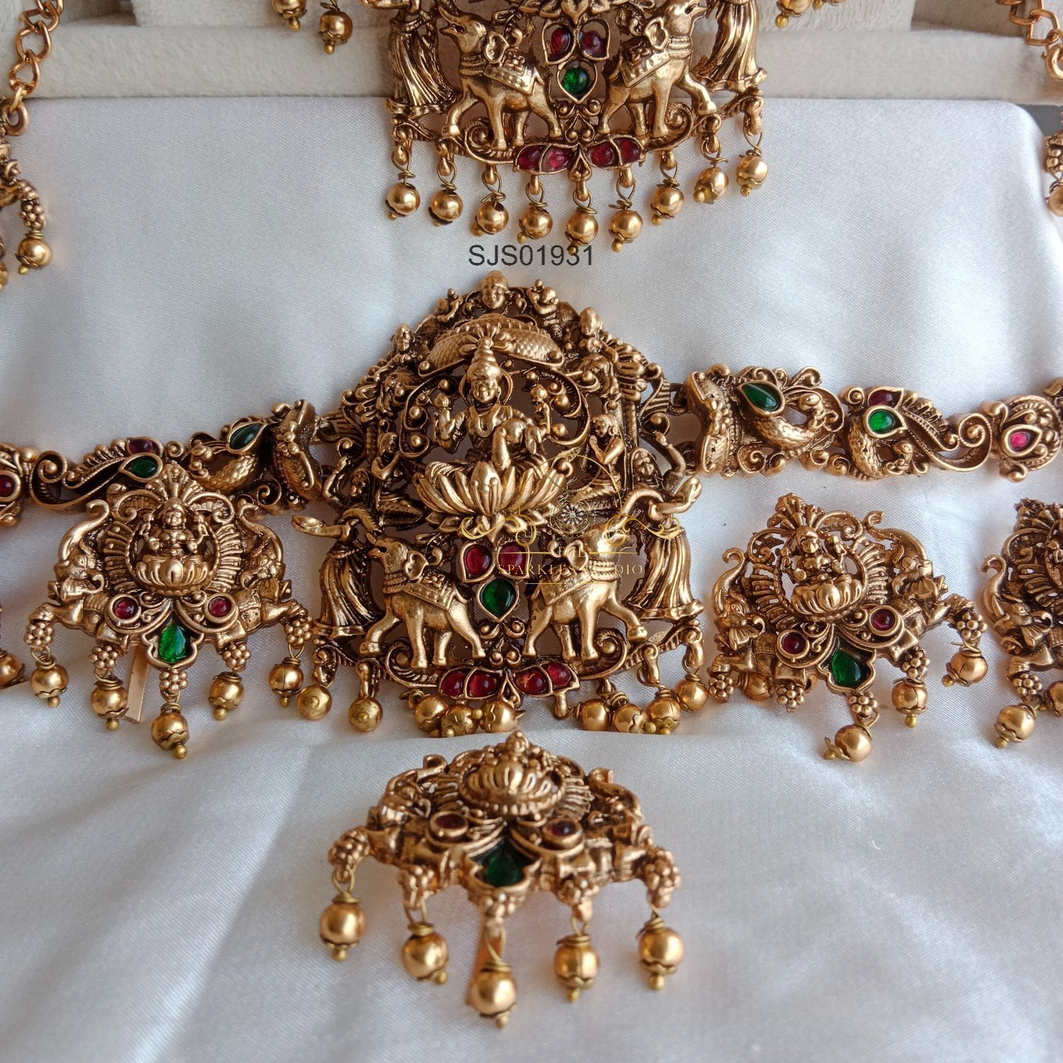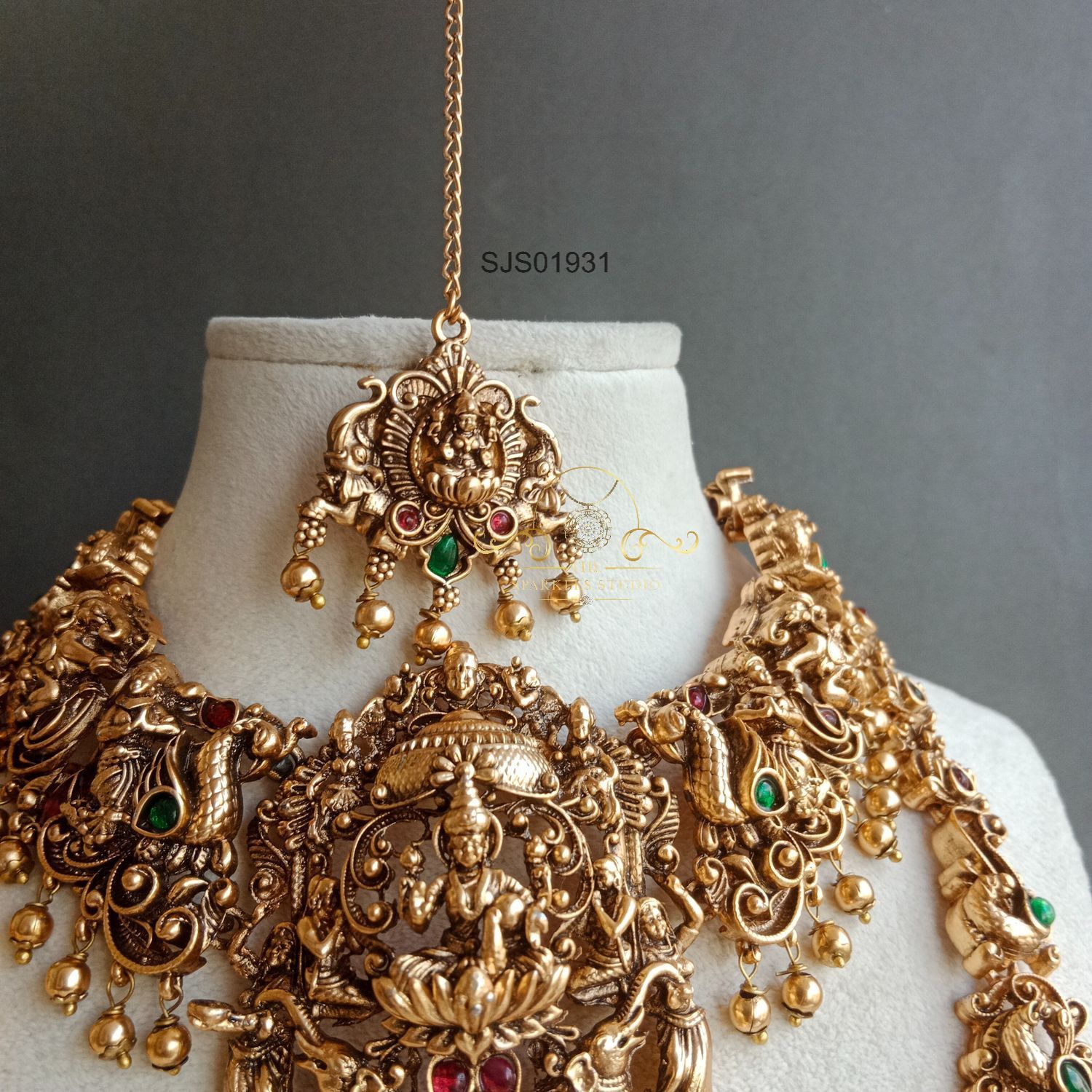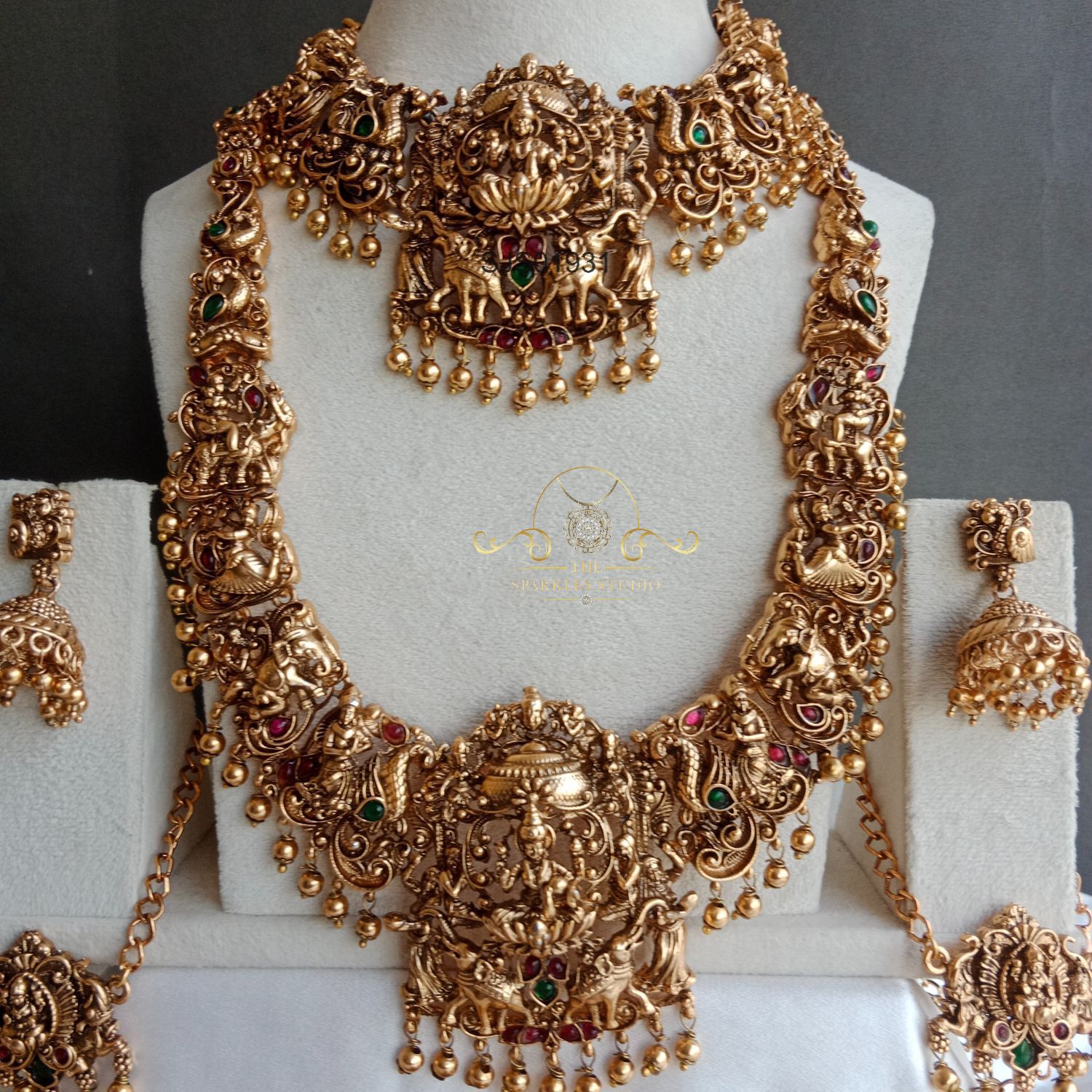 A grand antique bridal jewellery set adorned with intricate temple motifs, kemp stones, and rich gold detailing. Designed for timeless elegance, it brings divine charm and traditional opulence to every bridal look