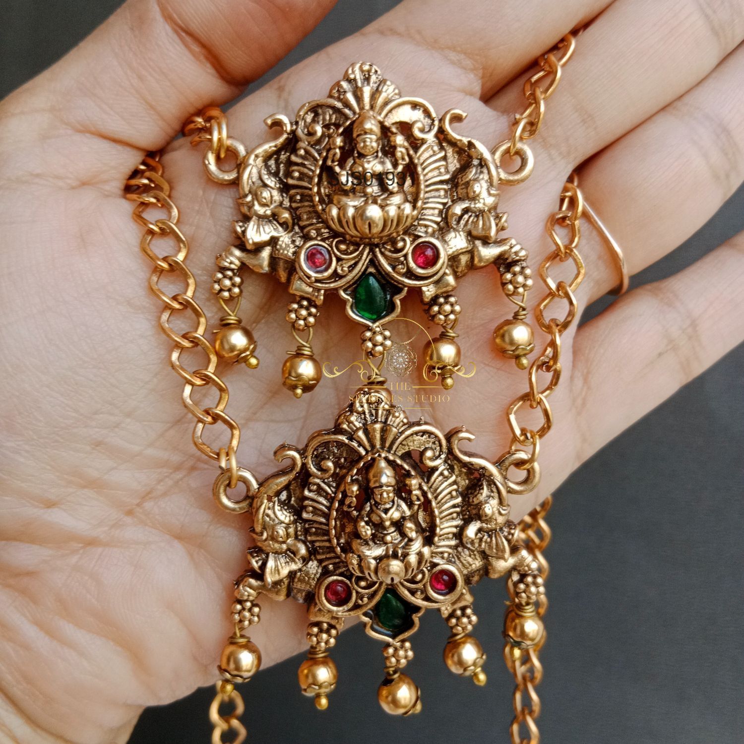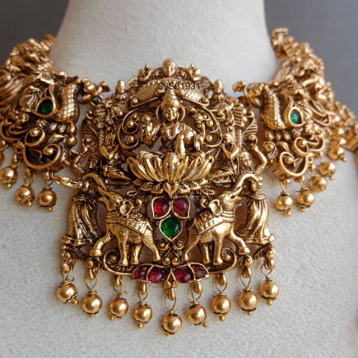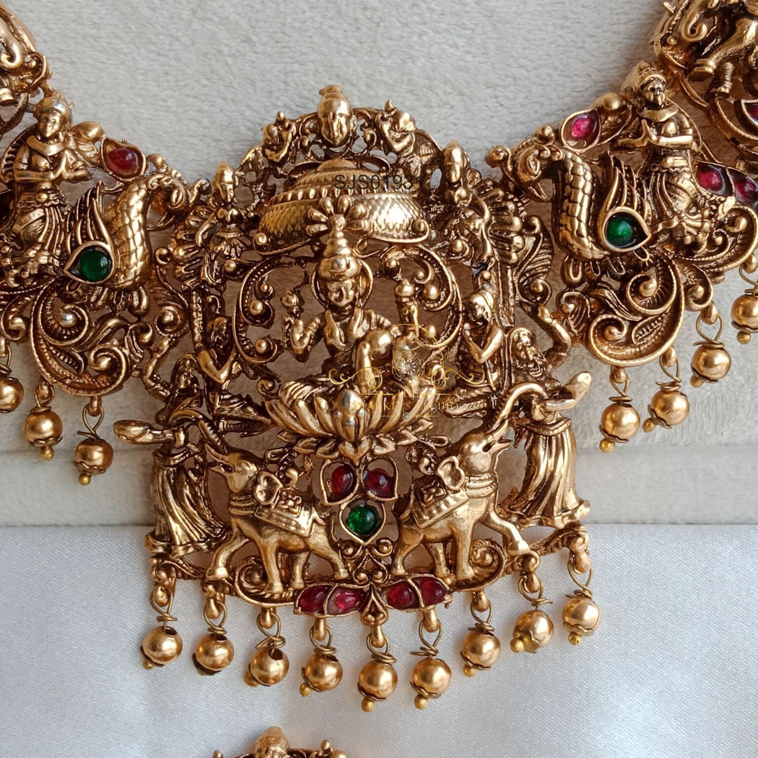 A grand antique bridal jewellery set adorned with intricate temple motifs, kemp stones, and rich gold detailing. Designed for timeless elegance, it brings divine charm and traditional opulence to every bridal look