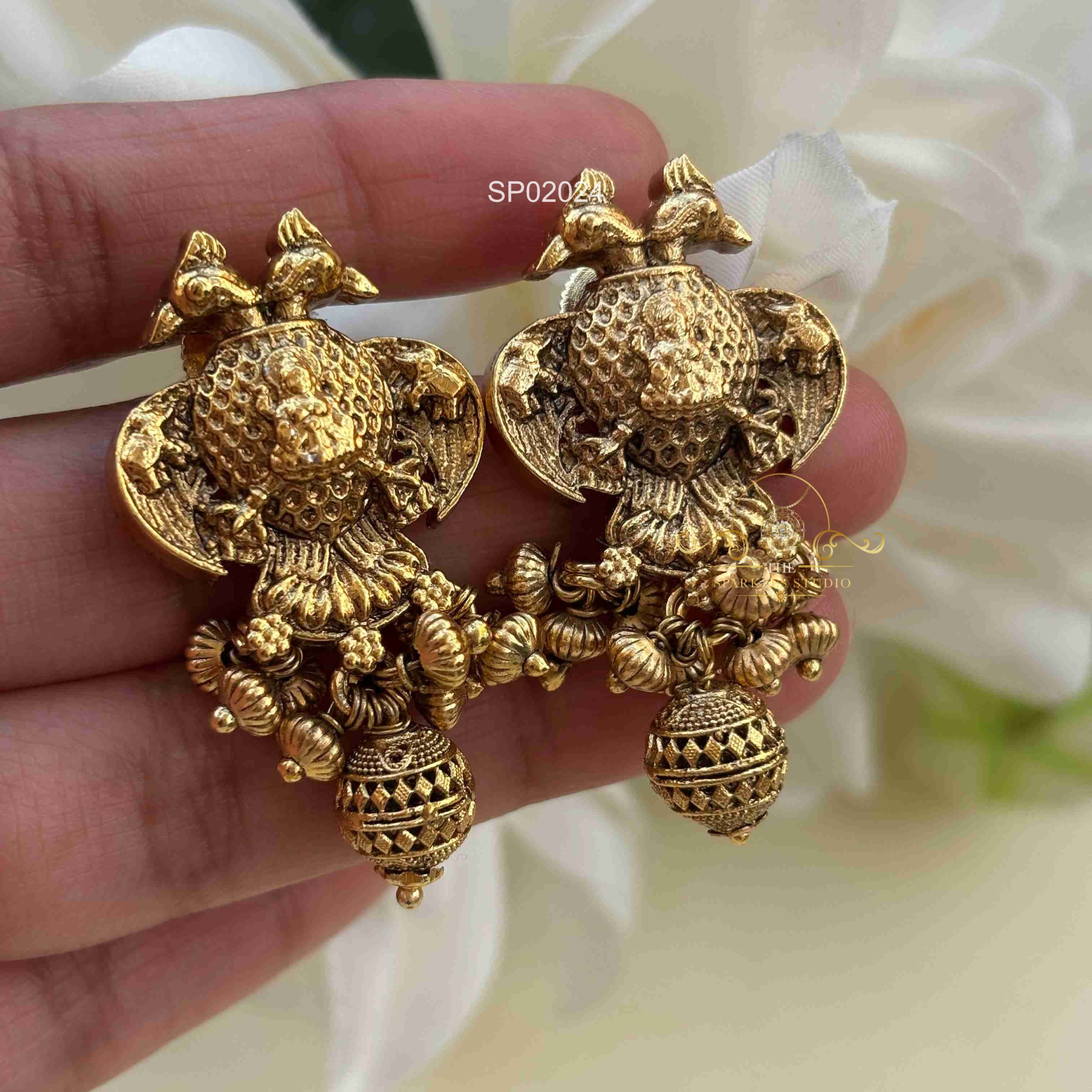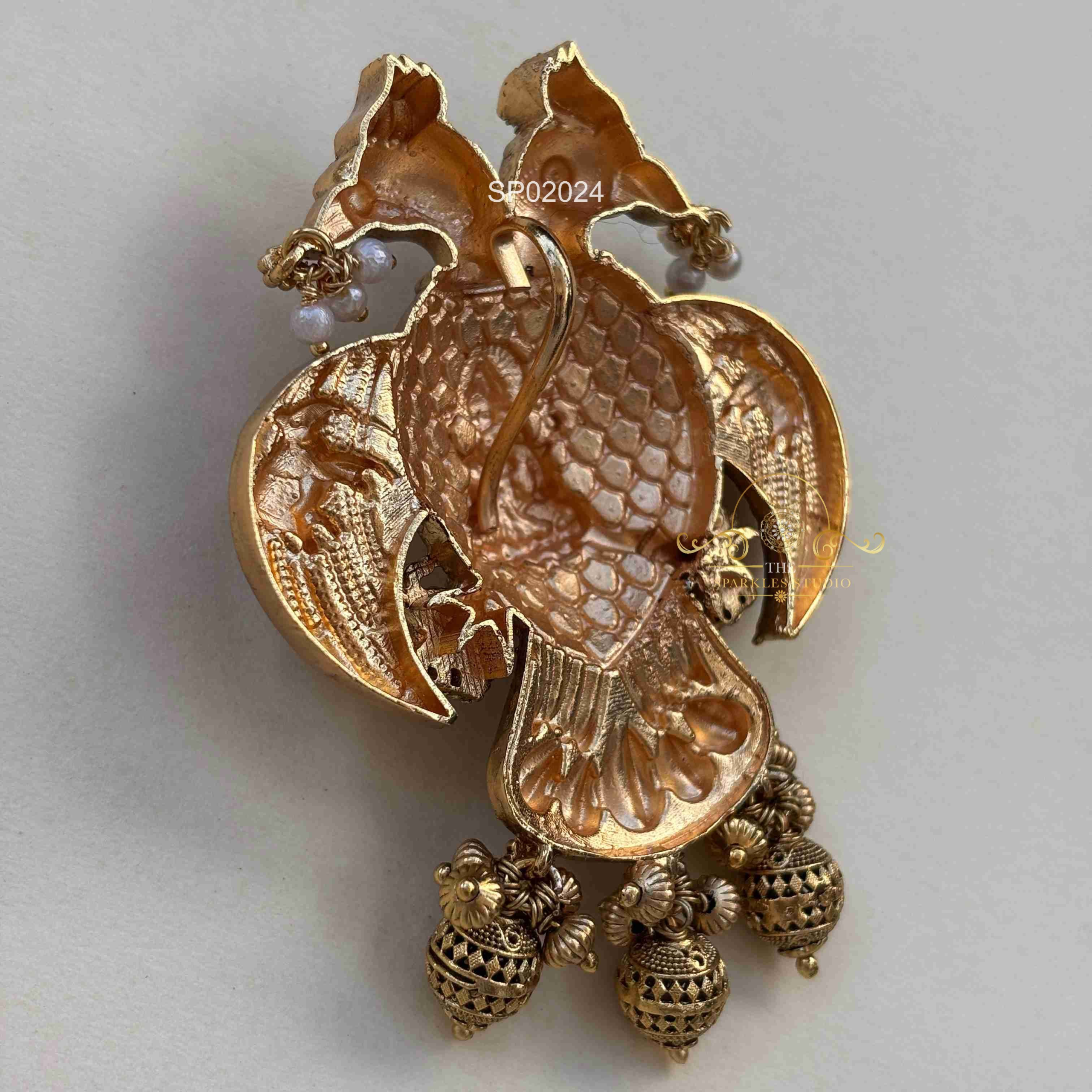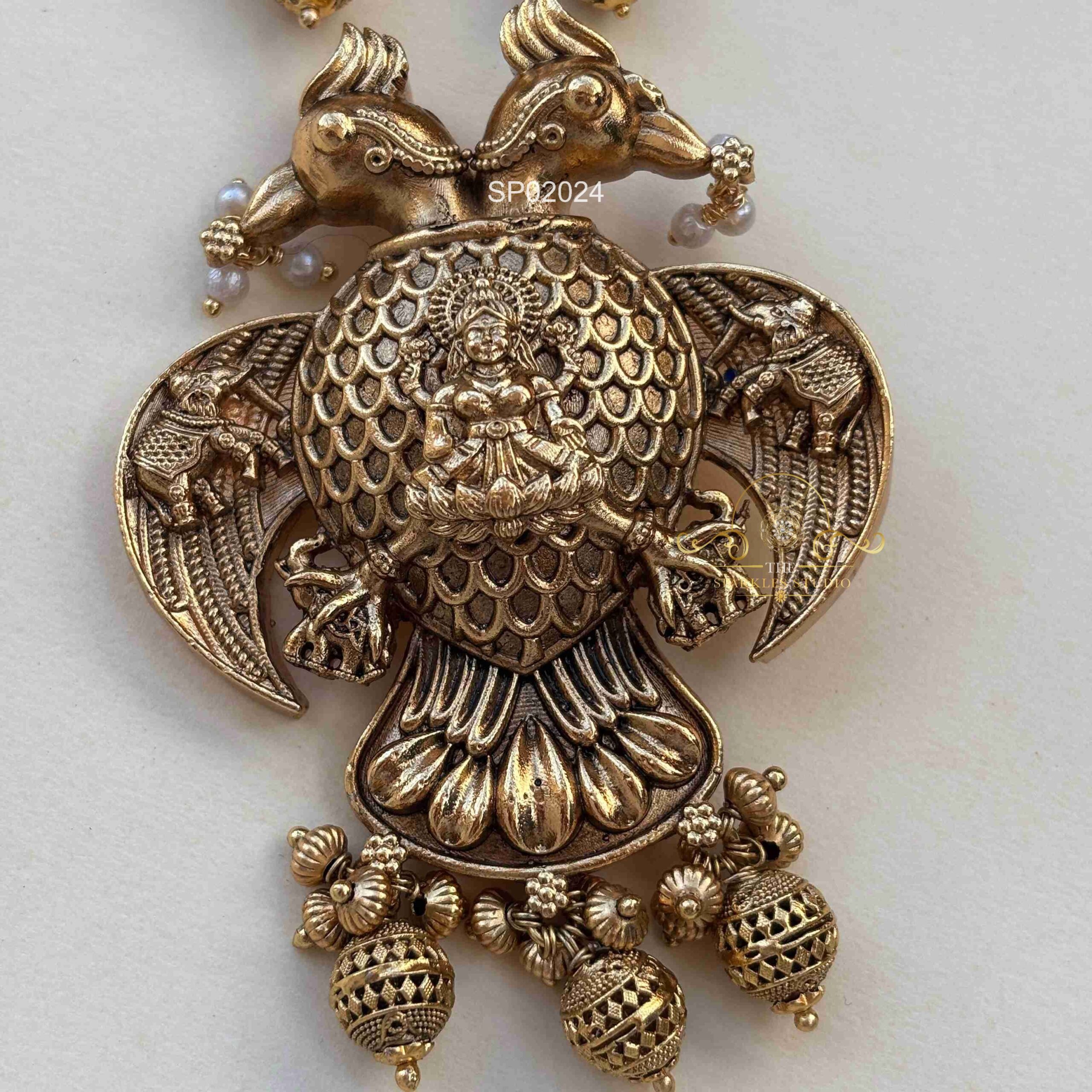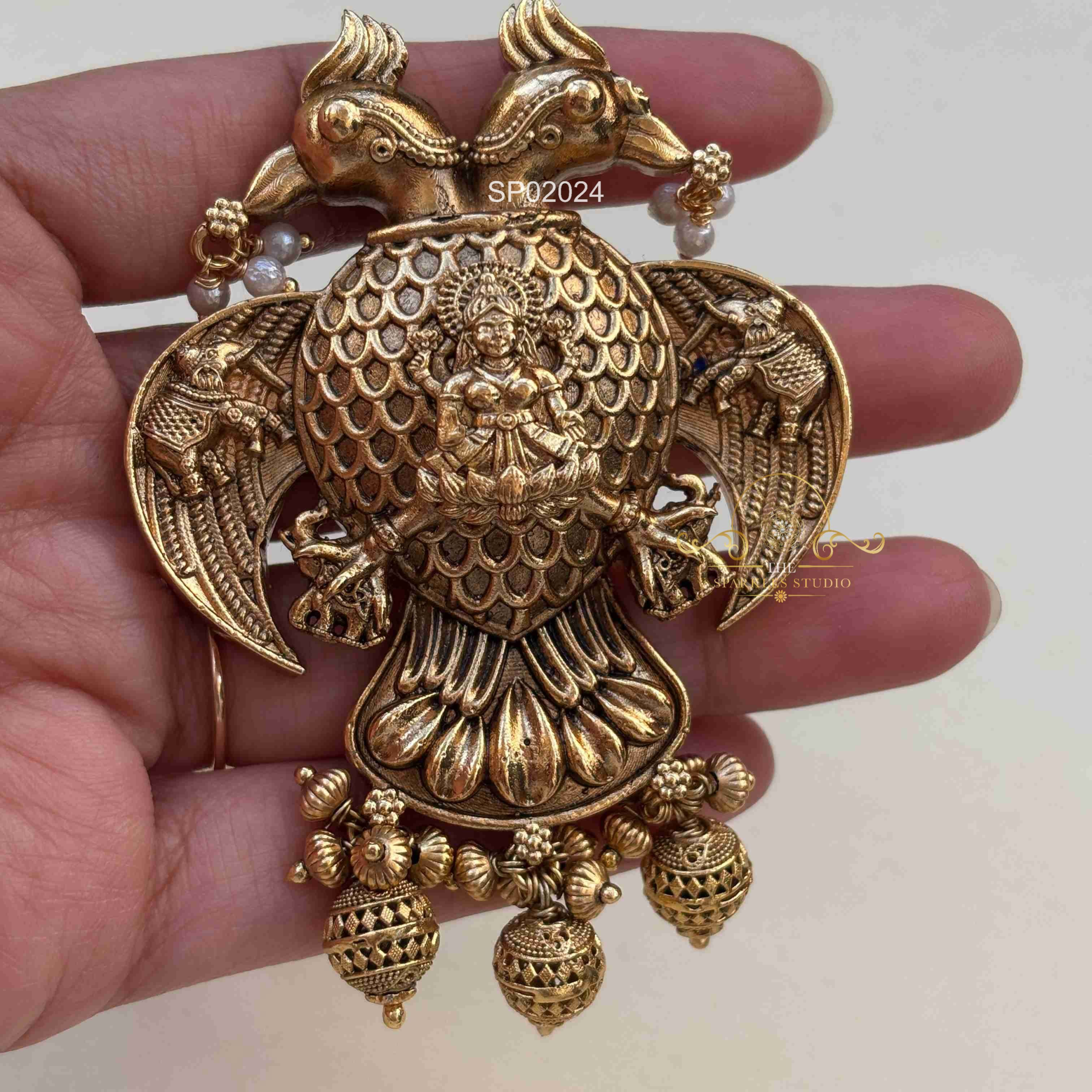 Antique Ganda Berunda Pendant showcases the majestic two-headed mythical bird motif, symbolizing power and protection. Crafted in rich antique finish with intricate detailing, this statement pendant adds bold heritage charm to traditional and festive looks.