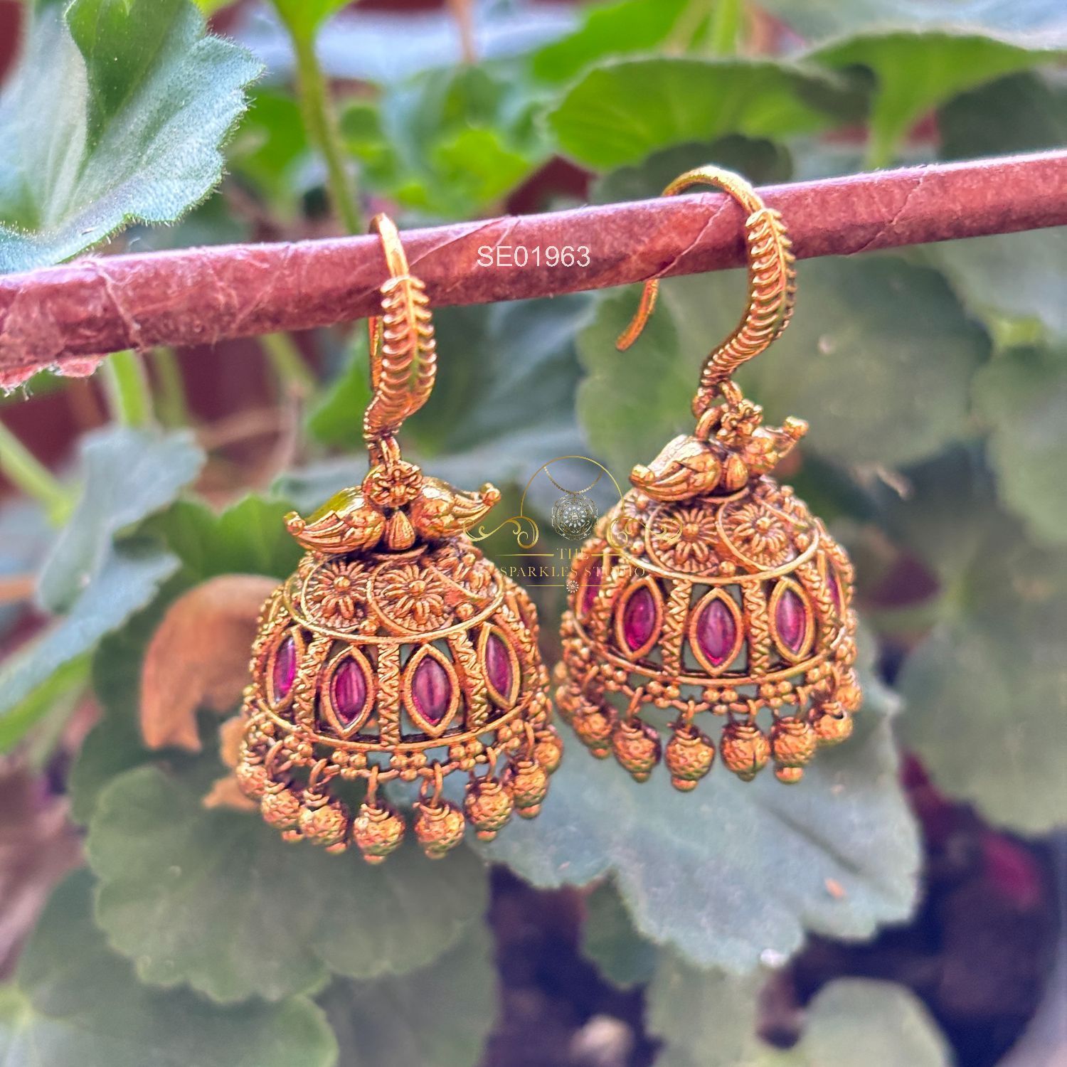 Adorn yourself with the perfect blend of elegance and tradition in our Stone Stud with Peacock Jhumki Down earrings. Meticulously crafted, these earrings feature a stone-studded stud complemented by a charming peacock jhumki, creating a unique and graceful accessory.