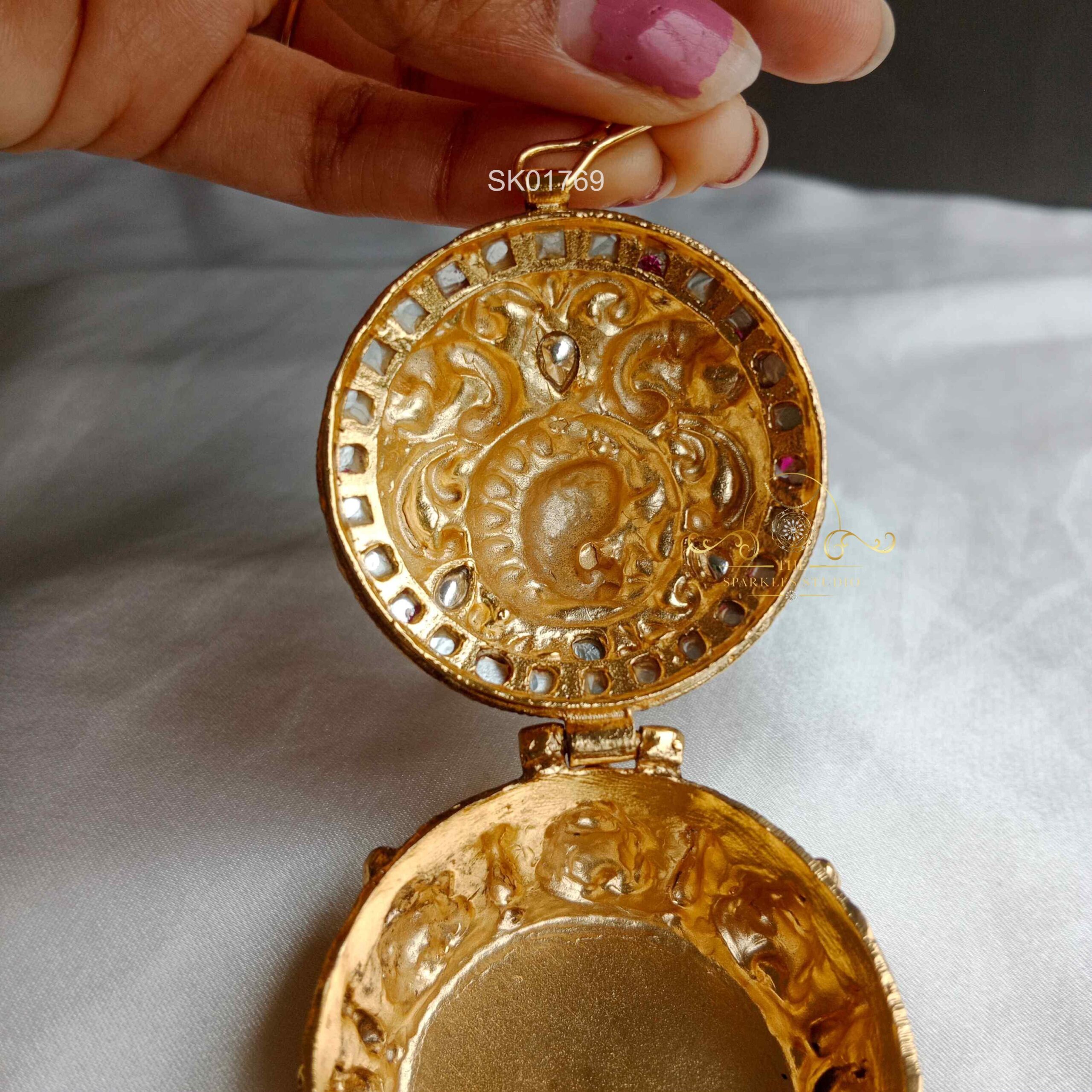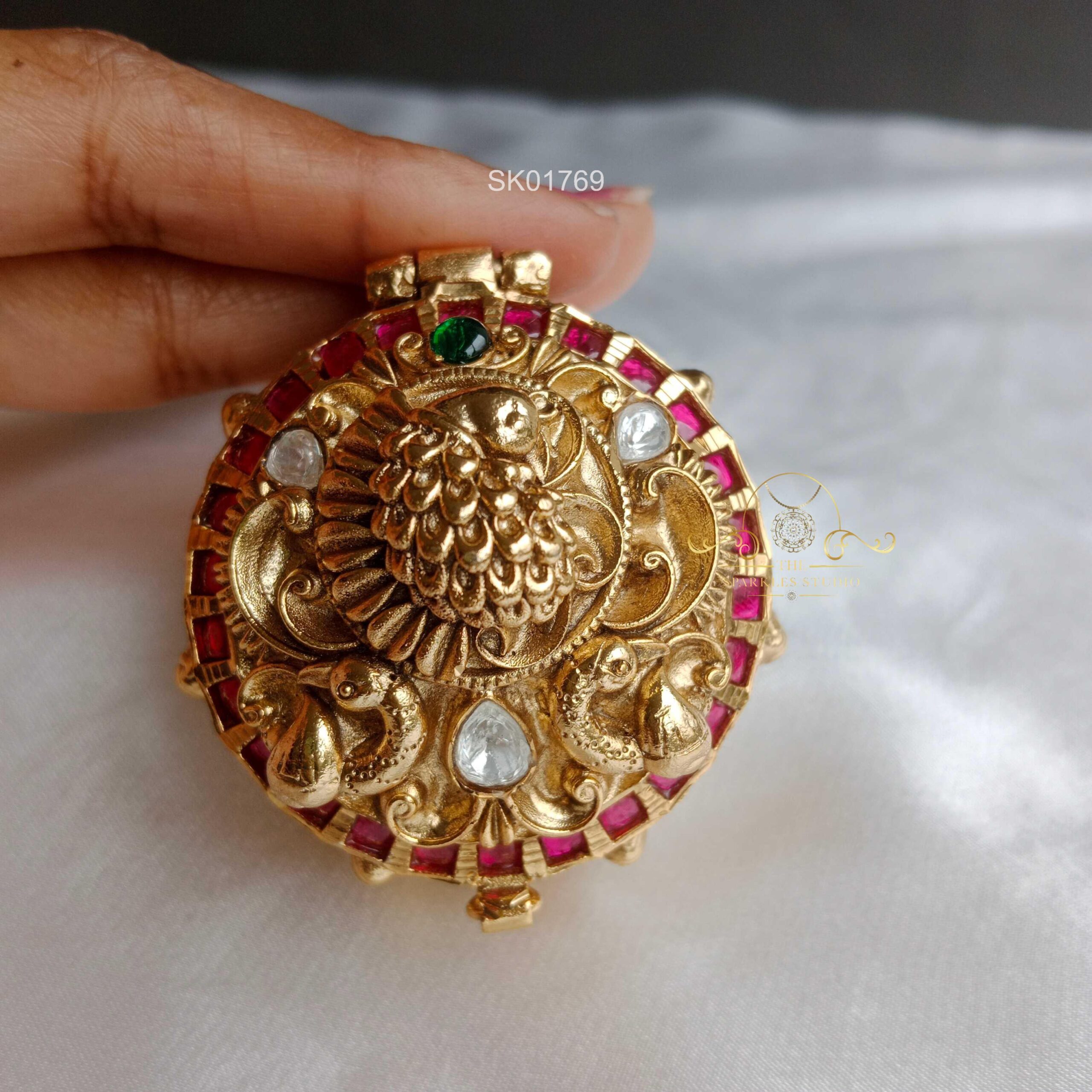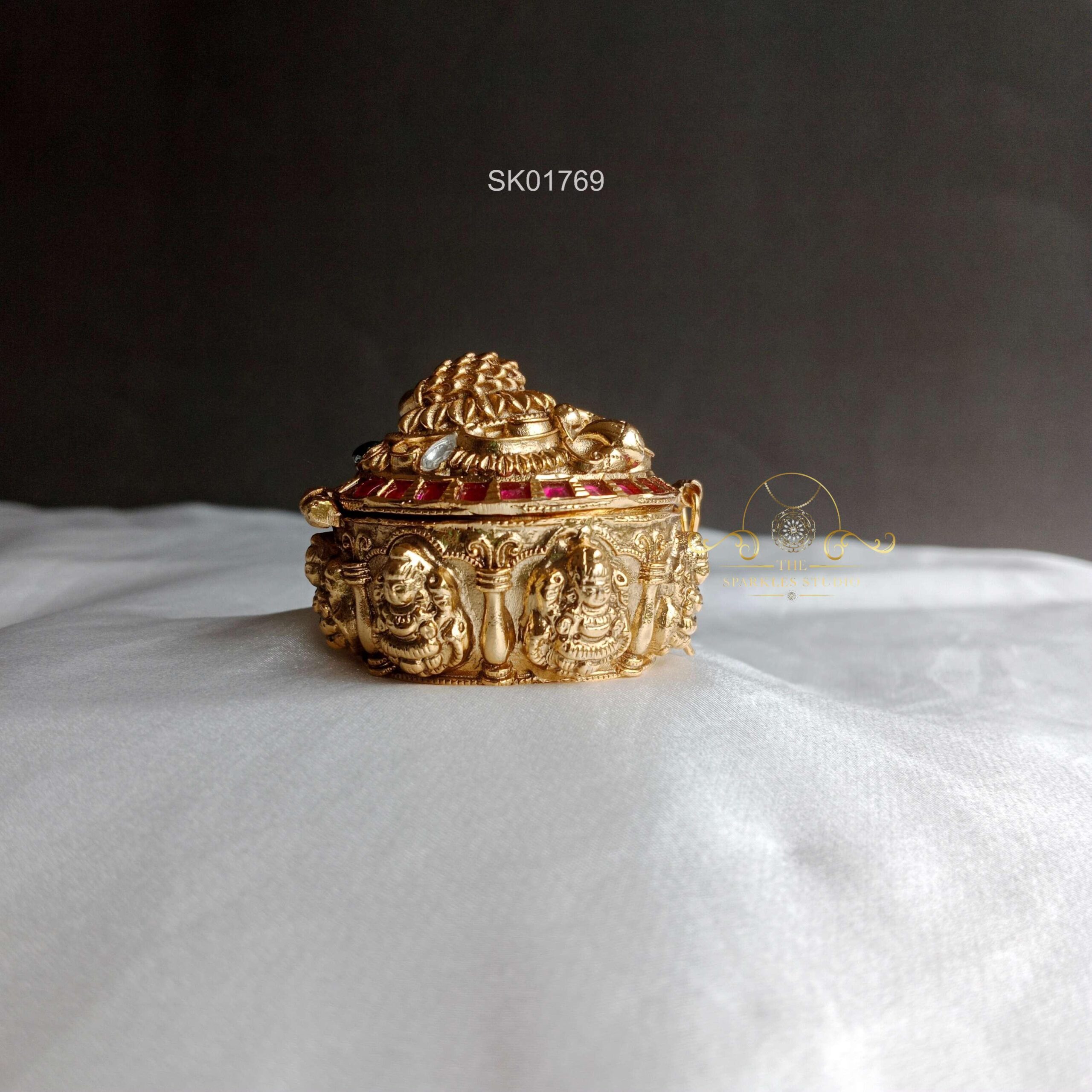 The Antique Massonite Kumkum Box is a stunning blend of tradition and elegance. Designed with intricate antique detailing and shimmering massonite stones, it adds a divine charm, making rituals more graceful and auspicious.