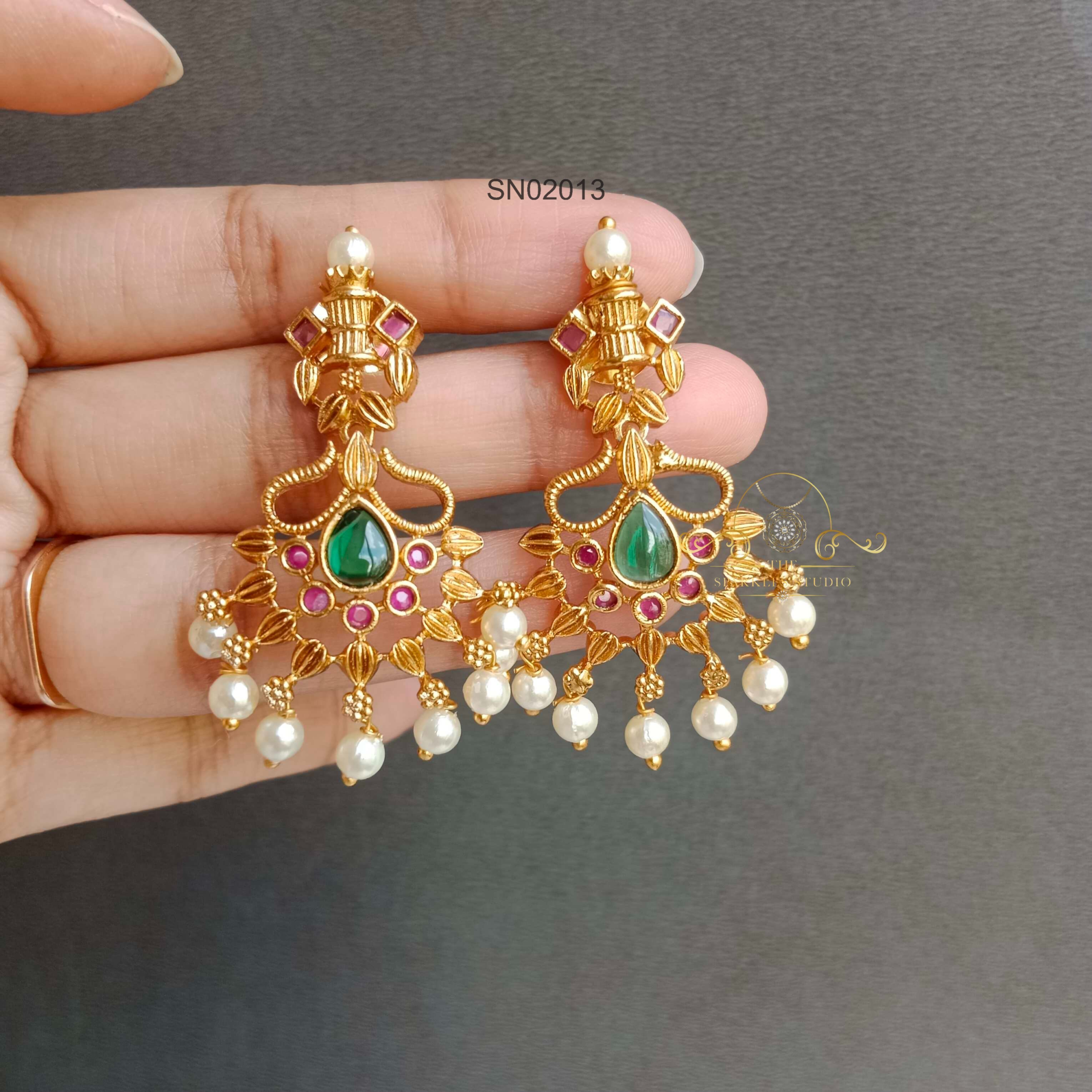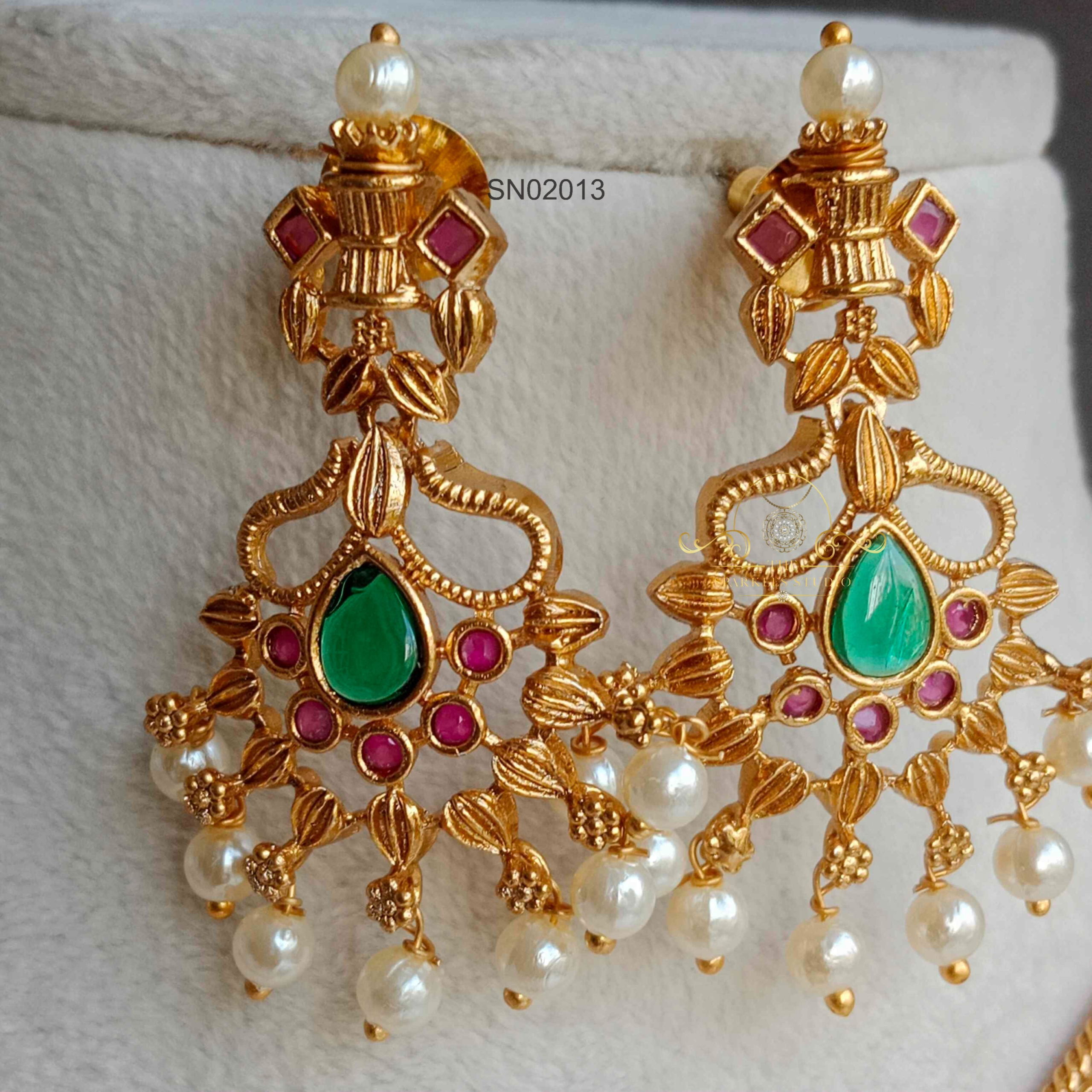 Adorn yourself with the regal charm of Elephant Studs featuring Emerald and White Stone Hanging with Pearl Drops. These intricately designed earrings combine the symbolism of elephants with the richness of emerald and white stones, creating a stunning accessory.