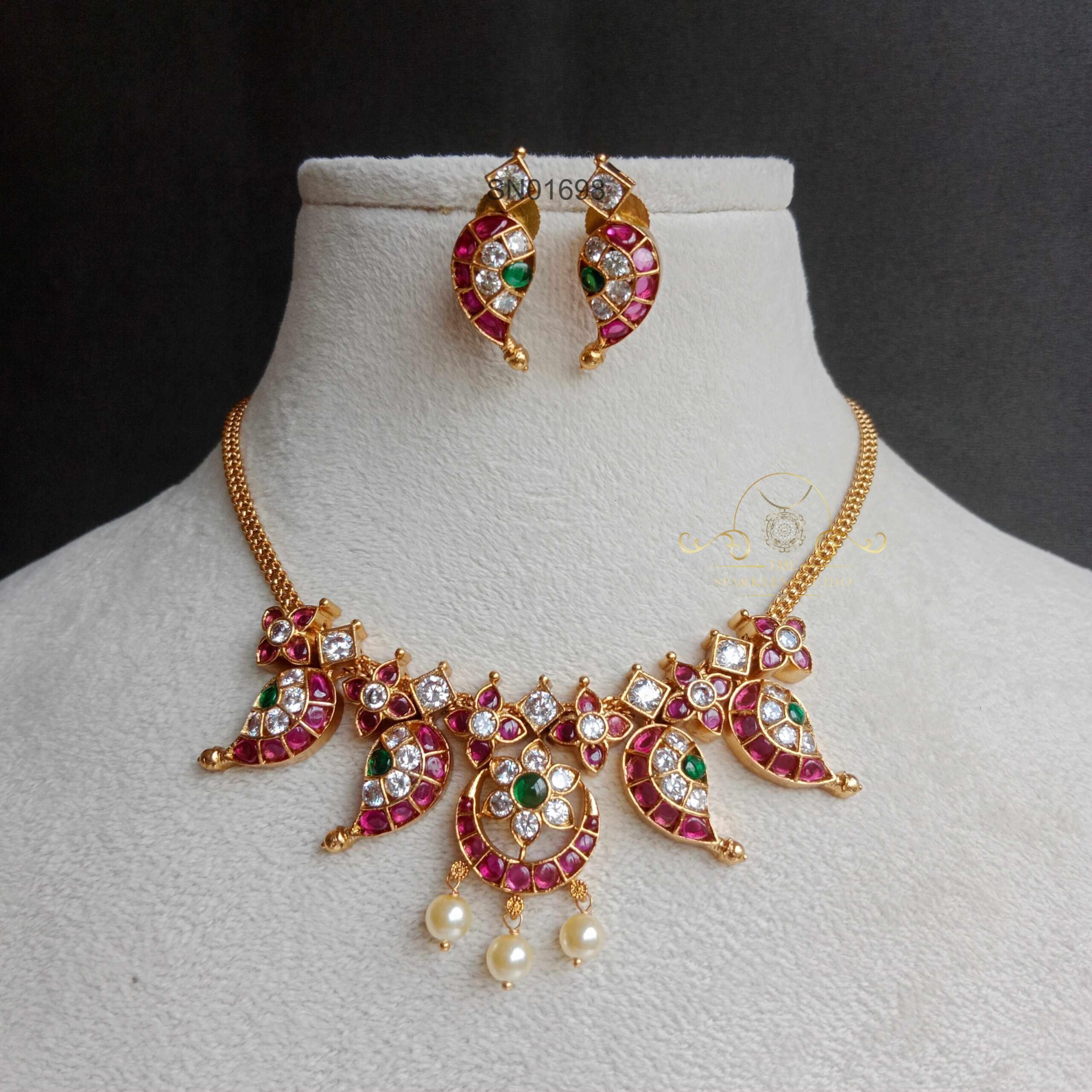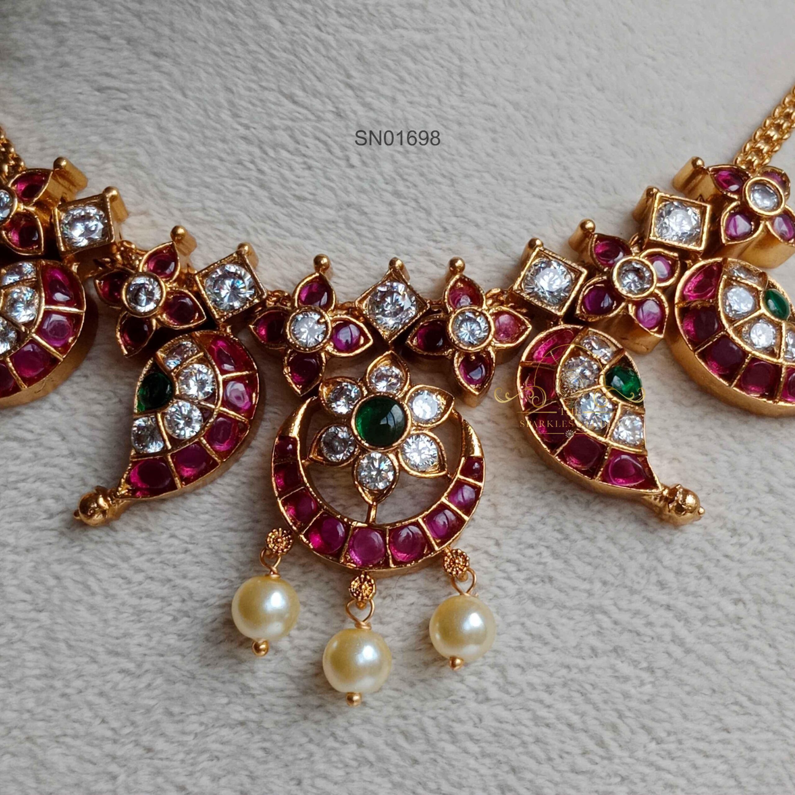 Graceful and vibrant, the Attractive Kemp Stone Necklace shines with traditional red and green kemp stones, exuding classic South Indian charm, perfect for weddings, temple occasions, and festive ethnic ensembles.