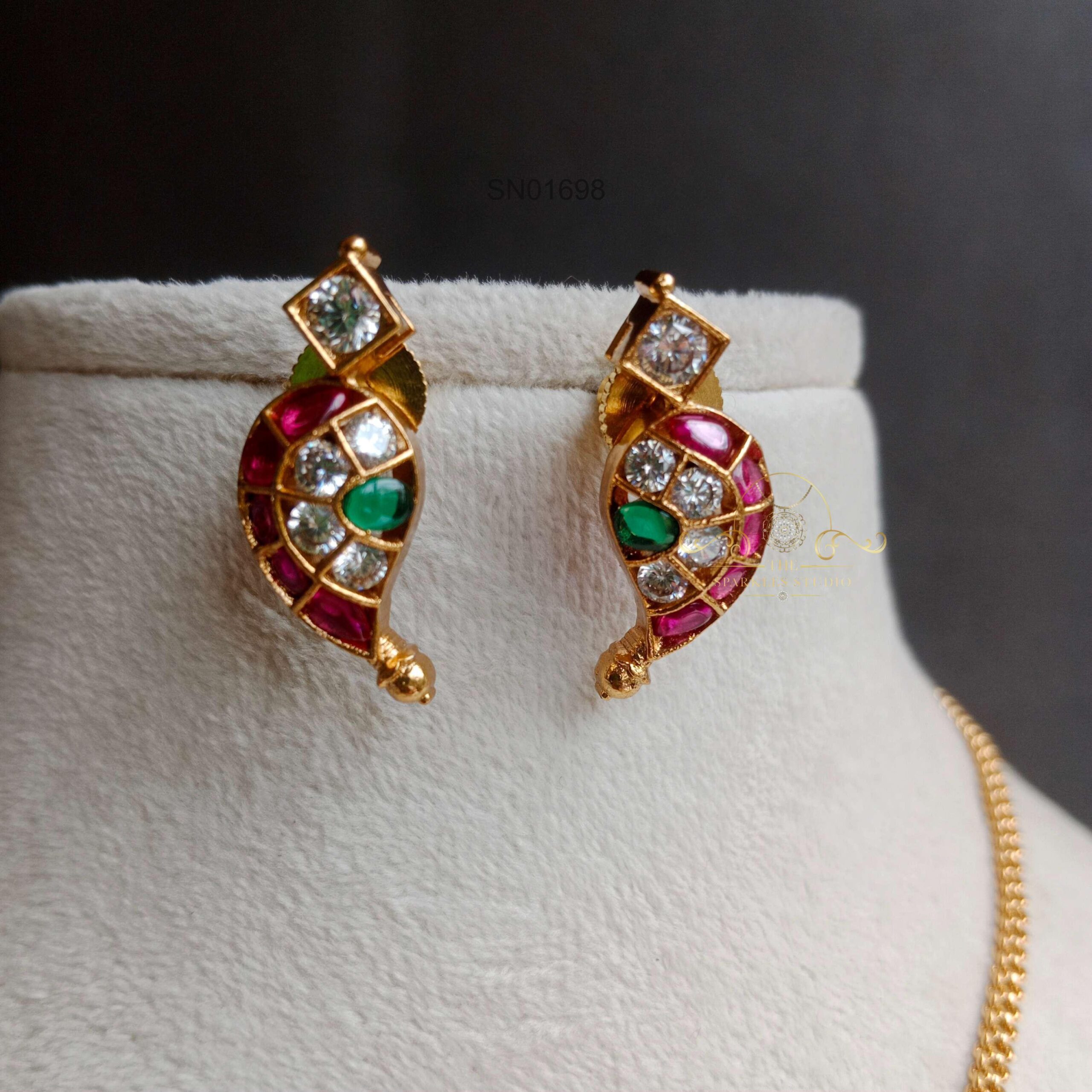 Green Stone Lakshmi Jhumkis are traditional Indian earrings inspired by the Hindu goddess Lakshmi. These jhumkis typically feature intricate designs with green stones, often emerald or other green gemstones, representing prosperity and wealth.