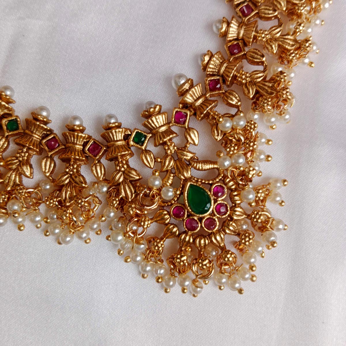 An attractive long Guttapusalu neckset, combining traditional charm with contemporary allure. This ornate piece features a cascade of small pearls, intricate gold beads, and embellishments, creating a visually stunning and versatile accessory. The long design adds a touch of regality, making it perfect for special occasions and traditional attire.