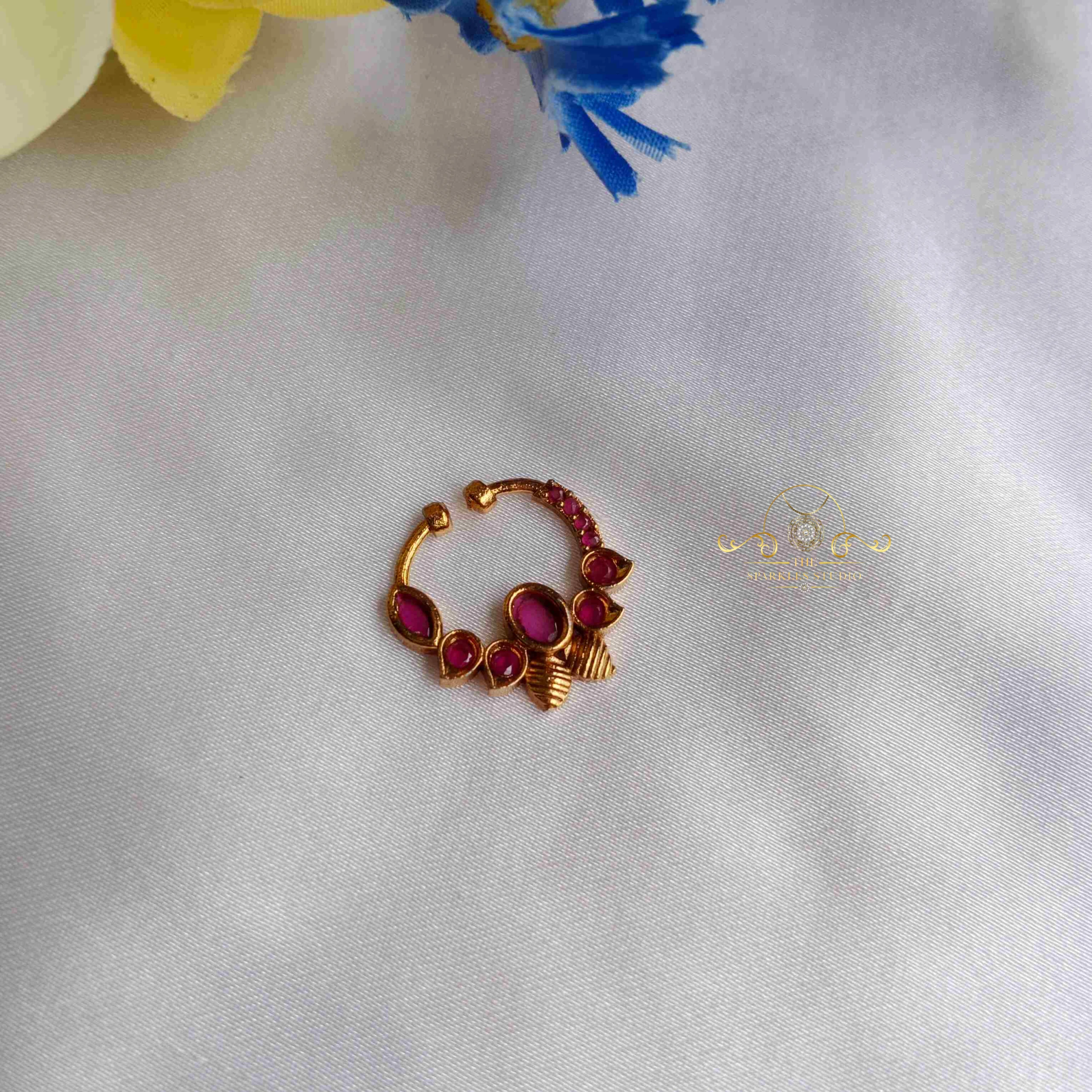 This Beautiful Pattern Nosepin with Ruby showcases a vibrant ruby stone at its center, set in an intricate design.