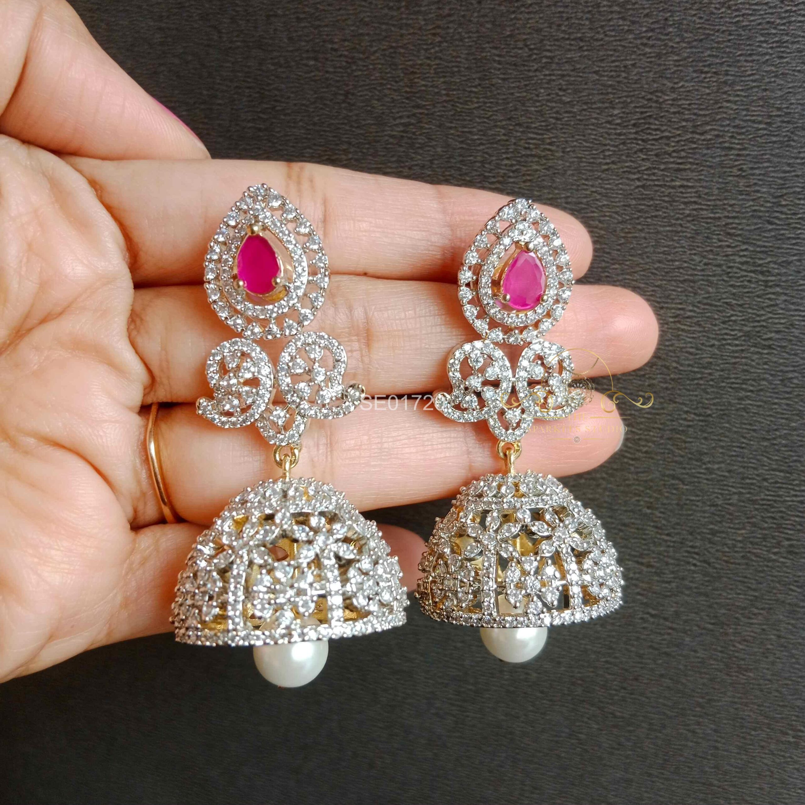 This Bridal AD Mango Ruby Jhumki radiates traditional beauty with its intricate mango motifs, shimmering American diamonds, and rich ruby accents. Perfect for weddings, it enhances bridal grace with timeless South Indian elegance.