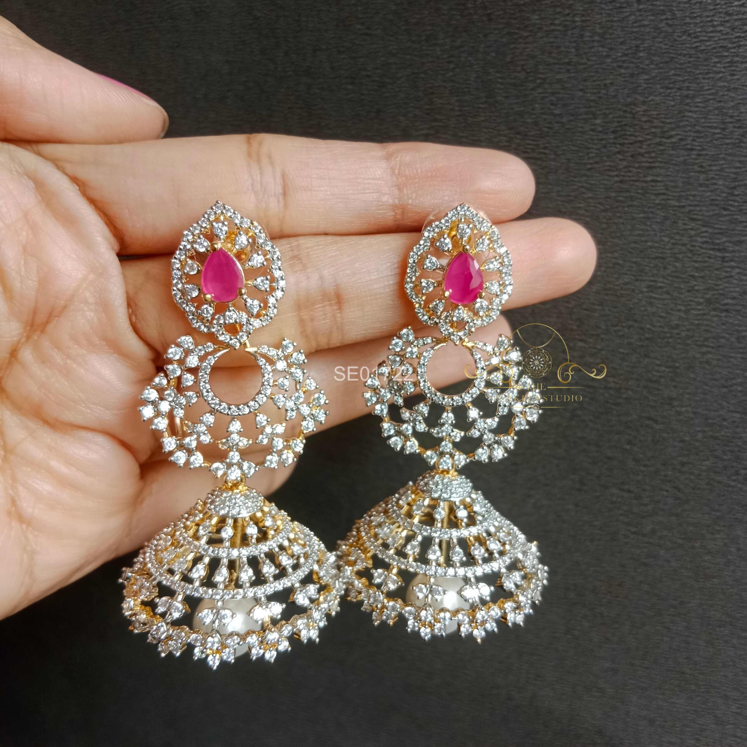 This Bridal AD Ruby Jhumki blends timeless tradition with sparkling elegance. Adorned with radiant rubies and shimmering American diamonds, it’s the perfect choice to complete a bride’s graceful and royal wedding look.