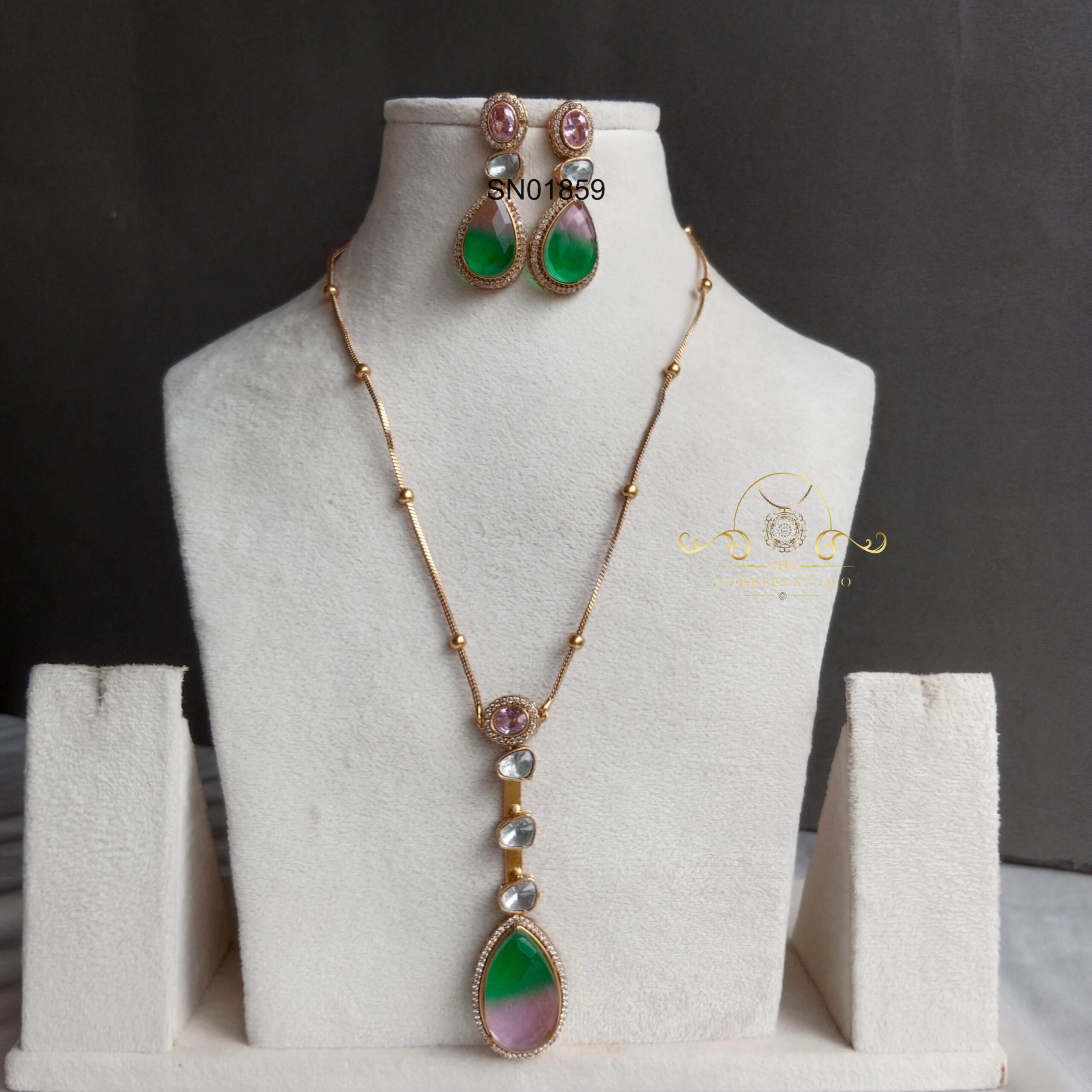 Colour stone pendant with moissanite stones necklace featuring vibrant hues and brilliant sparkle. Perfect for festive and wedding looks, adding elegant shimmer, colorful charm, and a graceful statement to any traditional outfit.