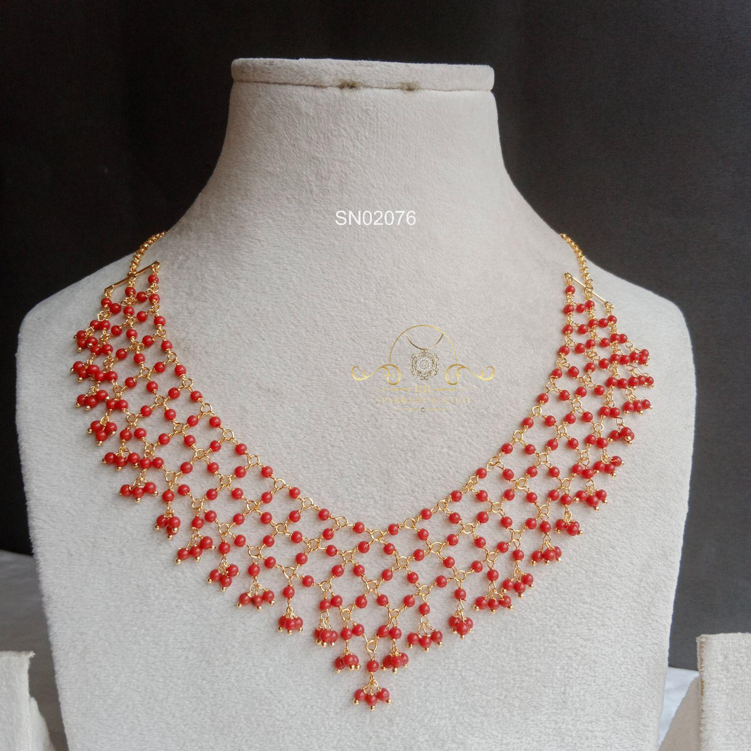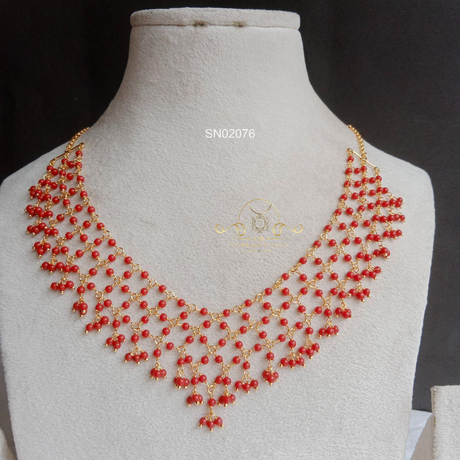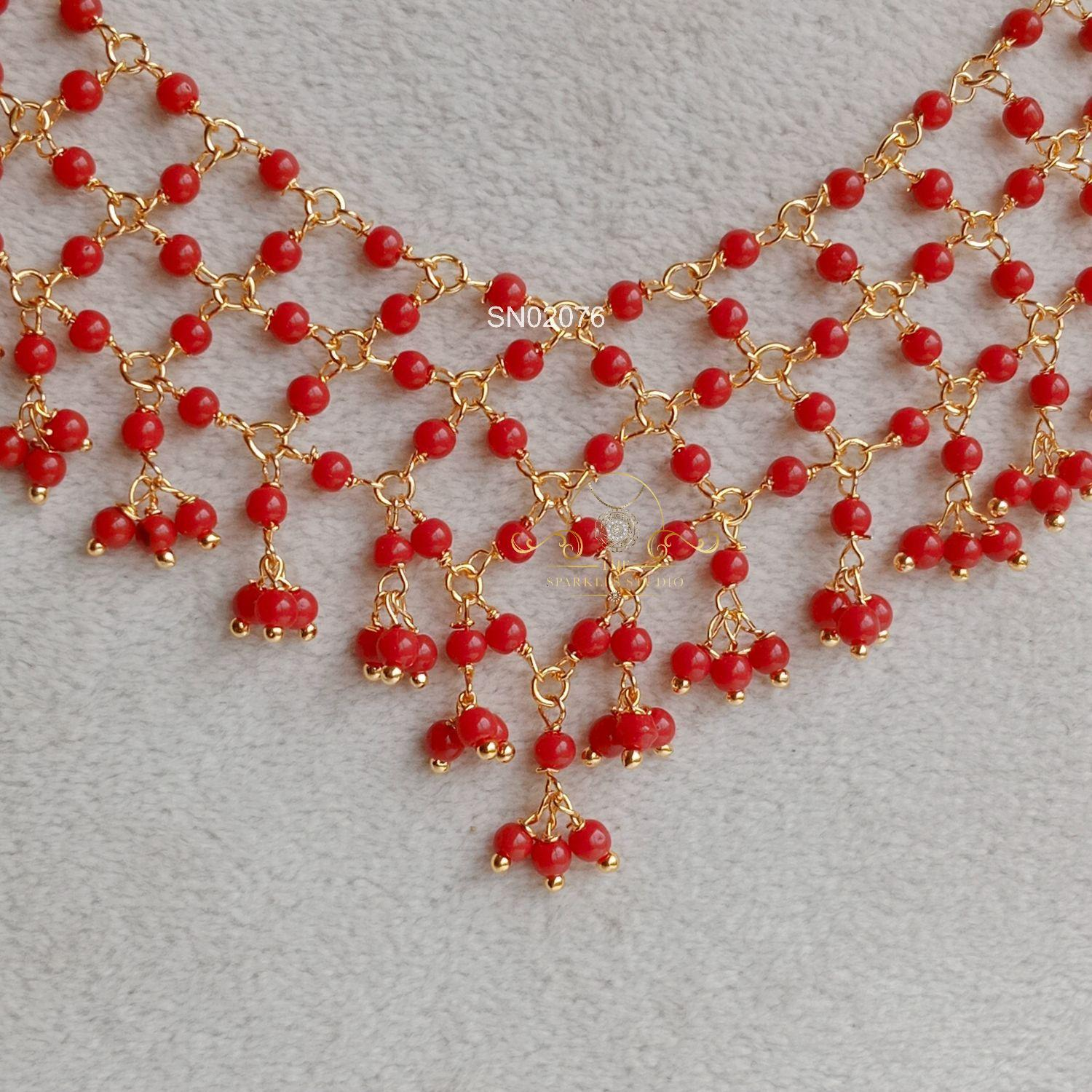 Stylish Coral Net Necklace featuring intricately woven coral beads forming a graceful net design, creating a bold traditional statement perfect for festive occasions, weddings, and elegant saree styling.