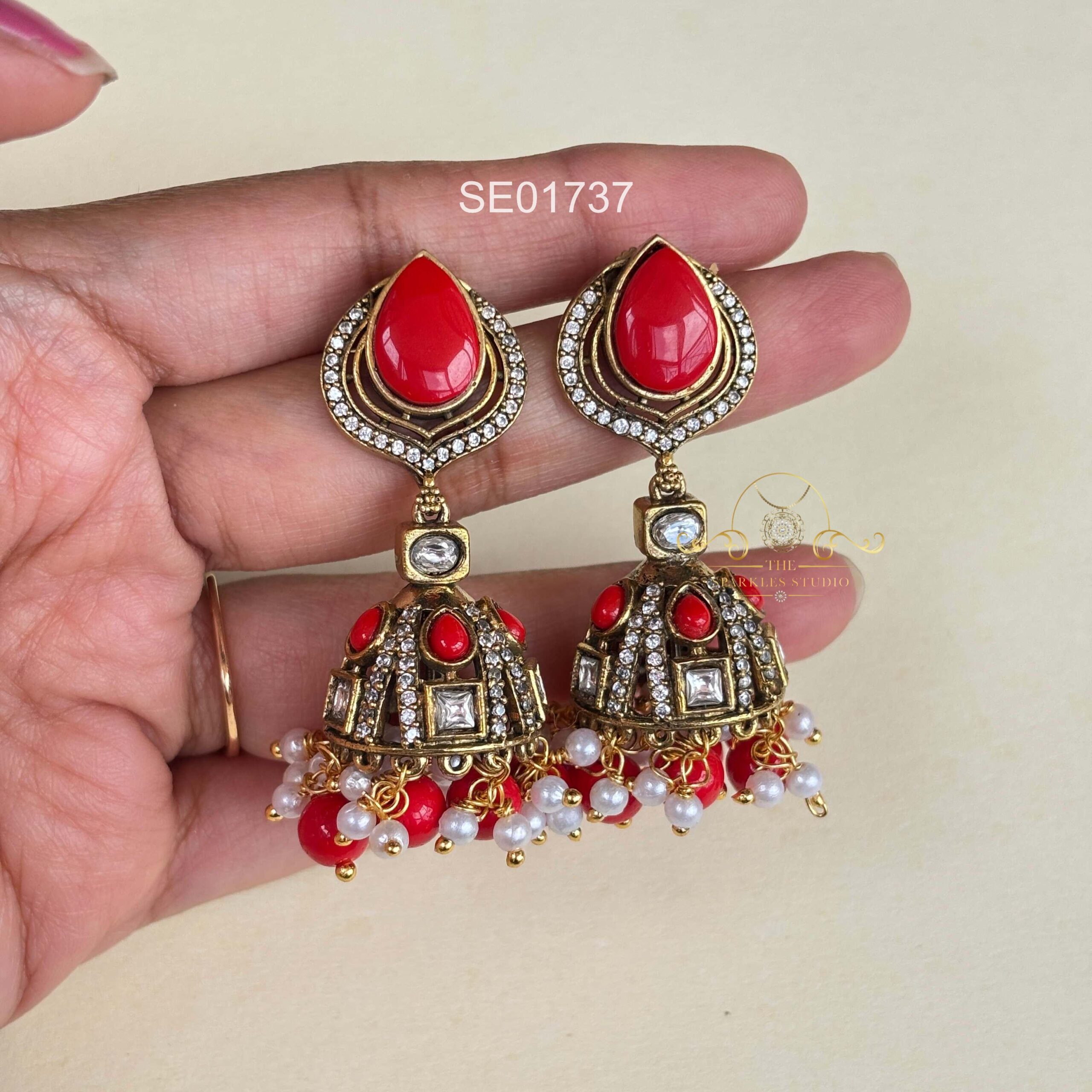 Elegant Coral Victorian Jhumkis crafted with rich coral stones and intricate Victorian design. Perfect for weddings, festive occasions, and traditional outfits, they add timeless charm and regal sophistication to your jewellery collection.