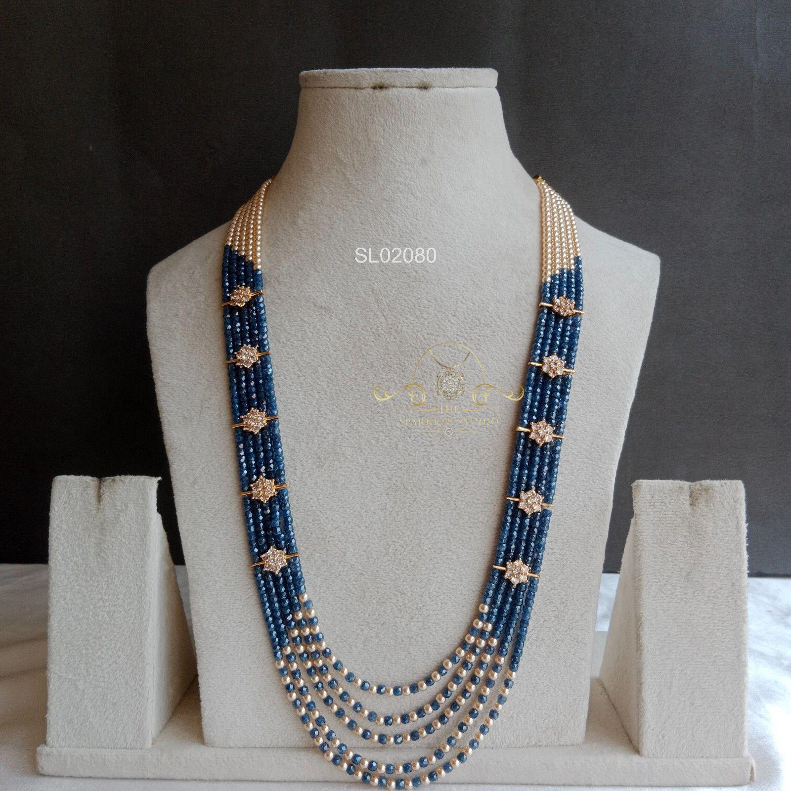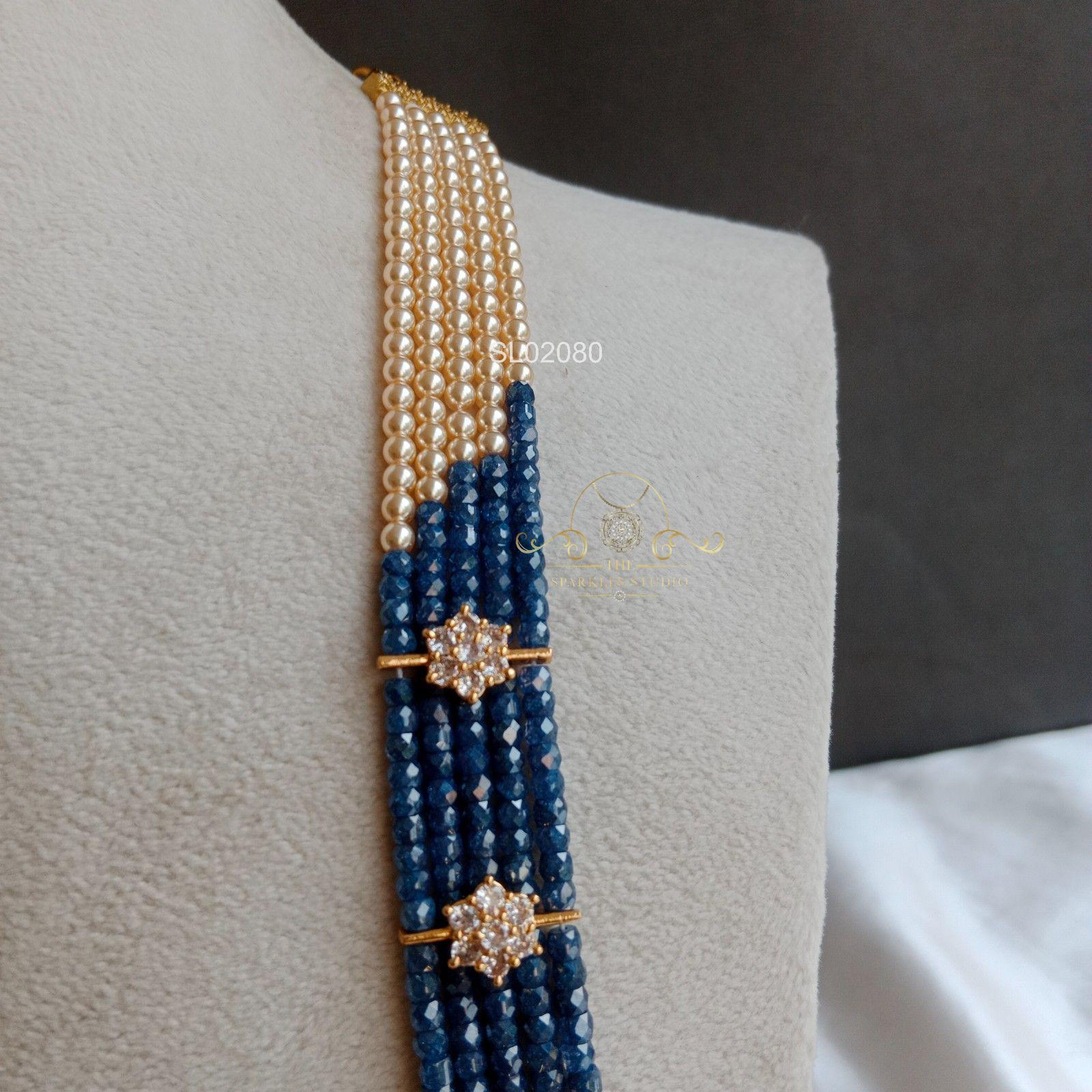 Elegant Dark Blue Beads with Pearls Haram featuring rich blue beads paired with lustrous pearls, creating a graceful layered look perfect for weddings, festive occasions, and classic styling with silk sarees.
