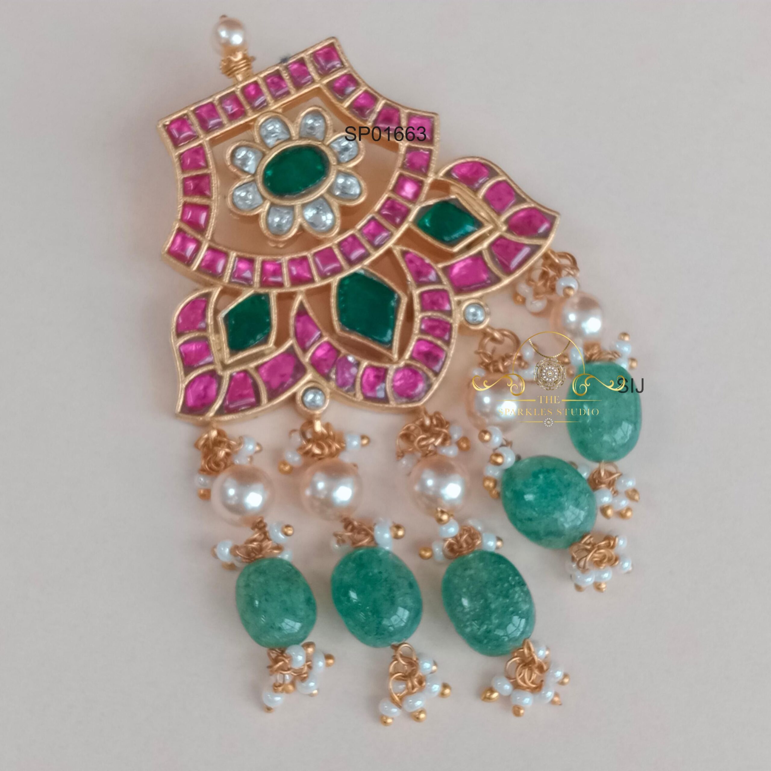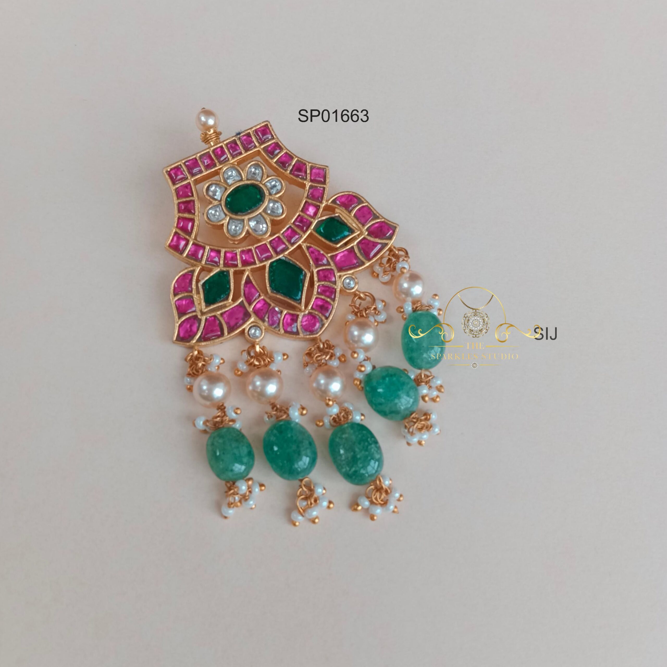 Elegant ethnic Jadau pendant showcasing intricate craftsmanship with vibrant stones and traditional detailing. A timeless piece that blends heritage charm with sophistication, perfect for pairing with festive outfits or heirloom-inspired ensembles.