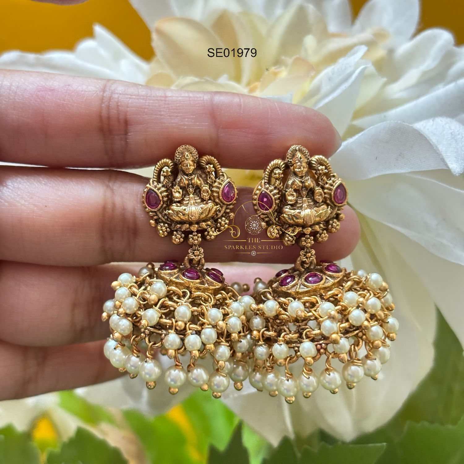 Goddess Lakshmi cluster pearl jhumki featuring divine Lakshmi motifs, rich antique detailing, and delicate pearl clusters, perfect for weddings, poojas, and festive occasions with timeless traditional charm.
