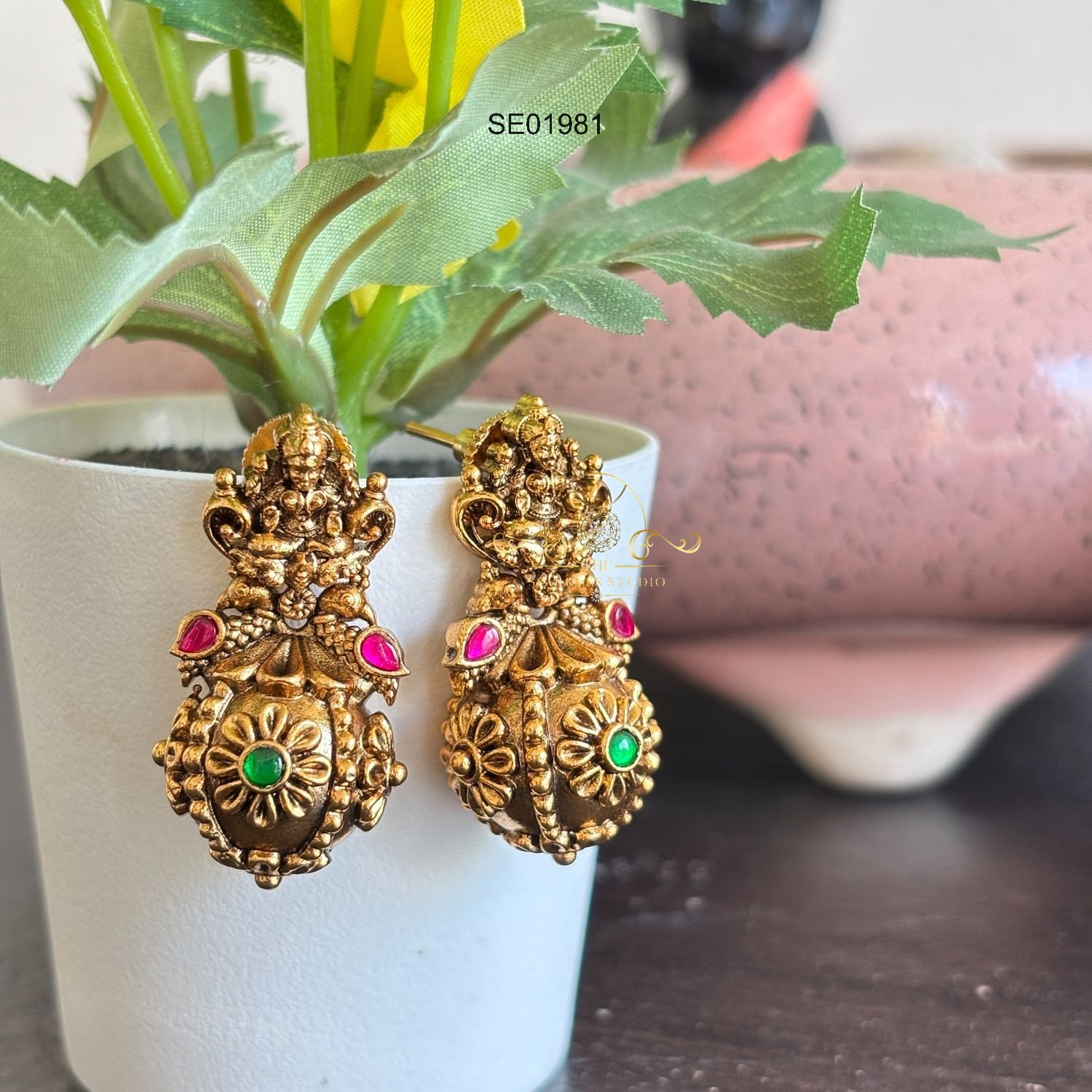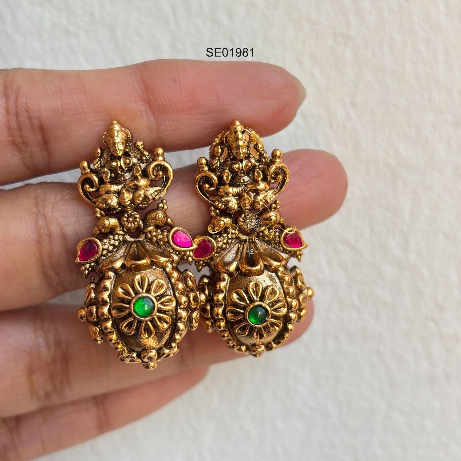 Adorn yourself with the divine charm of our cute small Goddess Lakshmi jhumki earrings. Crafted with intricate detailing, these earrings feature a petite design showcasing the grace of Goddess Lakshmi.
