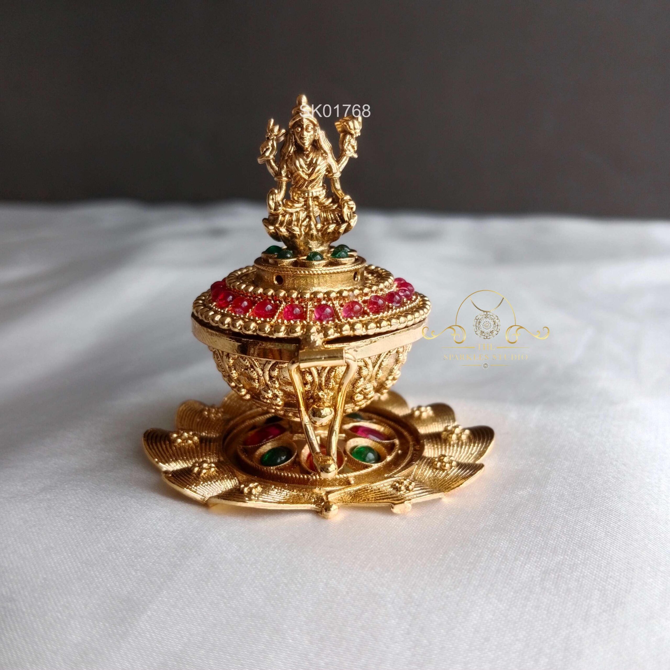 The Goddess Lakshmi Kumkum Box is a beautifully crafted traditional piece featuring divine Lakshmi motifs. Perfect for storing kumkum, it symbolizes prosperity, devotion, and elegance, making it an auspicious addition to every puja ritual.