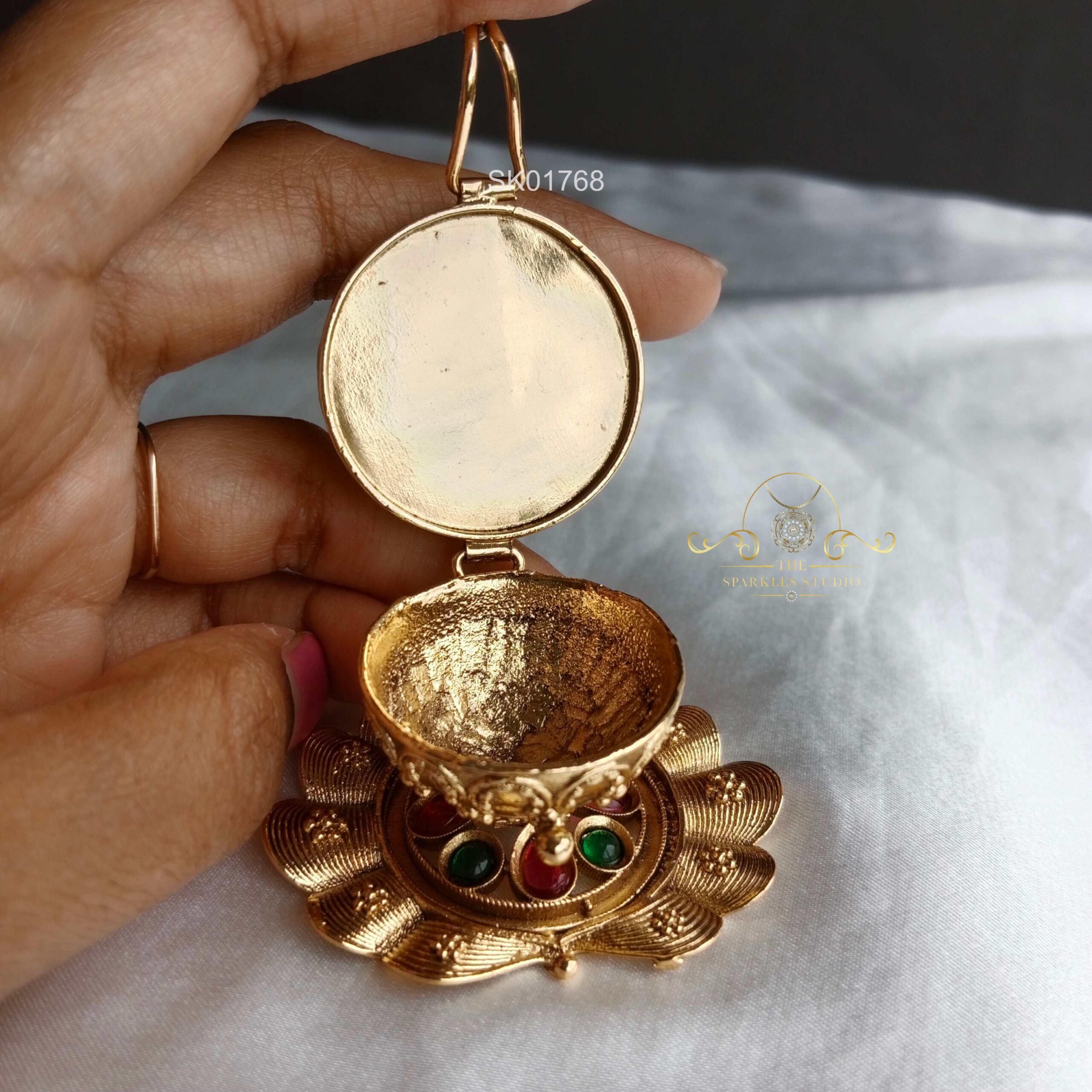 Adorn yourself with the divine charm of our cute small Goddess Lakshmi jhumki earrings. Crafted with intricate detailing, these earrings feature a petite design showcasing the grace of Goddess Lakshmi.