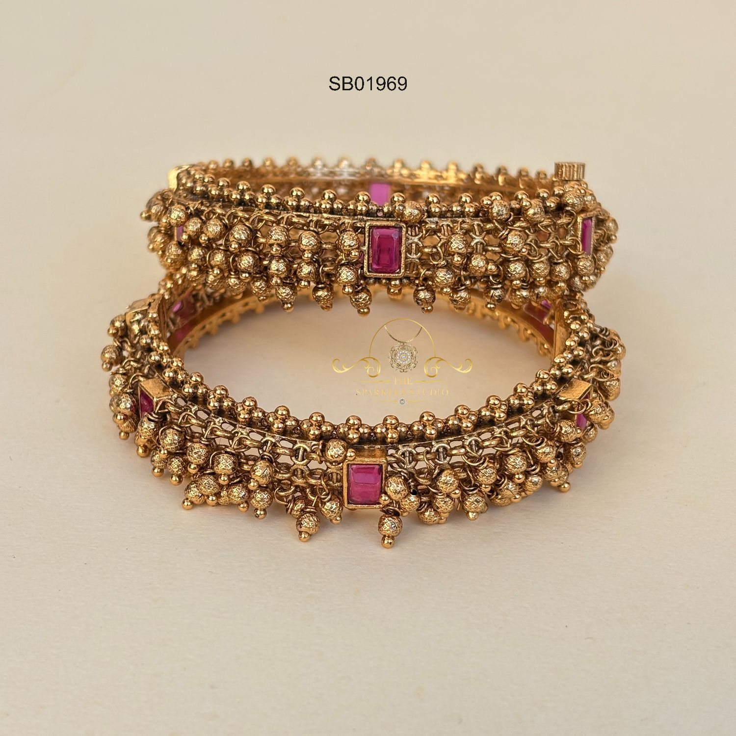Gold beads (gejje) ruby bangles featuring delicate beaded detailing, vibrant ruby accents, and a rich traditional finish—perfect for weddings, festive celebrations, and classic South Indian styling.