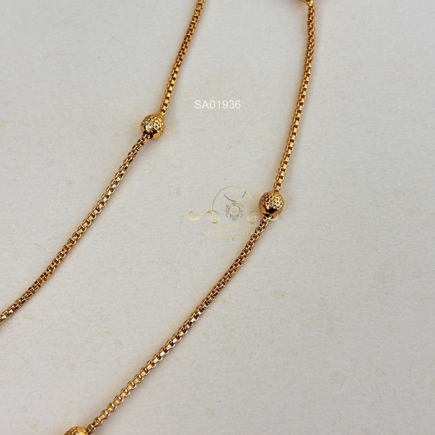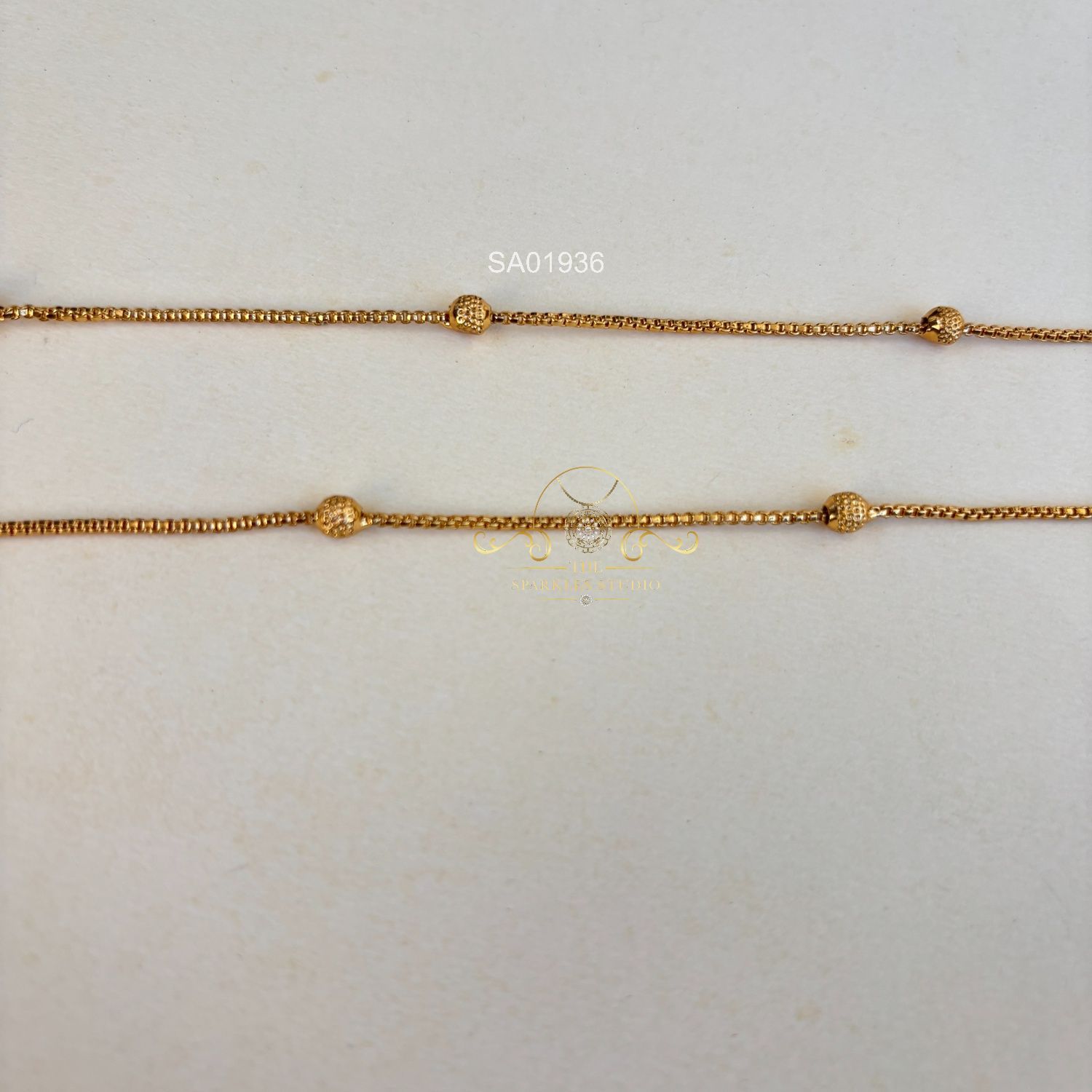 Elegant gold-look-alike ball chain anklets crafted with gleaming finish and delicate detailing. Lightweight and versatile, they add a graceful traditional charm to everyday outfits, festive styles, and bridal pre-wedding looks.