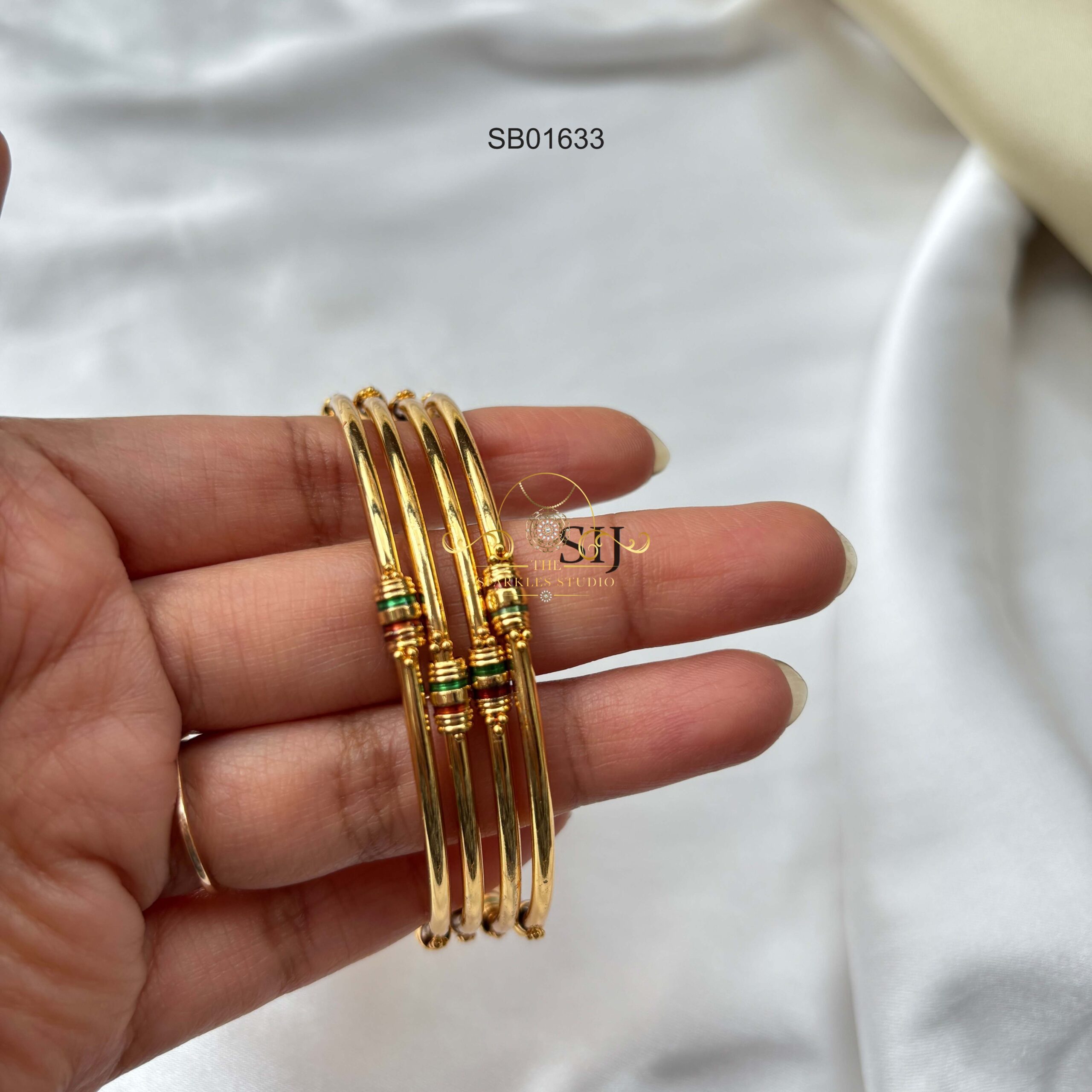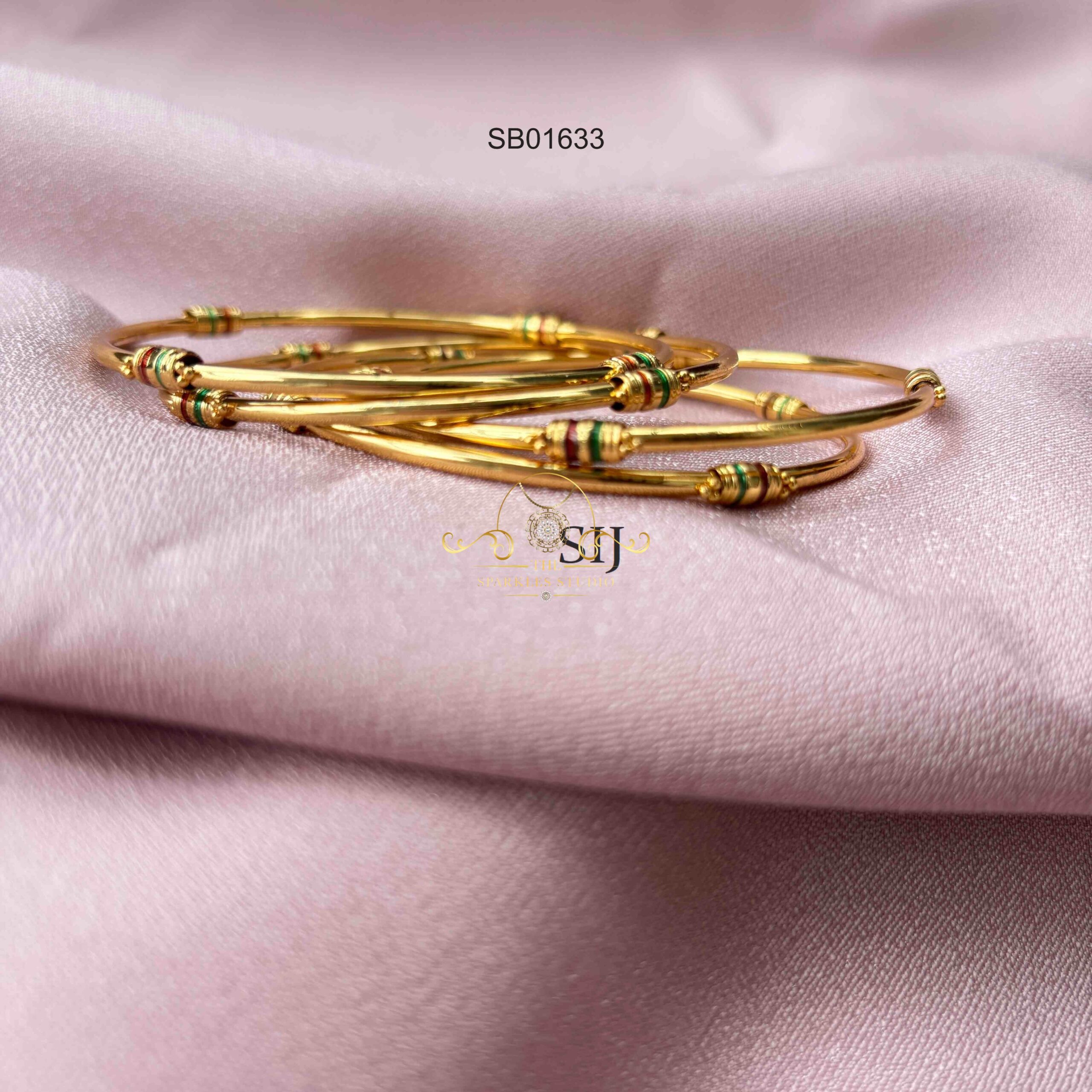 These Gold Look Alike Enamel Bangles feature vibrant enamel detailing with a rich gold finish, blending tradition and color beautifully. Perfect for festive outfits, they add charm without the weight of real gold.
