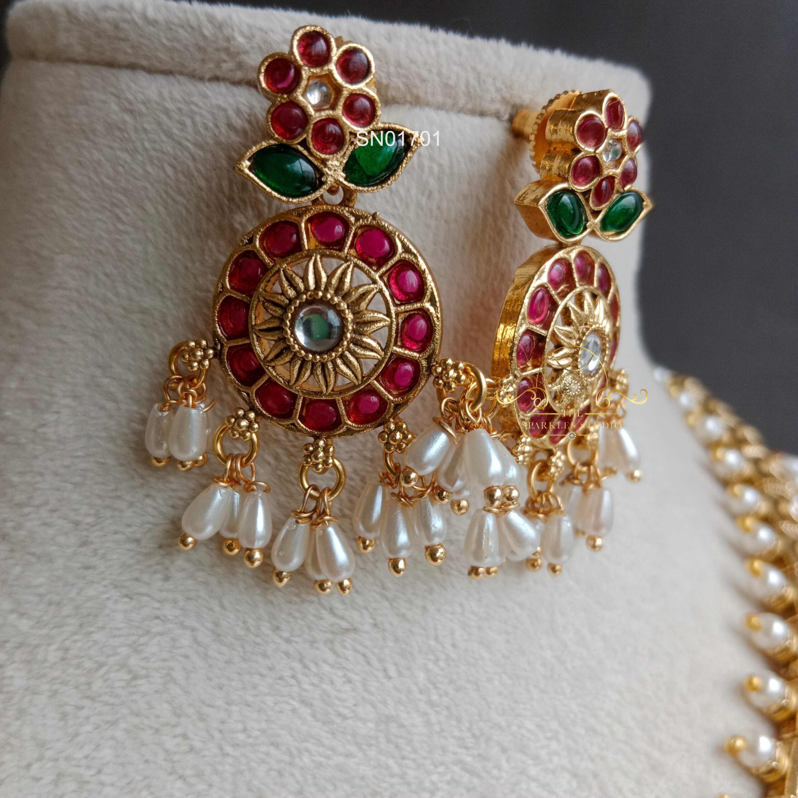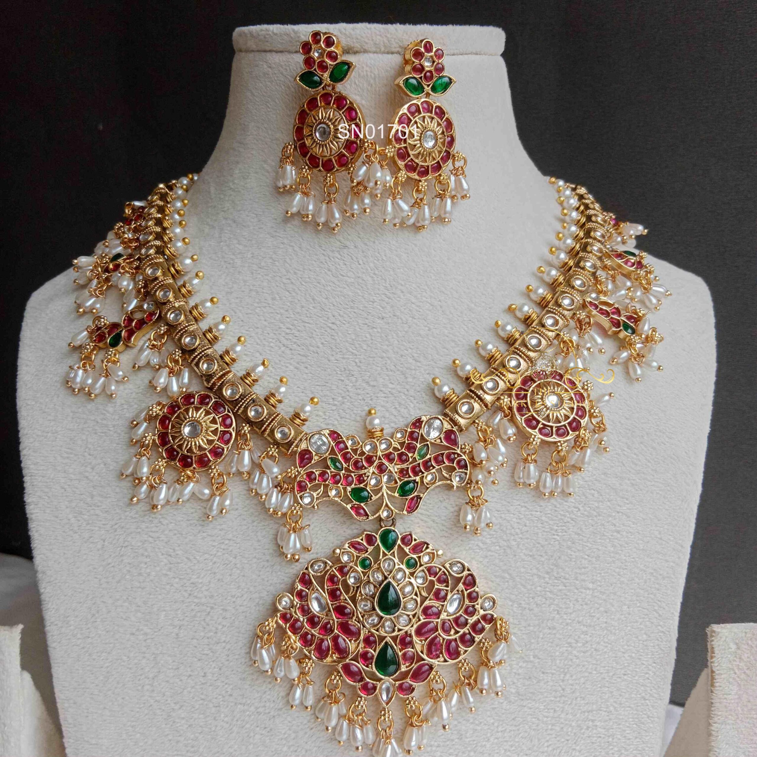 The Kemp Stone Guttapusalu Necklace features vibrant red and green kemp stones with pearl clusters, showcasing South Indian tradition and elegance—perfect for weddings, festivals, and bridal occasions.