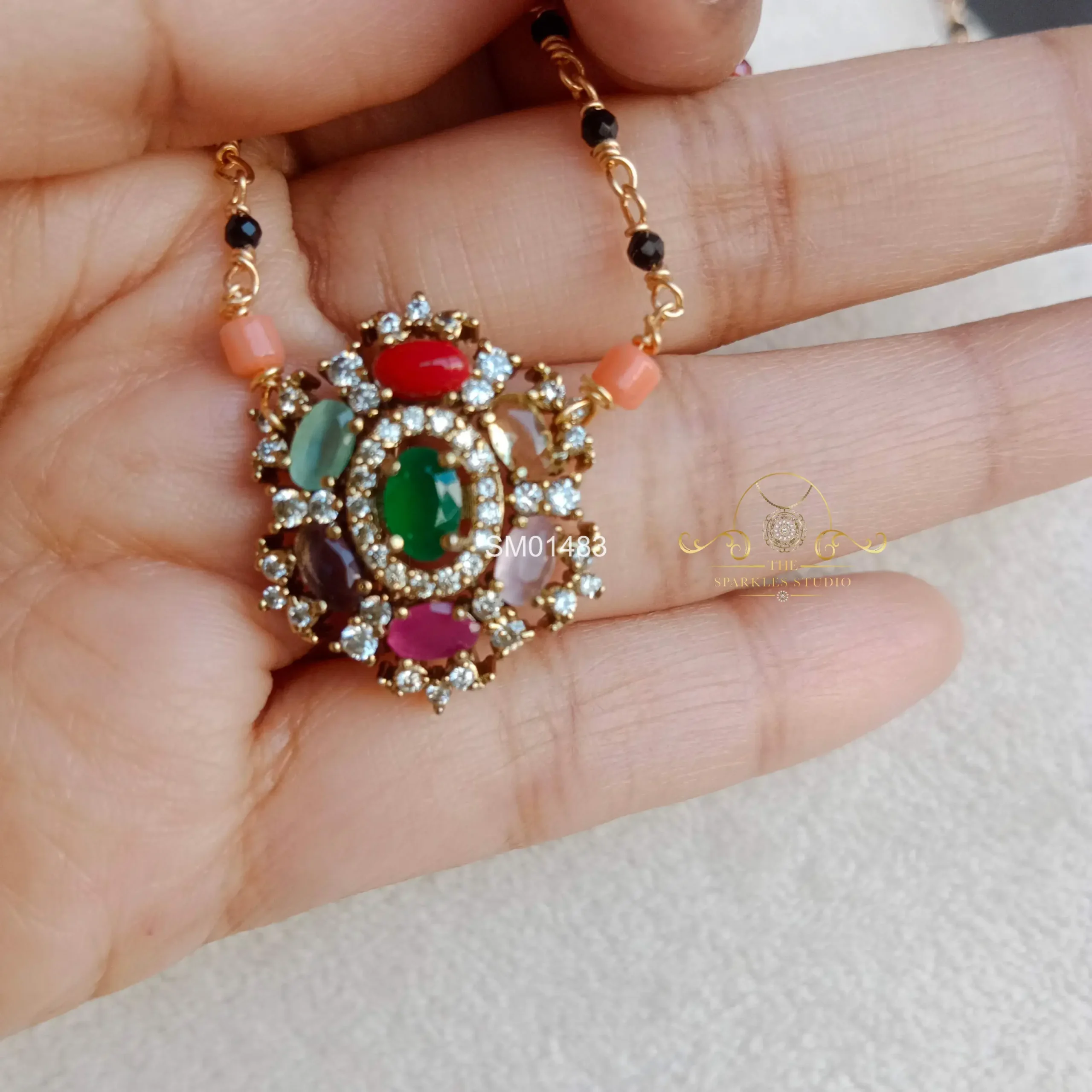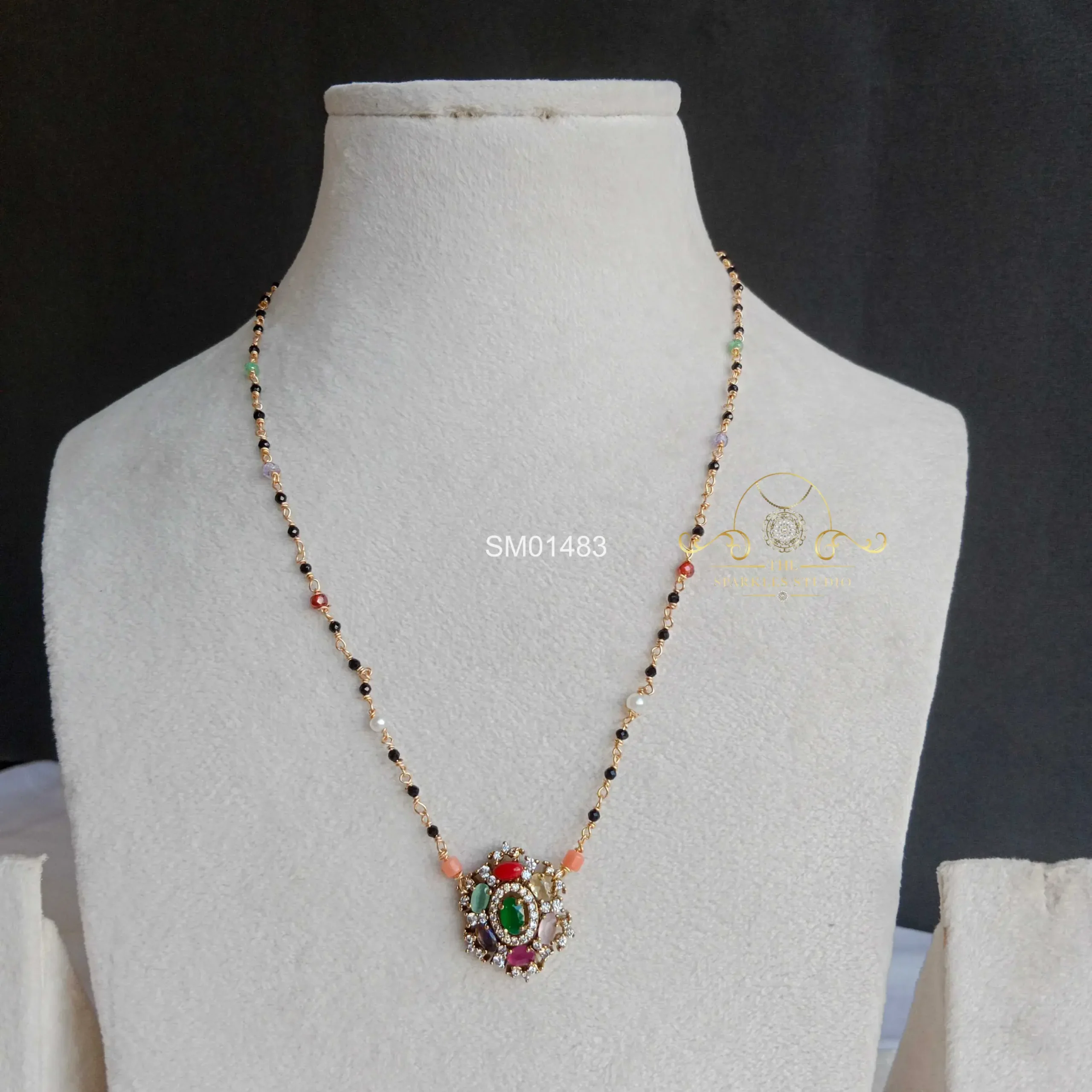 Gorgeous Navrathna Pendant in Multibeads Chain