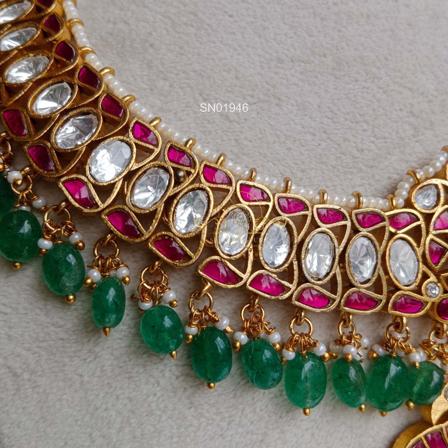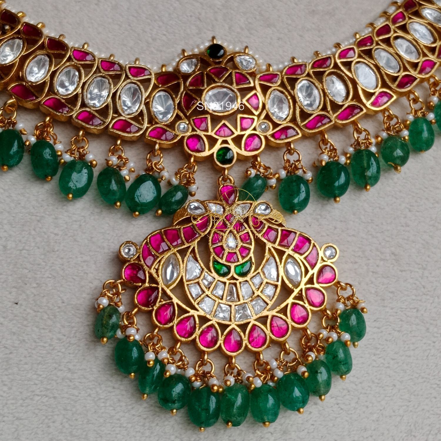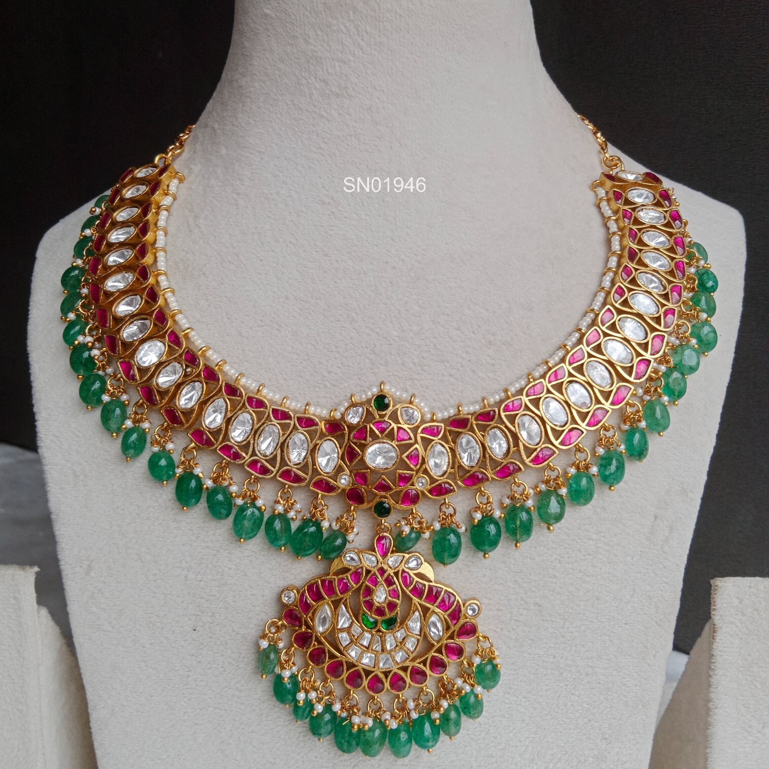 Grand Jadau Moissanite Necklace – A luxurious blend of radiant moissanite stones and traditional jadau artistry, crafted in an opulent statement silhouette. Perfect for brides who love heritage charm with sparkling modern brilliance.