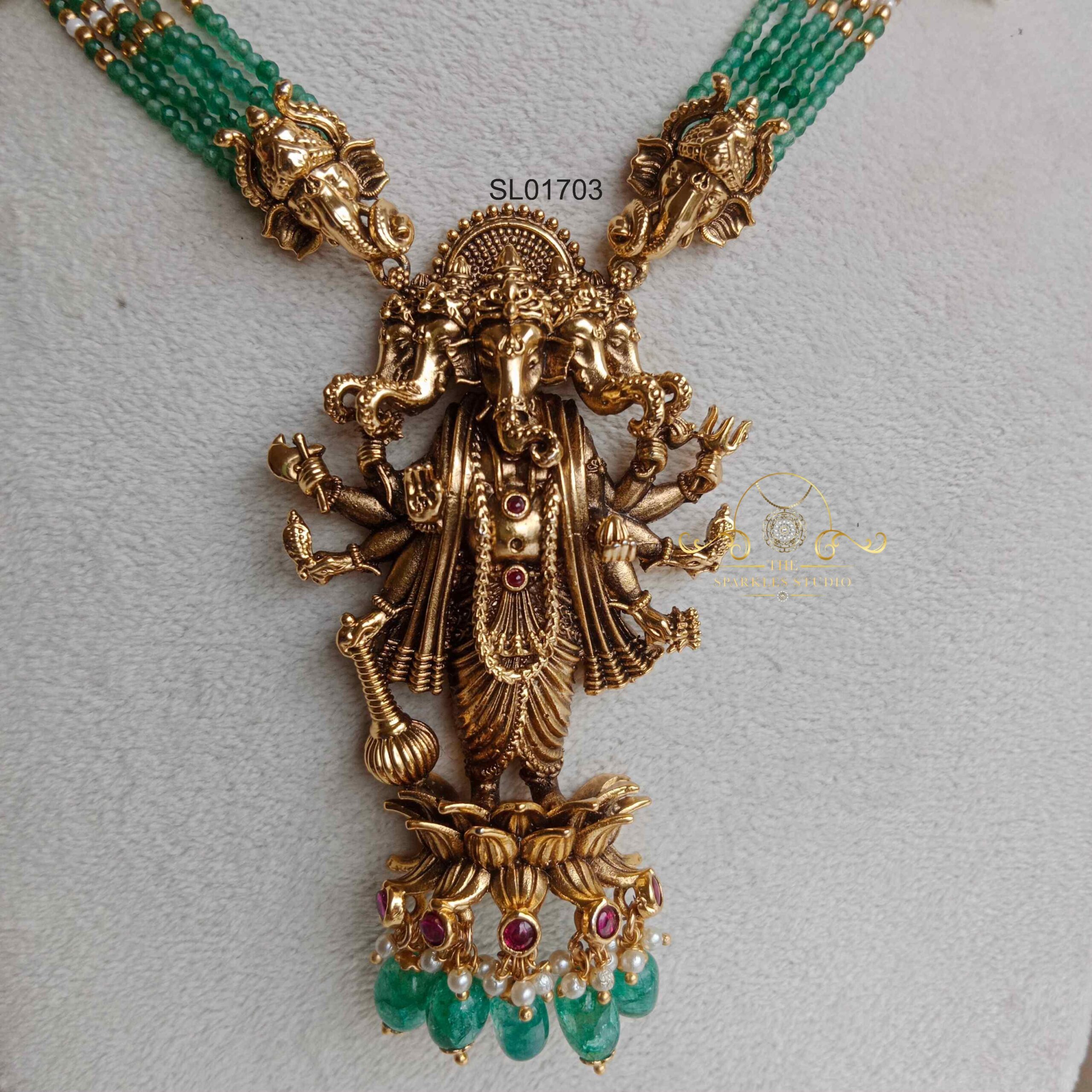 The Green Bead Ganesha Haram features sacred Ganesha motifs with elegant green beads, blending spirituality and style. A perfect South Indian jewelry piece for weddings, festivals, and traditional occasions.