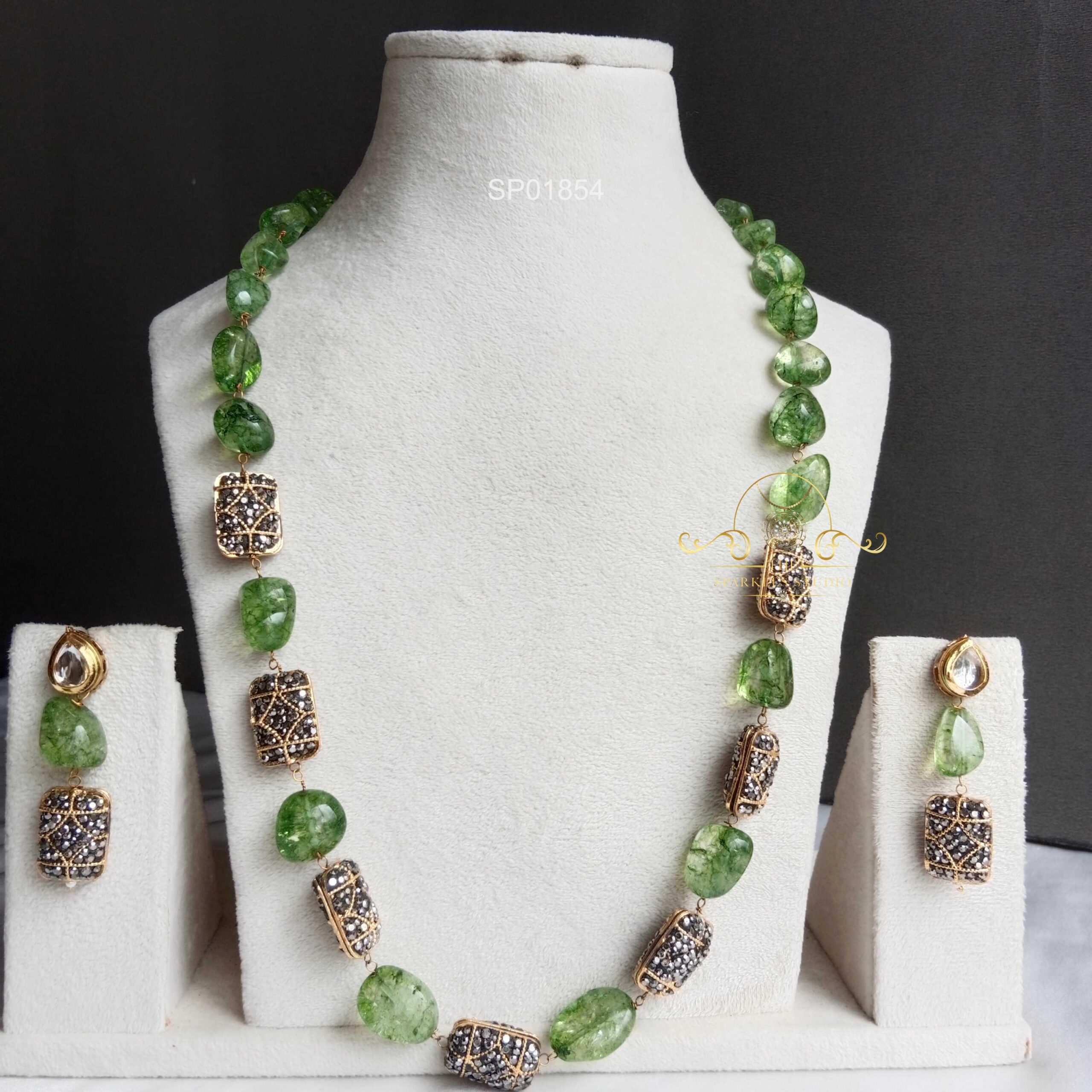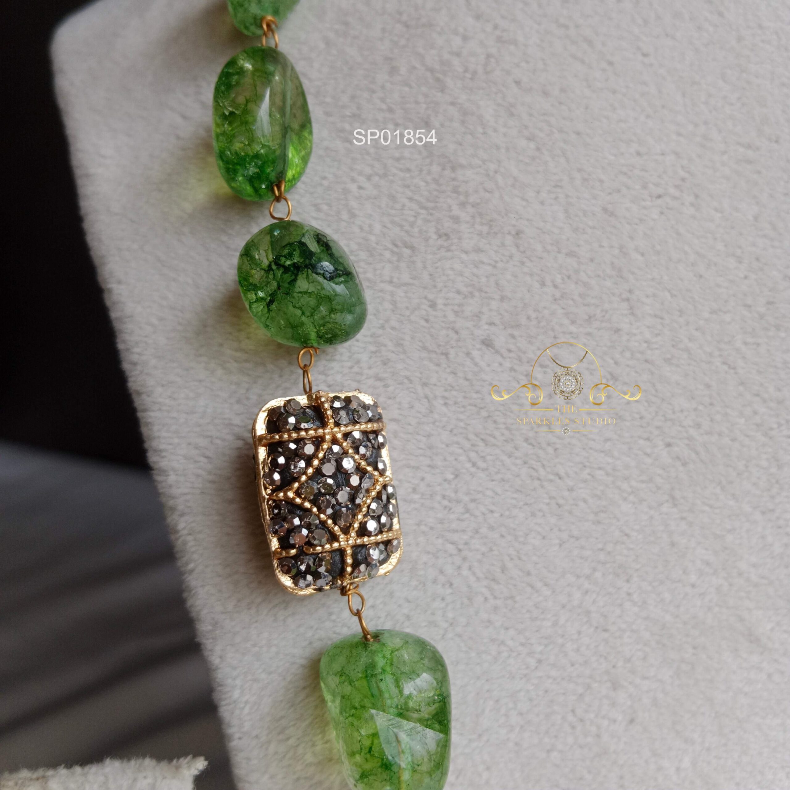 Green bead mala set featuring rich emerald-toned beads with elegant detailing. Perfect for sarees, lehengas, and festive wear, adding graceful color, traditional charm, and timeless sophistication to your look.