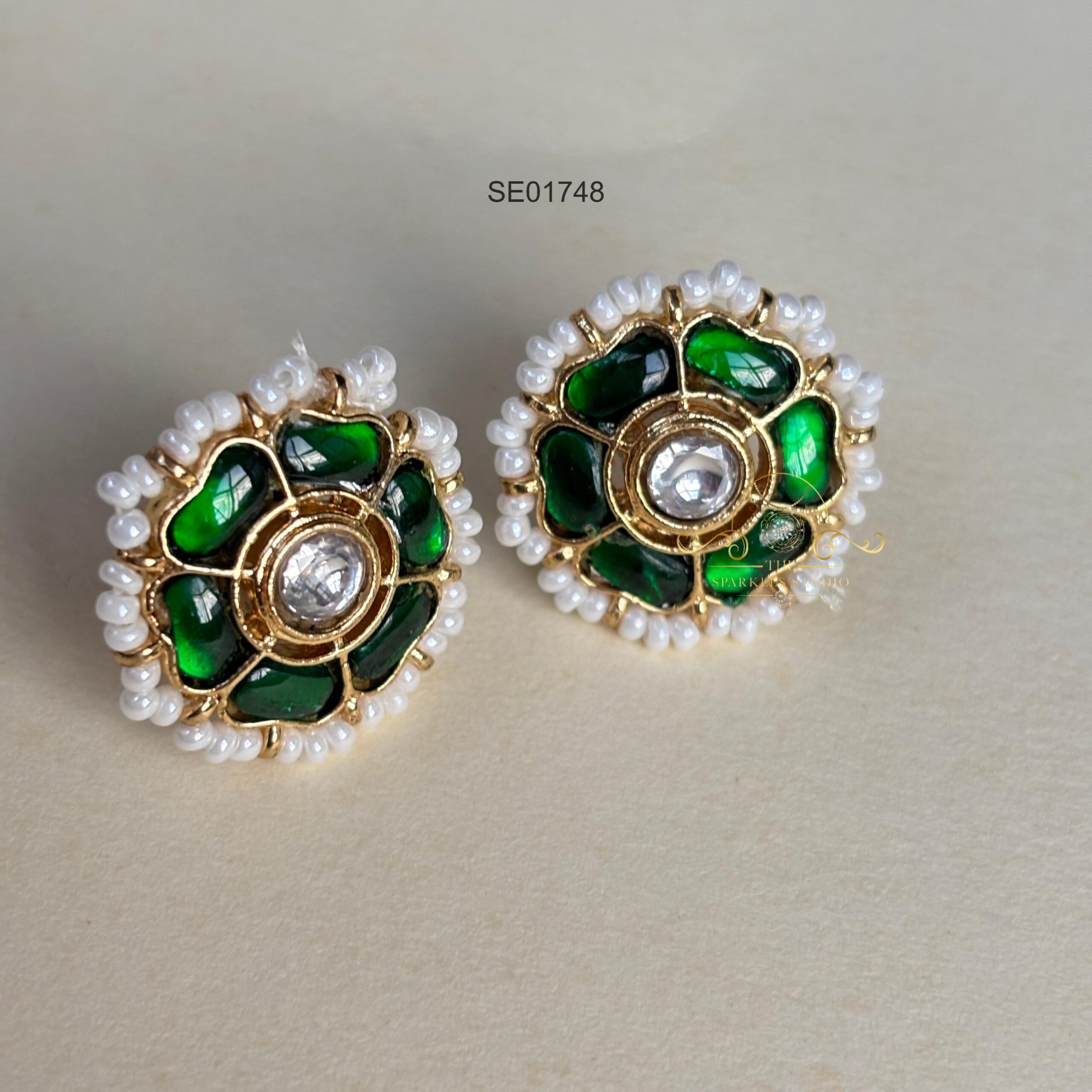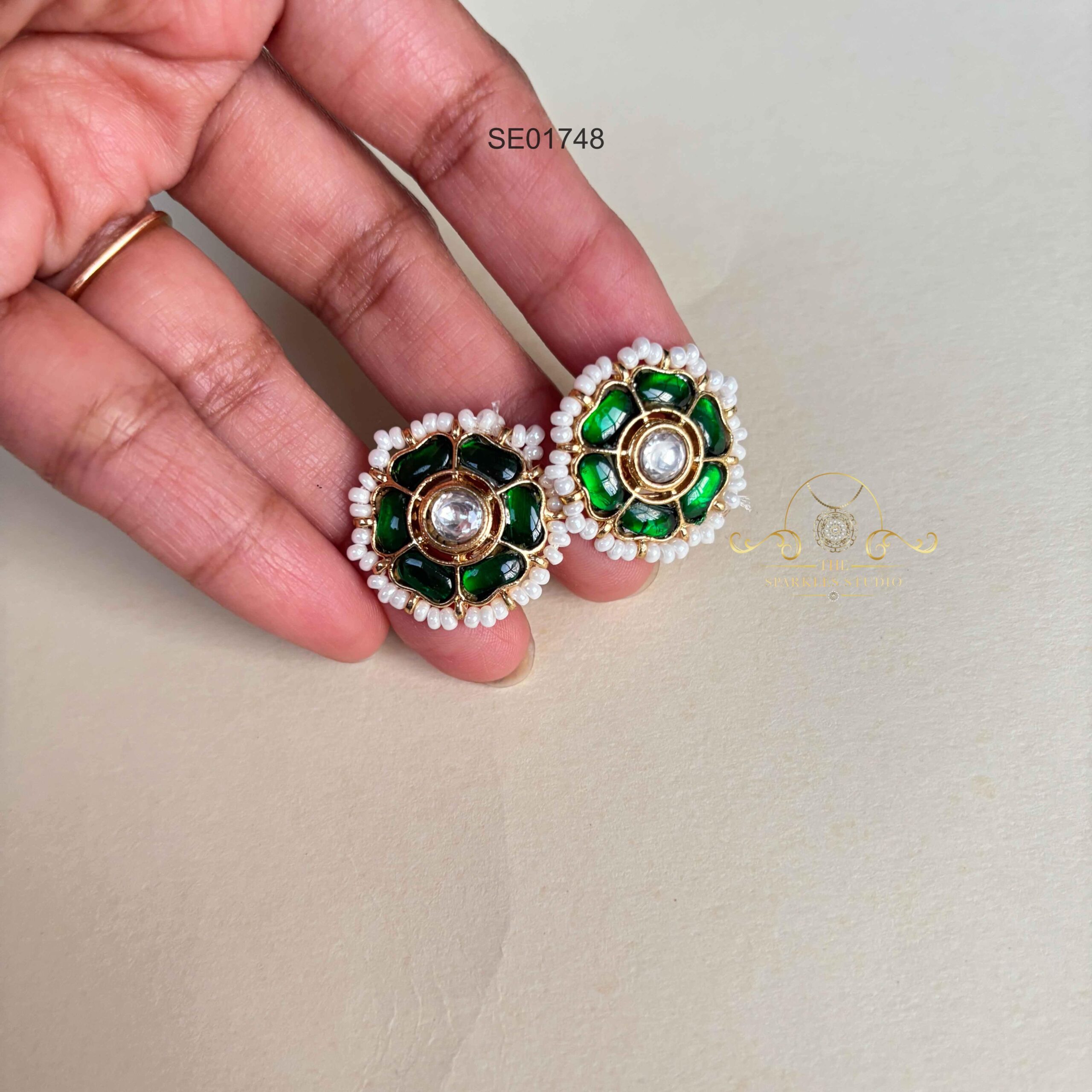 Exquisite Green Jadau Earstuds adorned with rich green stones and intricate jadau craftsmanship. Perfect for weddings and festive occasions, they bring regal charm and traditional elegance to your jewellery collection.