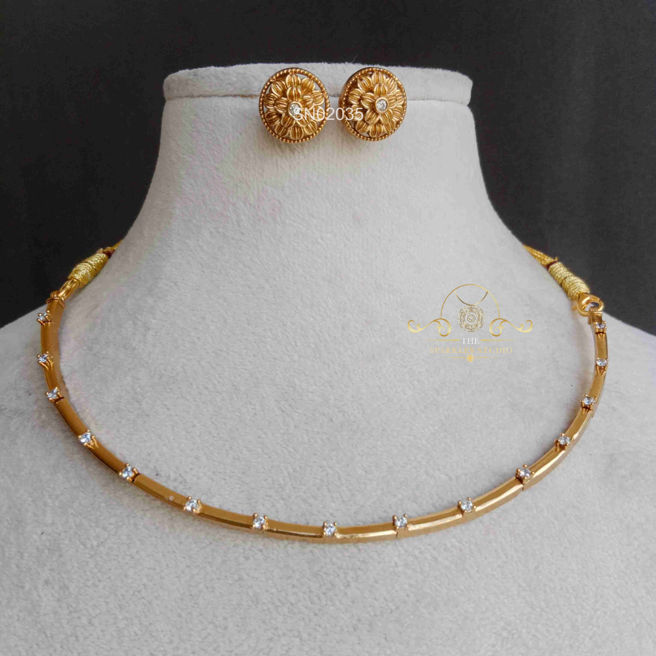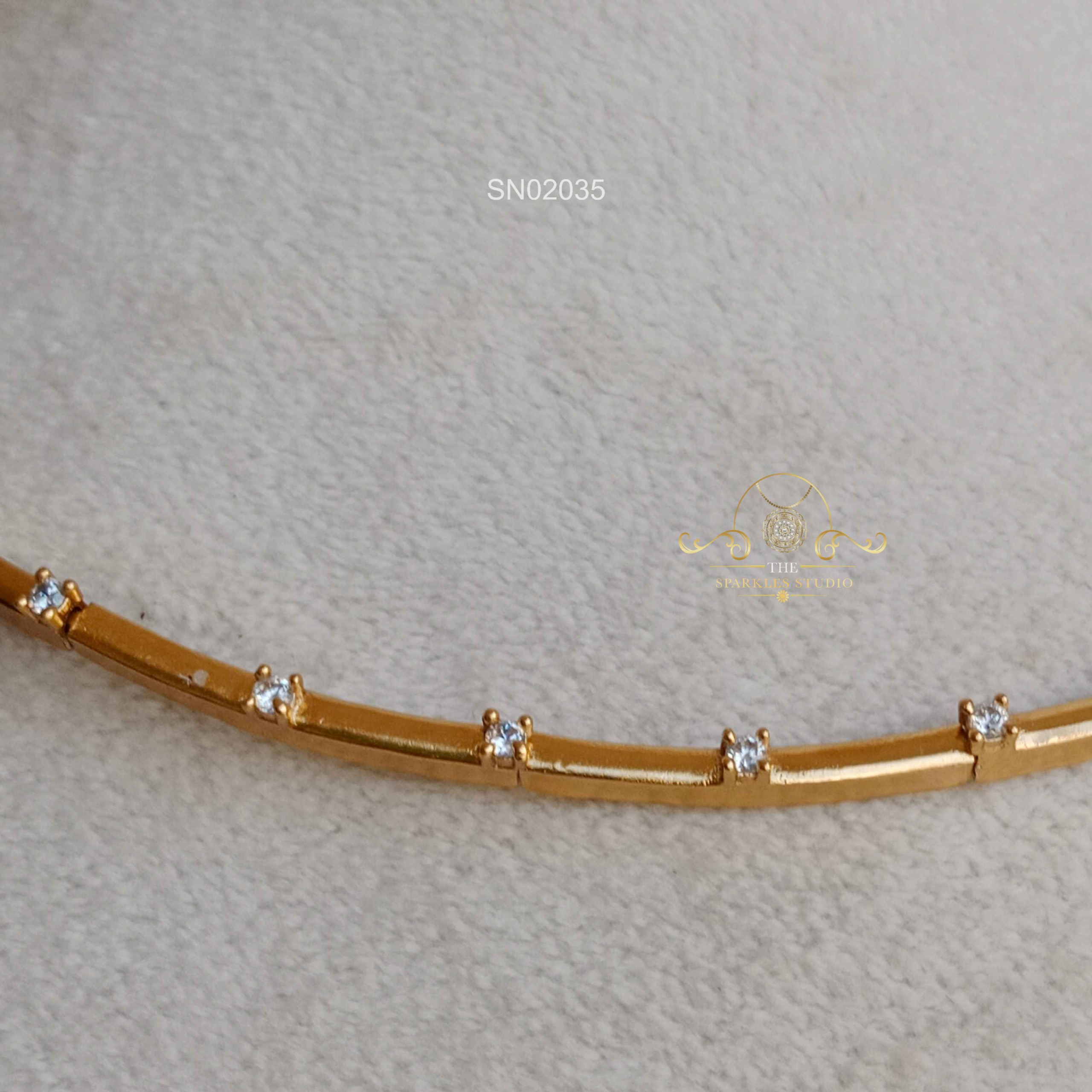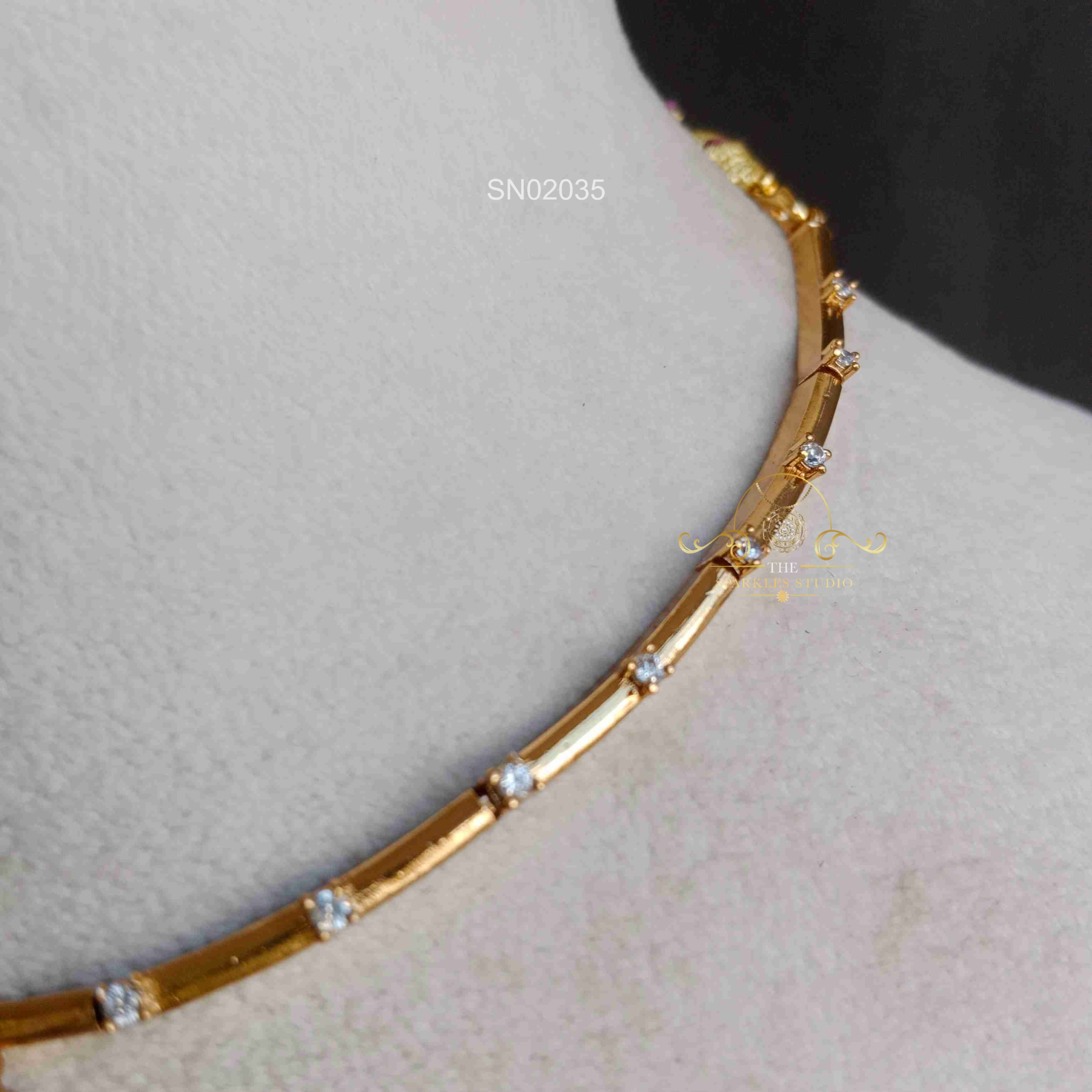 Hasli AD Necklace features a sleek, structured hasli design adorned with dazzling American diamonds. Elegant and modern, this statement piece adds refined sparkle and effortless grace to festive, wedding, and party ensembles.