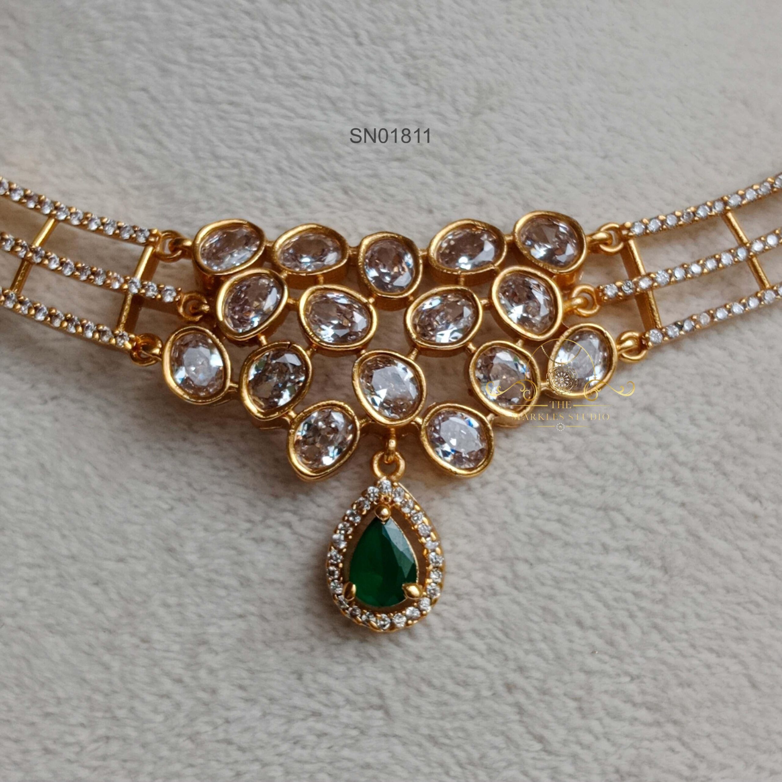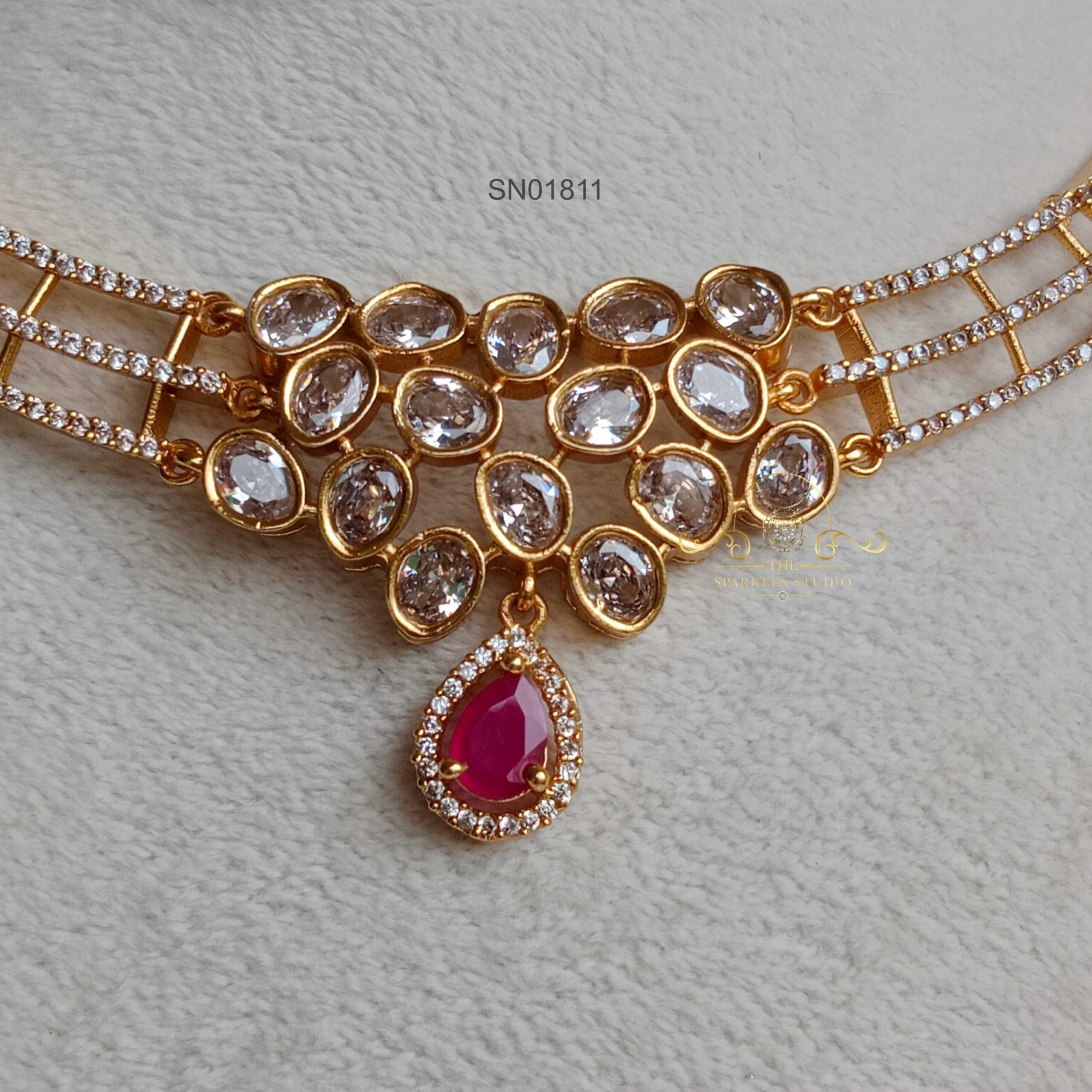 Elegant Hasli AD Stone Necklace crafted in a sleek traditional hasli design, adorned with sparkling AD stones. Perfect for weddings, festive occasions, and parties, adding timeless charm and graceful sophistication to your ethnic look.
