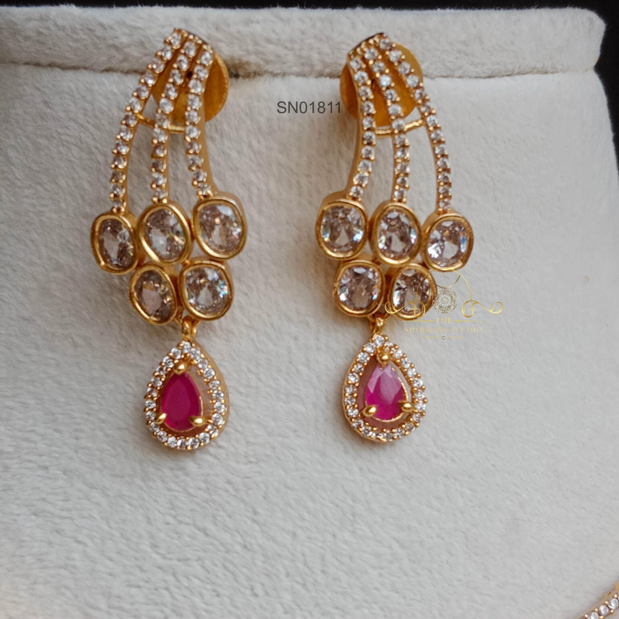 The Dazzling Ruby Polki Studs are a glamorous and vibrant pair of earrings. These studs feature Polki diamonds with a rustic charm, set in a design that showcases dazzling rubies.