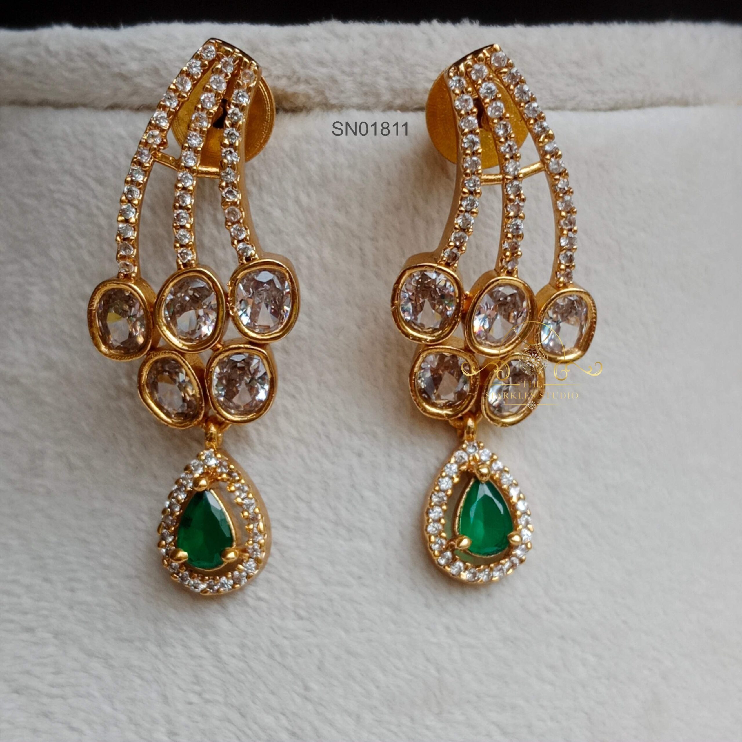 Green Stone Lakshmi Jhumkis are traditional Indian earrings inspired by the Hindu goddess Lakshmi. These jhumkis typically feature intricate designs with green stones, often emerald or other green gemstones, representing prosperity and wealth.