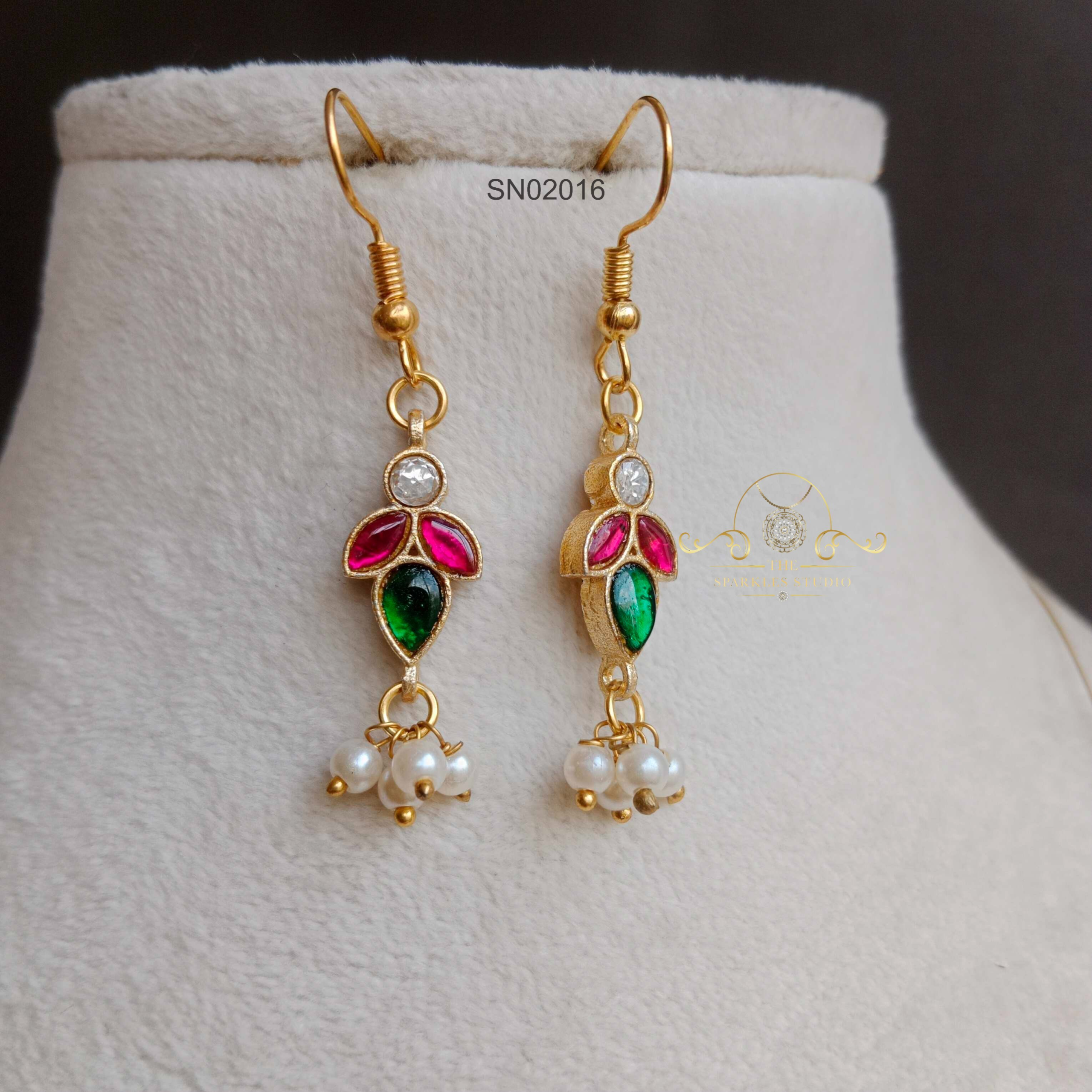 Adorn yourself with the regal charm of Elephant Studs featuring Emerald and White Stone Hanging with Pearl Drops. These intricately designed earrings combine the symbolism of elephants with the richness of emerald and white stones, creating a stunning accessory.
