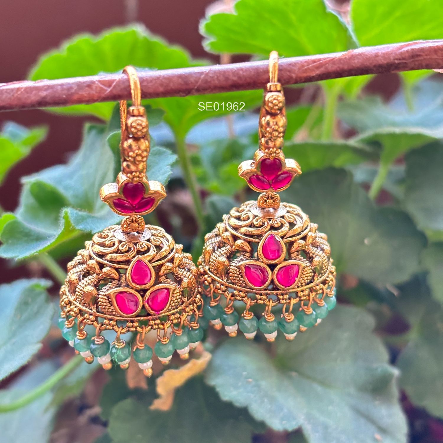 The Beautiful Dual Leaf Peacock Jhumki is a stunning pair of earrings that combines nature-inspired elements with traditional design. These jhumkis likely feature dual leaf motifs along with peacock-inspired detailing.