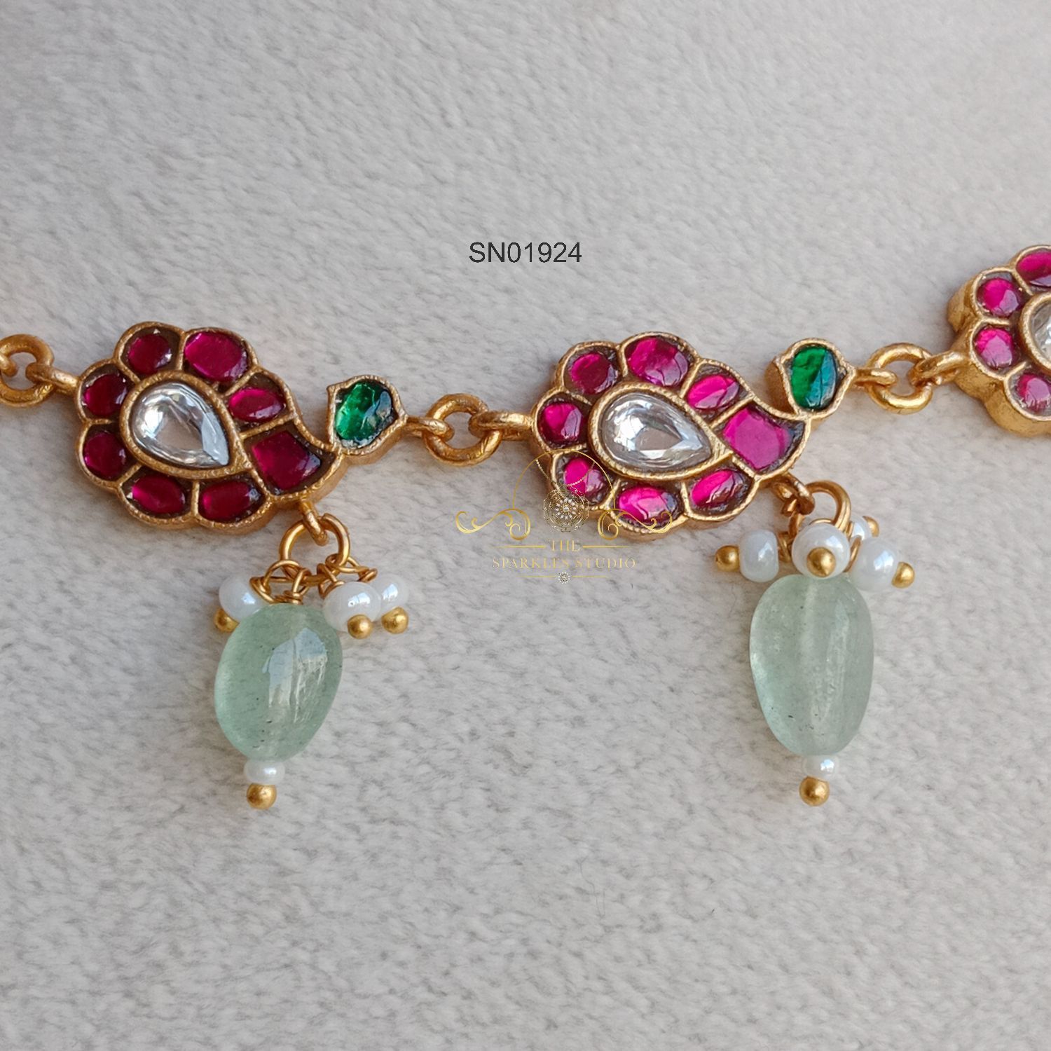 A stunning Jadau Mango Necklace featuring ornate mango motifs, rich kundan detailing, and vibrant stones. Perfect for traditional celebrations, it adds regal charm, timeless elegance, and exquisite handcrafted beauty to any ethnic look.
