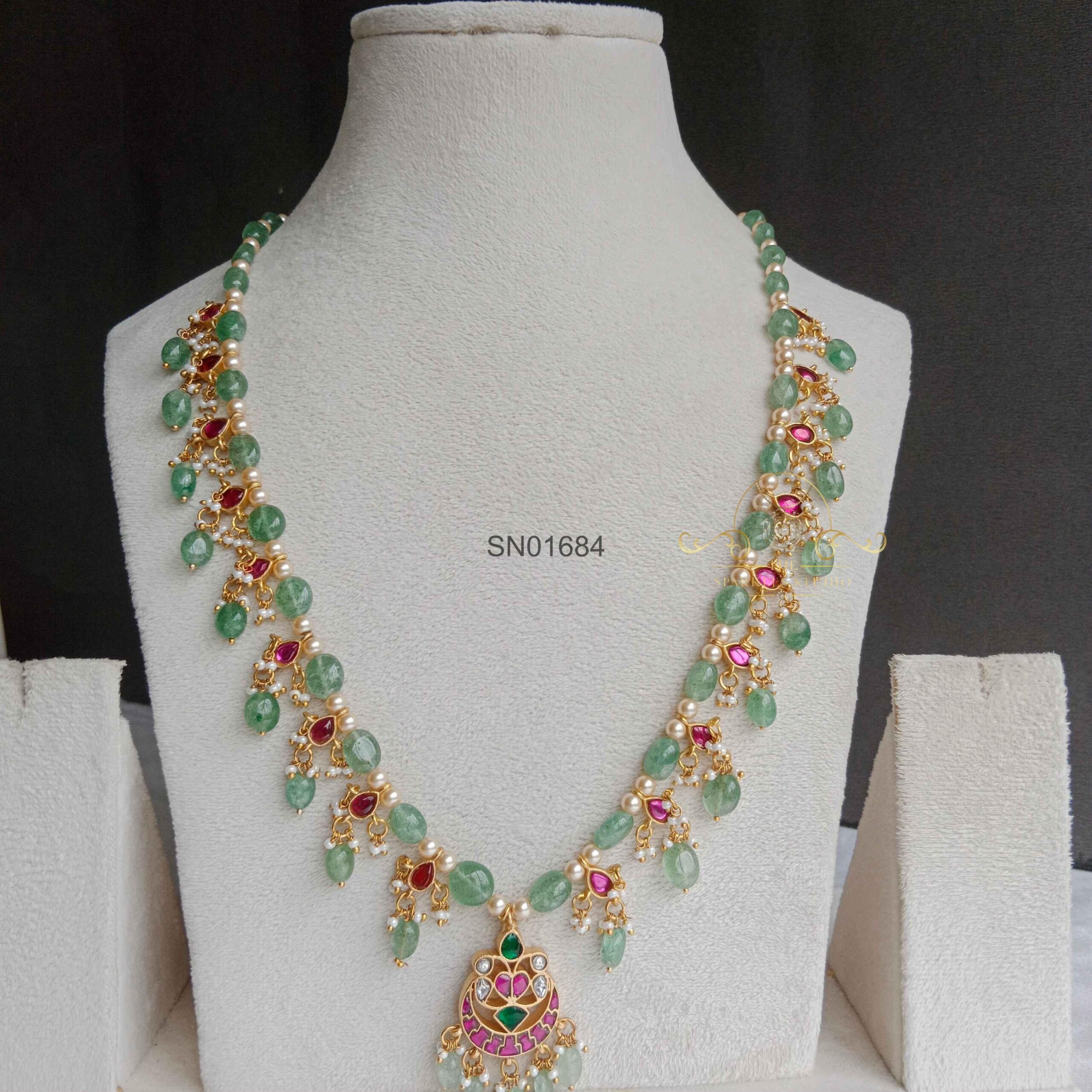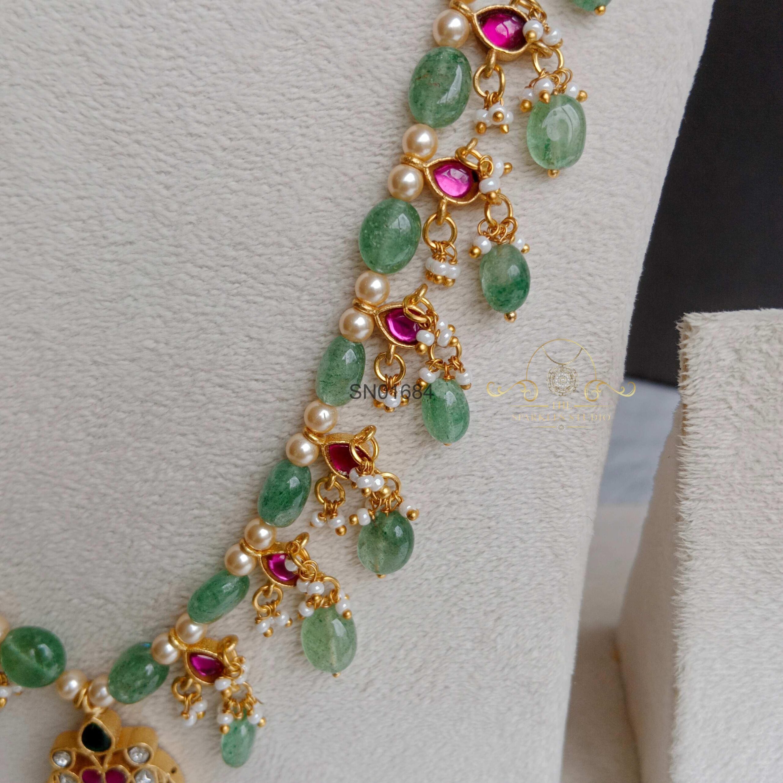 This Jadau necklace adorned with aventurine beads exudes royal elegance. The intricate detailing and soothing green hues make it a perfect choice for weddings, festive celebrations, and timeless traditional styling.