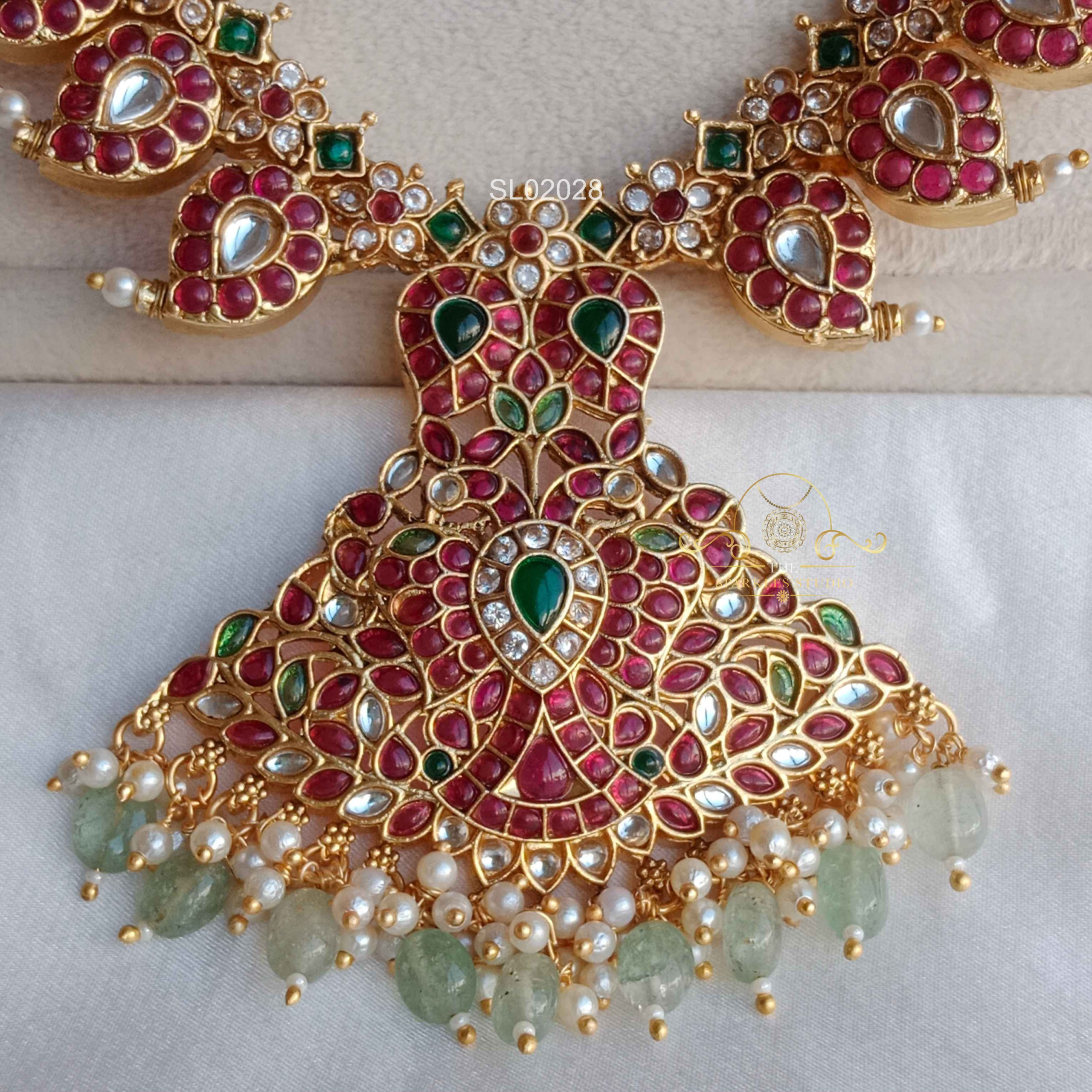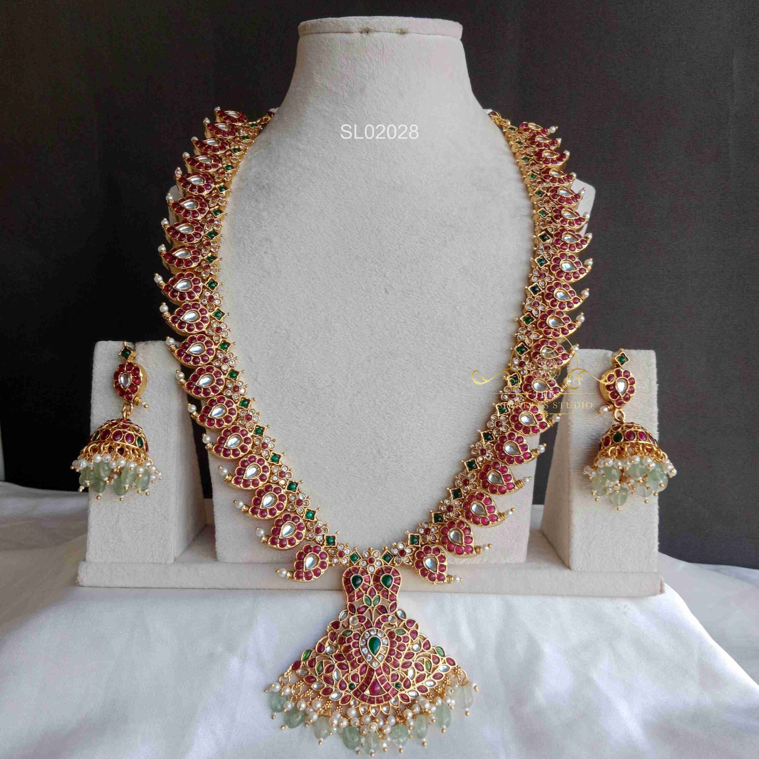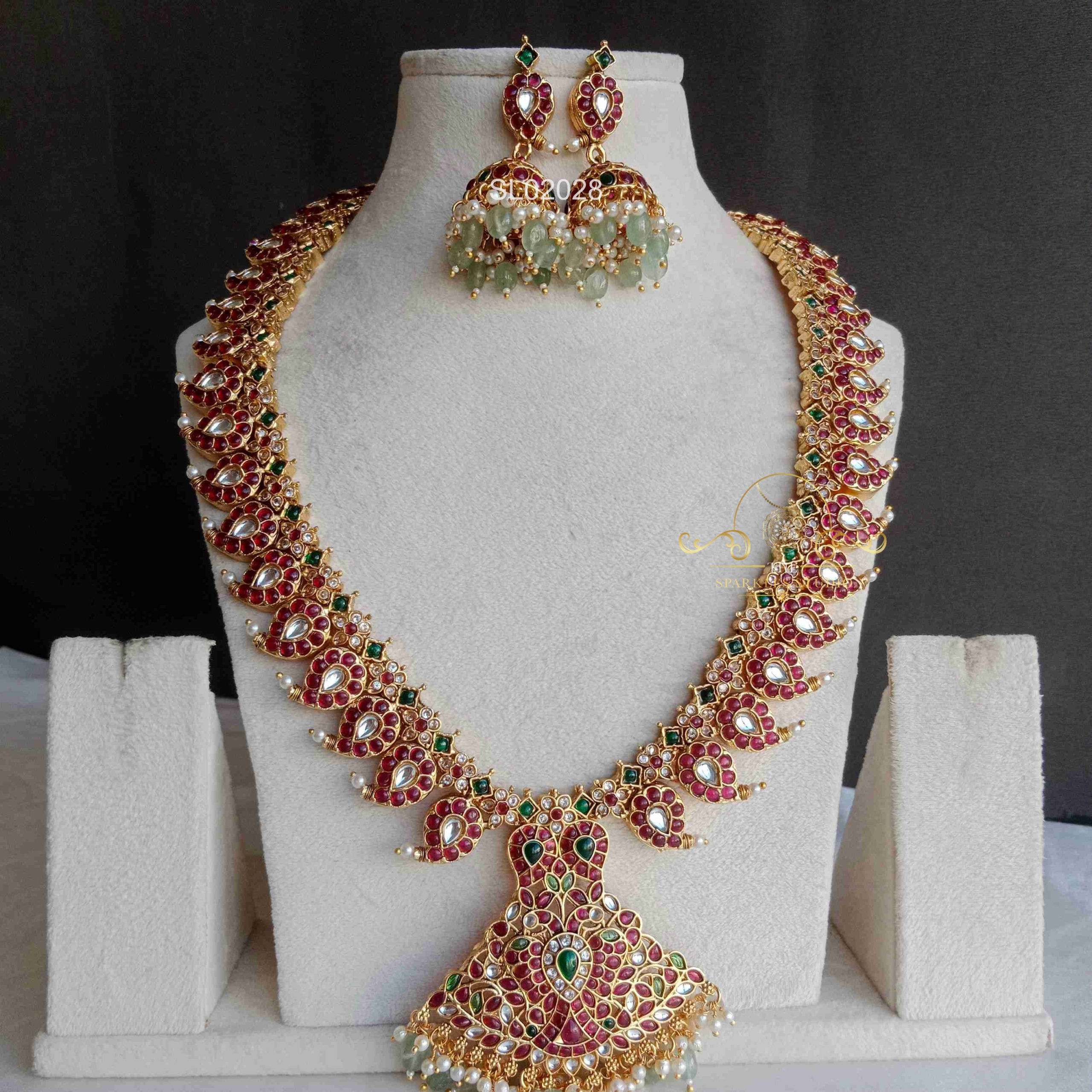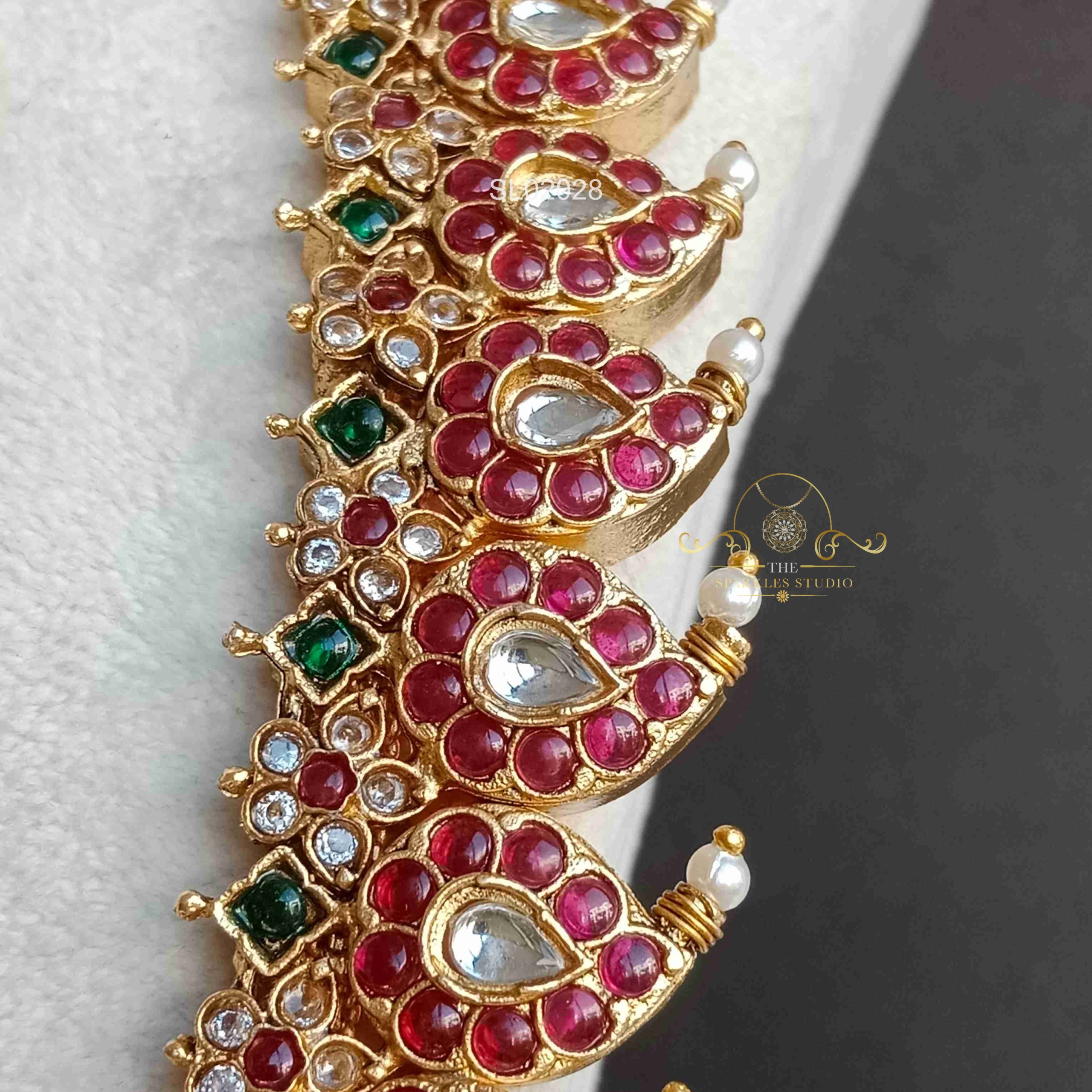 Kemp Mango Long Haram features traditional mango motifs adorned with rich kemp stones in a graceful long design. Classic and festive, this elegant haram adds timeless South Indian charm to bridal and special occasions.