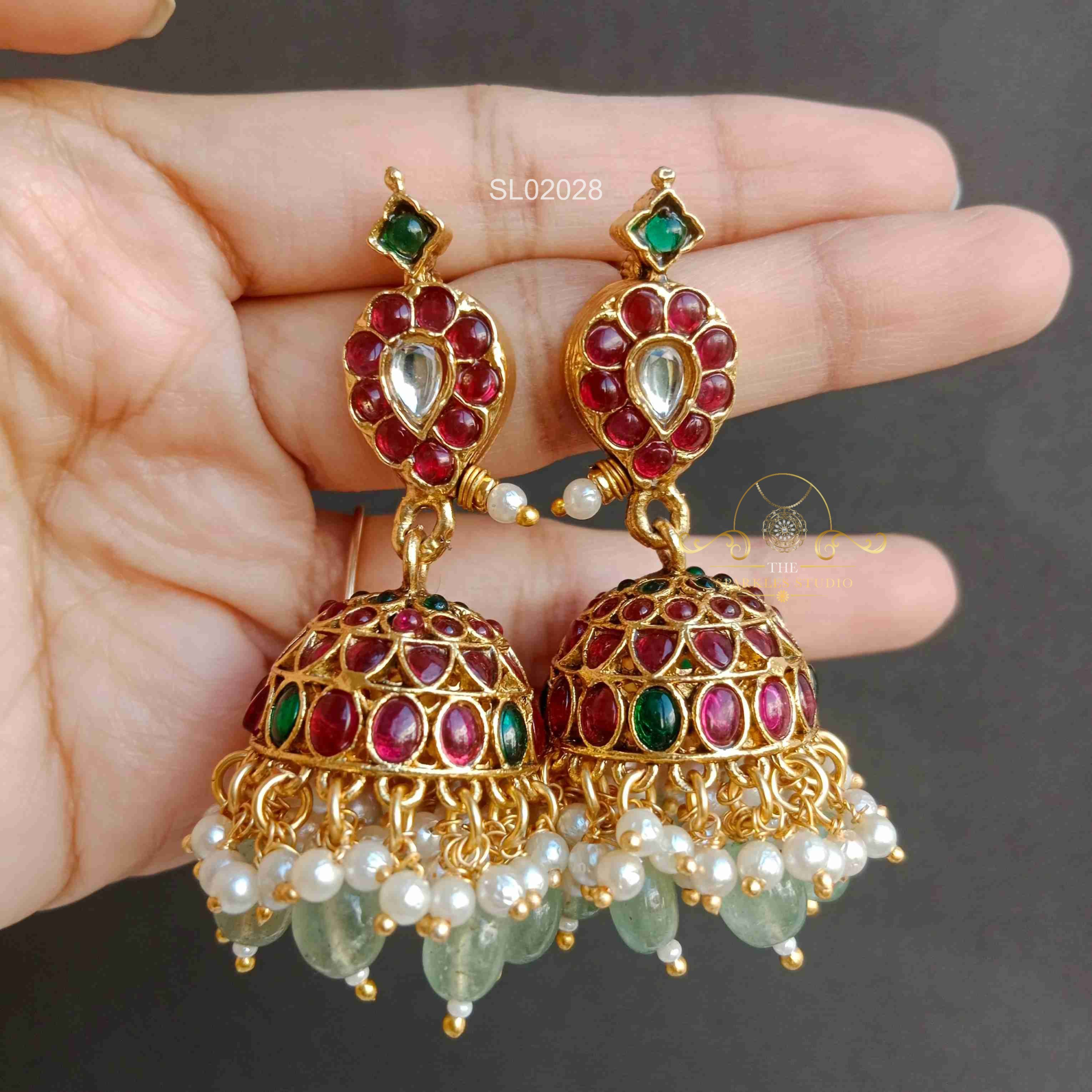 Green Stone Lakshmi Jhumkis are traditional Indian earrings inspired by the Hindu goddess Lakshmi. These jhumkis typically feature intricate designs with green stones, often emerald or other green gemstones, representing prosperity and wealth.