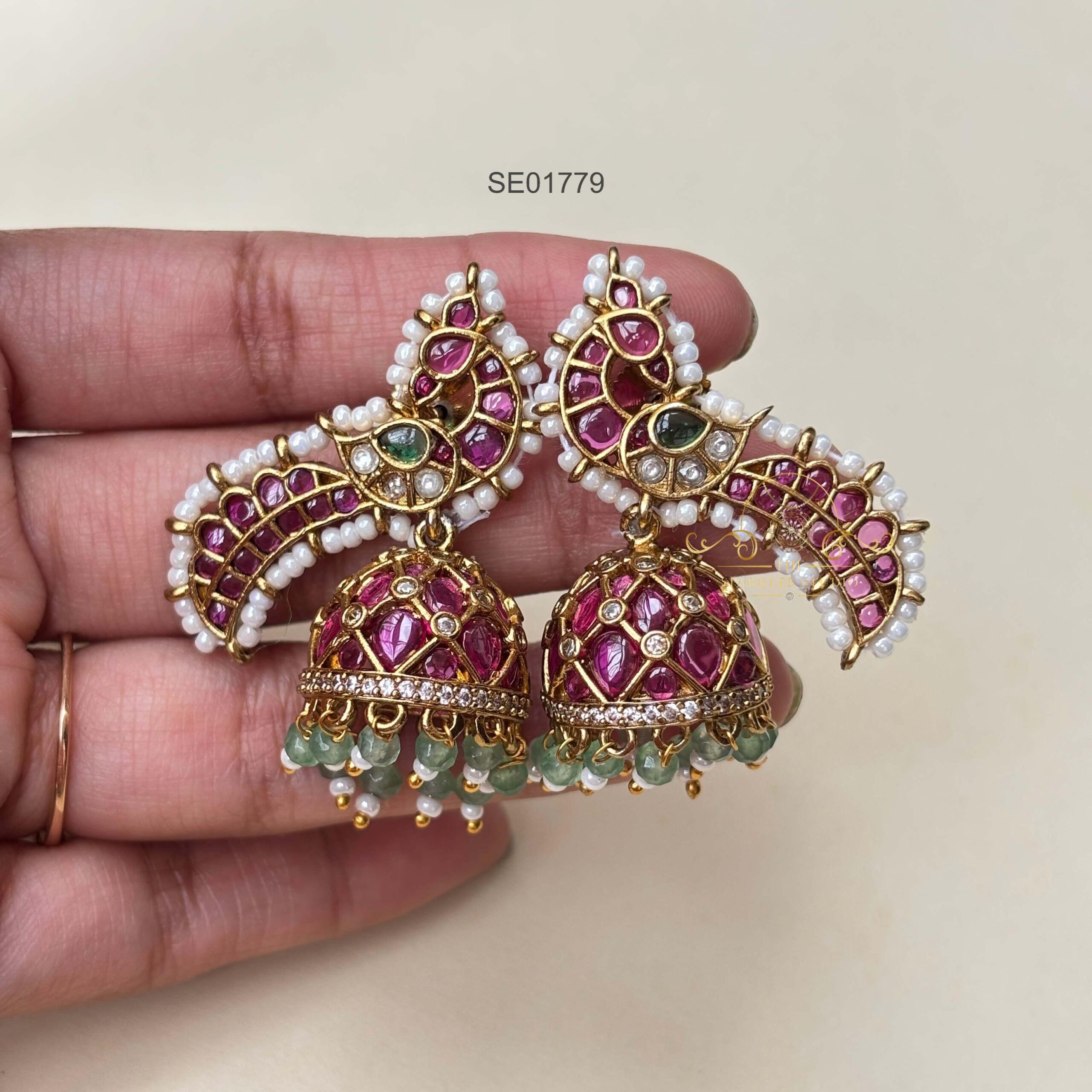 These Kemp Peacock Earrings with Pearl Border showcase vibrant kemp stones set in a regal peacock design. The delicate pearl edging adds elegance, making them a stunning pick for traditional attire and festive occasions.