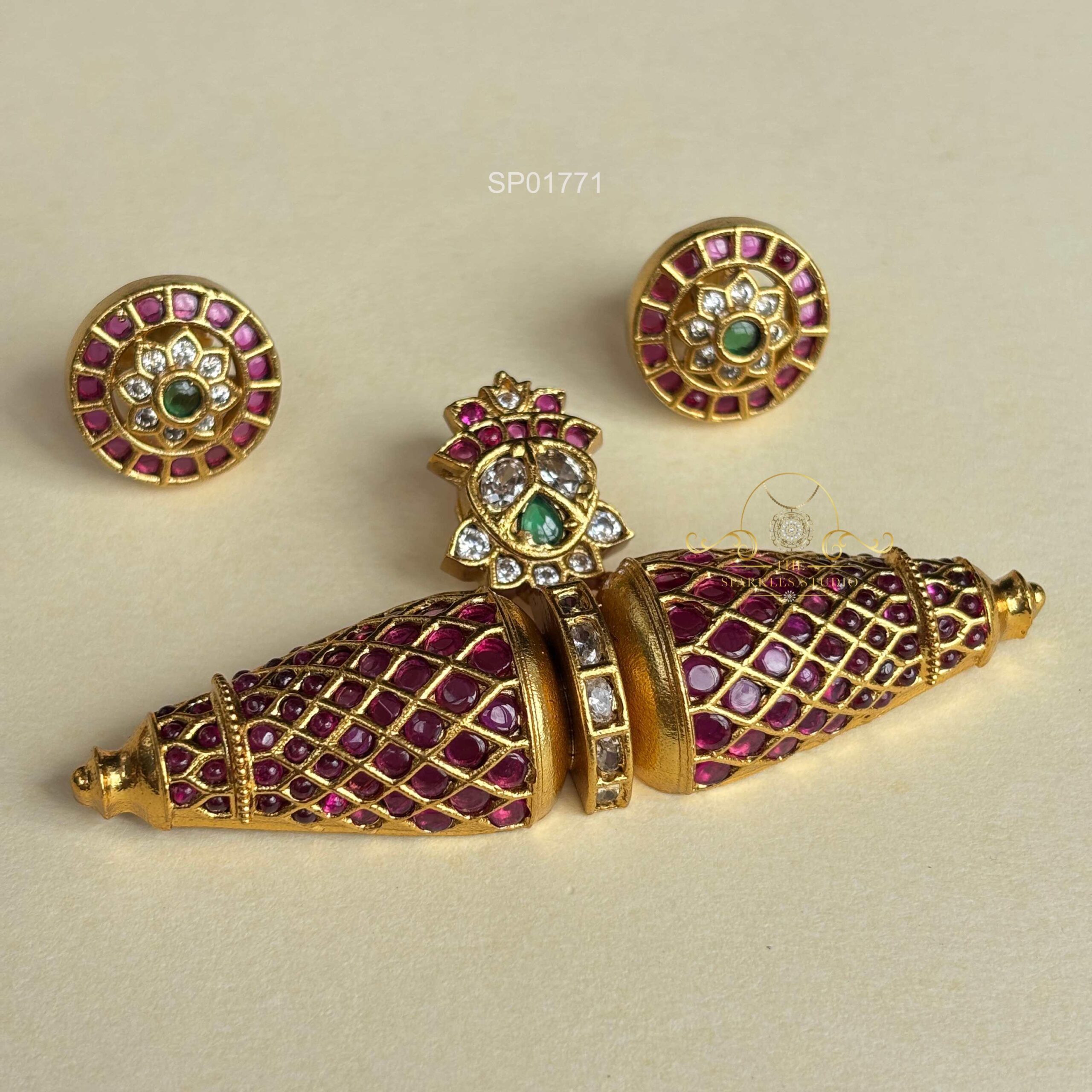 Elegant Kemp Stone Pendant featuring vibrant red stones and traditional craftsmanship. Perfect for festive occasions, it pairs beautifully with silk sarees and lehengas, adding timeless ethnic charm to your jewellery collection.