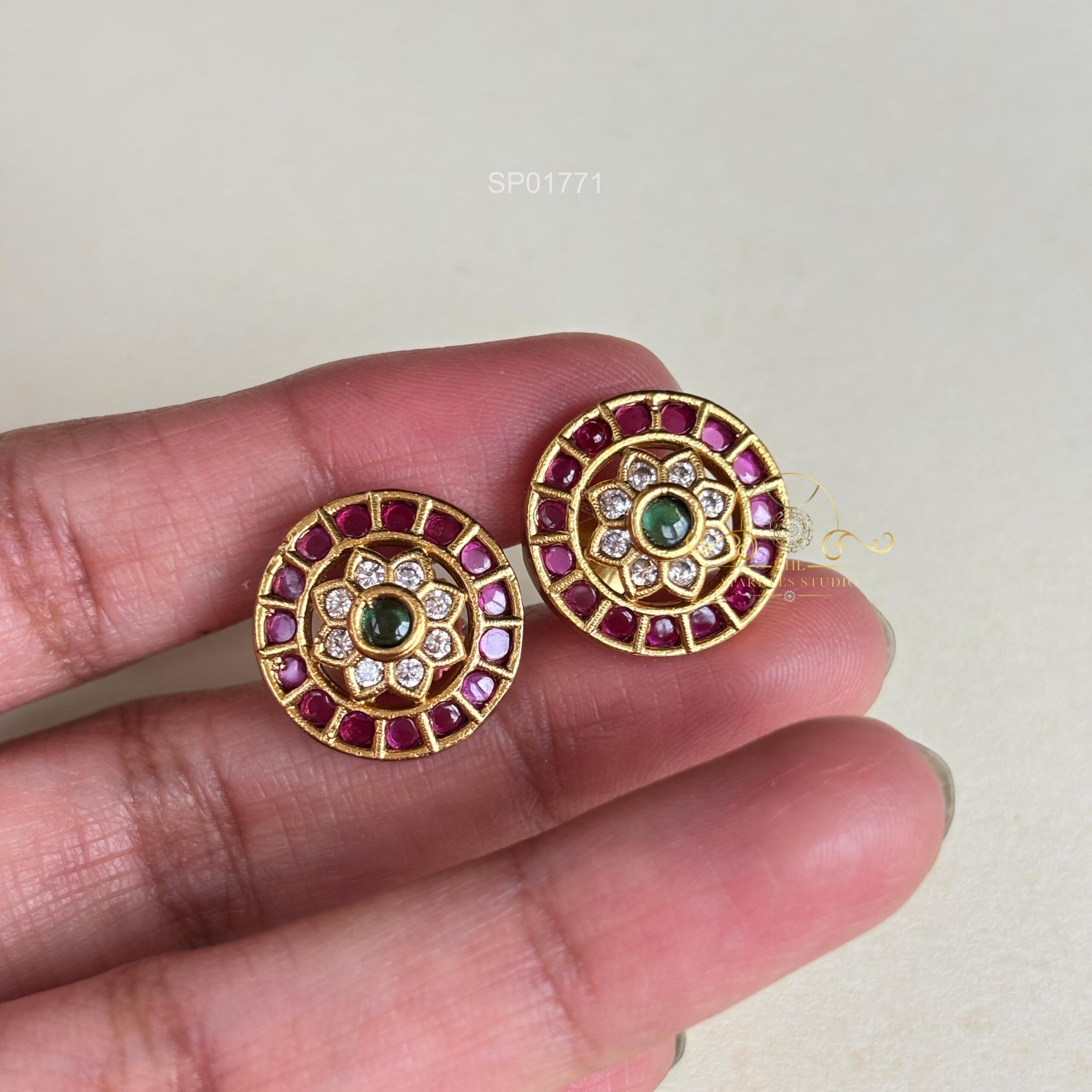 Dazzling Balis with Round Stud On Top are glamorous hoop earrings that feature a dazzling design. The earrings showcase intricate details, and a round stud sits elegantly on top, adding a touch of sophistication.