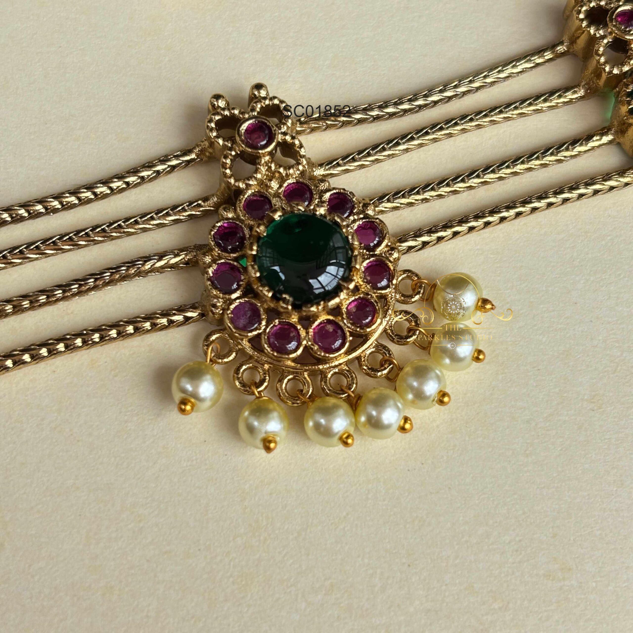 Kerala style choker featuring traditional gold tones, intricate motifs, and elegant temple-inspired detailing. Perfect for pairing with kasavu sarees, wedding looks, and festive celebrations, adding graceful South Indian heritage charm.