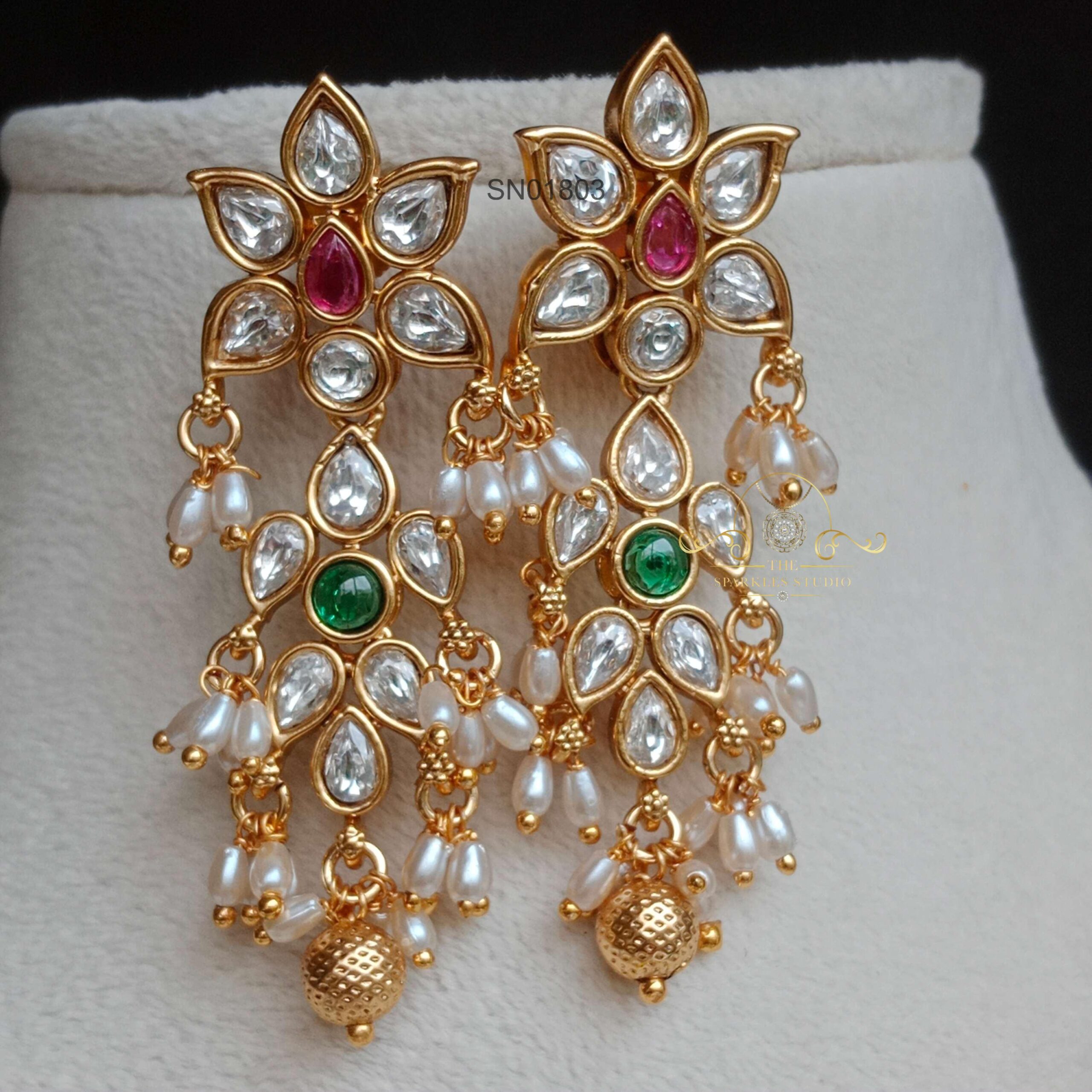Long Chandbali Kundan Stone Statement Earrings are an exquisite and striking pair of earrings. These earrings feature a long Chandbali design, a traditional crescent-shaped style with Kundan stones, which are highly refined gold stones often set with gemstones.